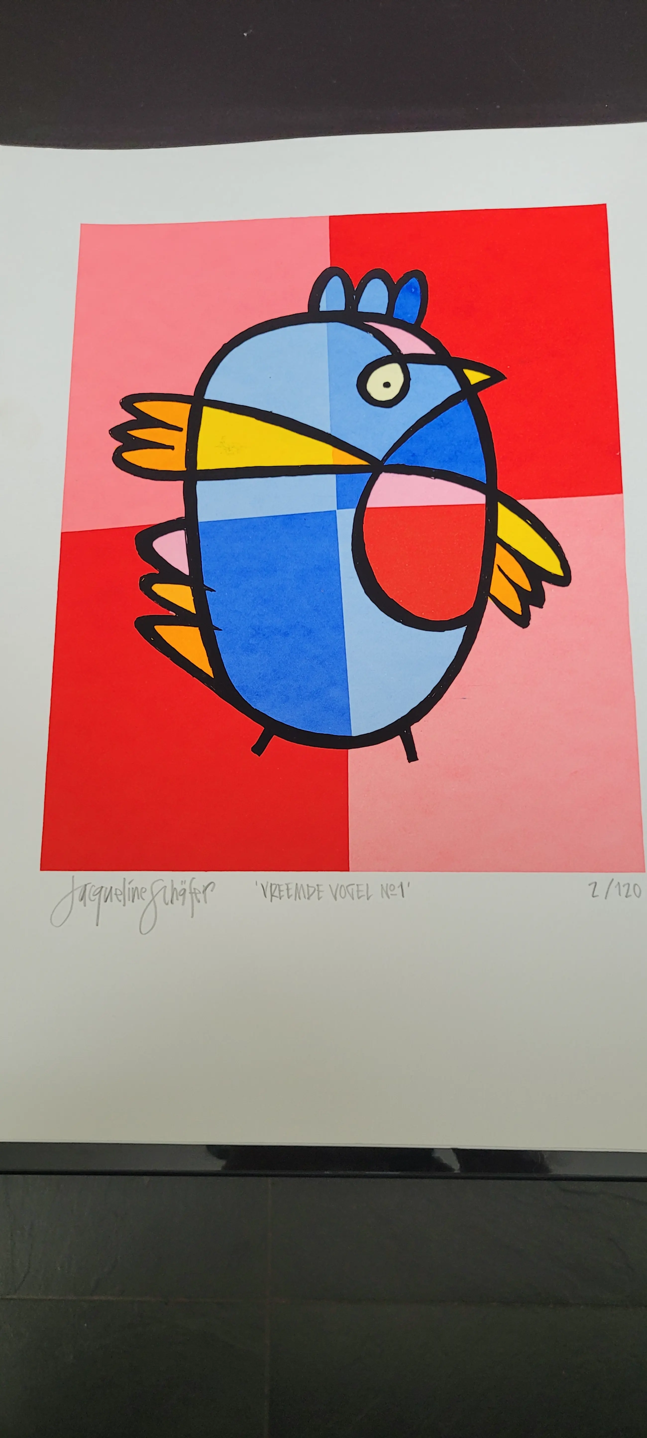 Vrolijk, grappig werk van Jacqueline Schäfer uit haar 'gekke vogel' serie.