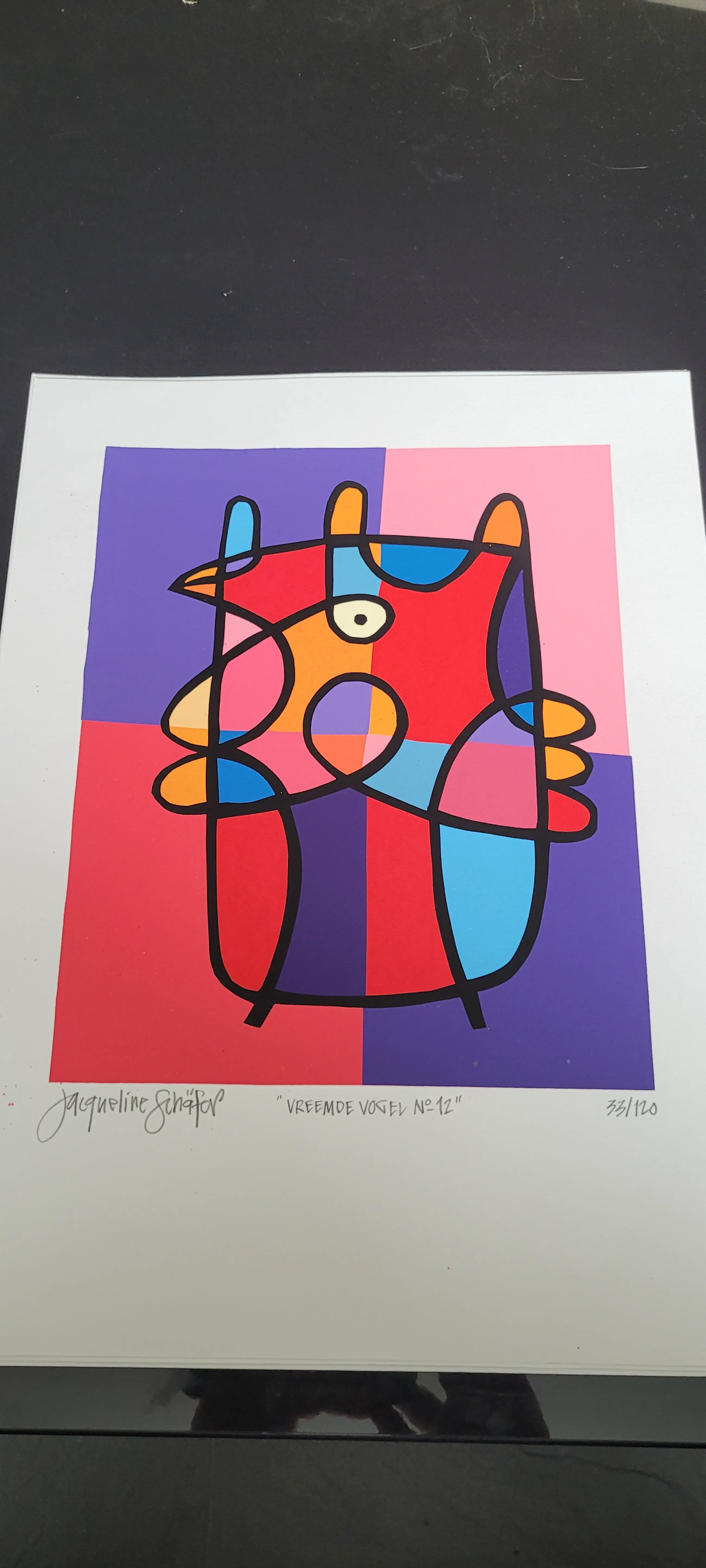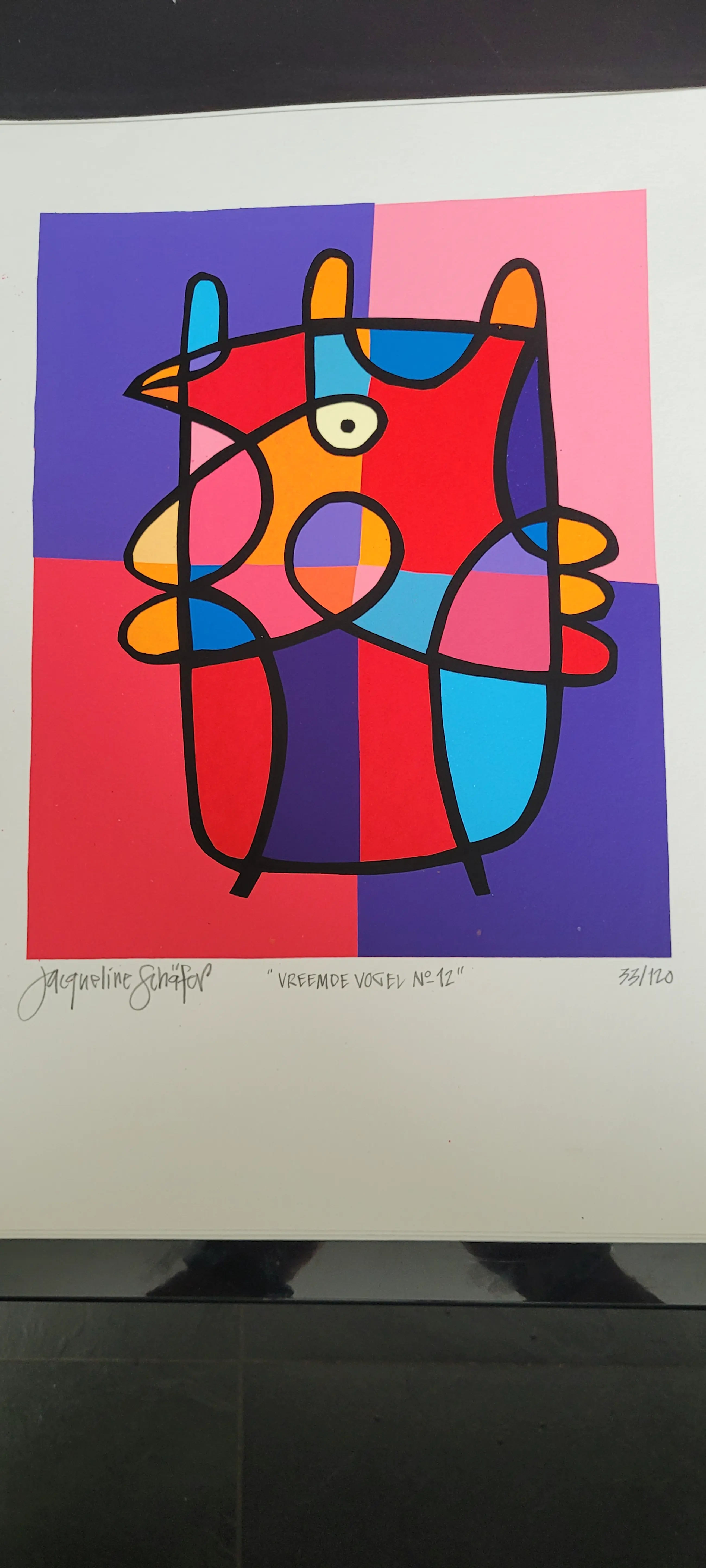Vrolijk, grappig werk van Jacqueline Schäfer uit haar 'vreemde vogel' serie.