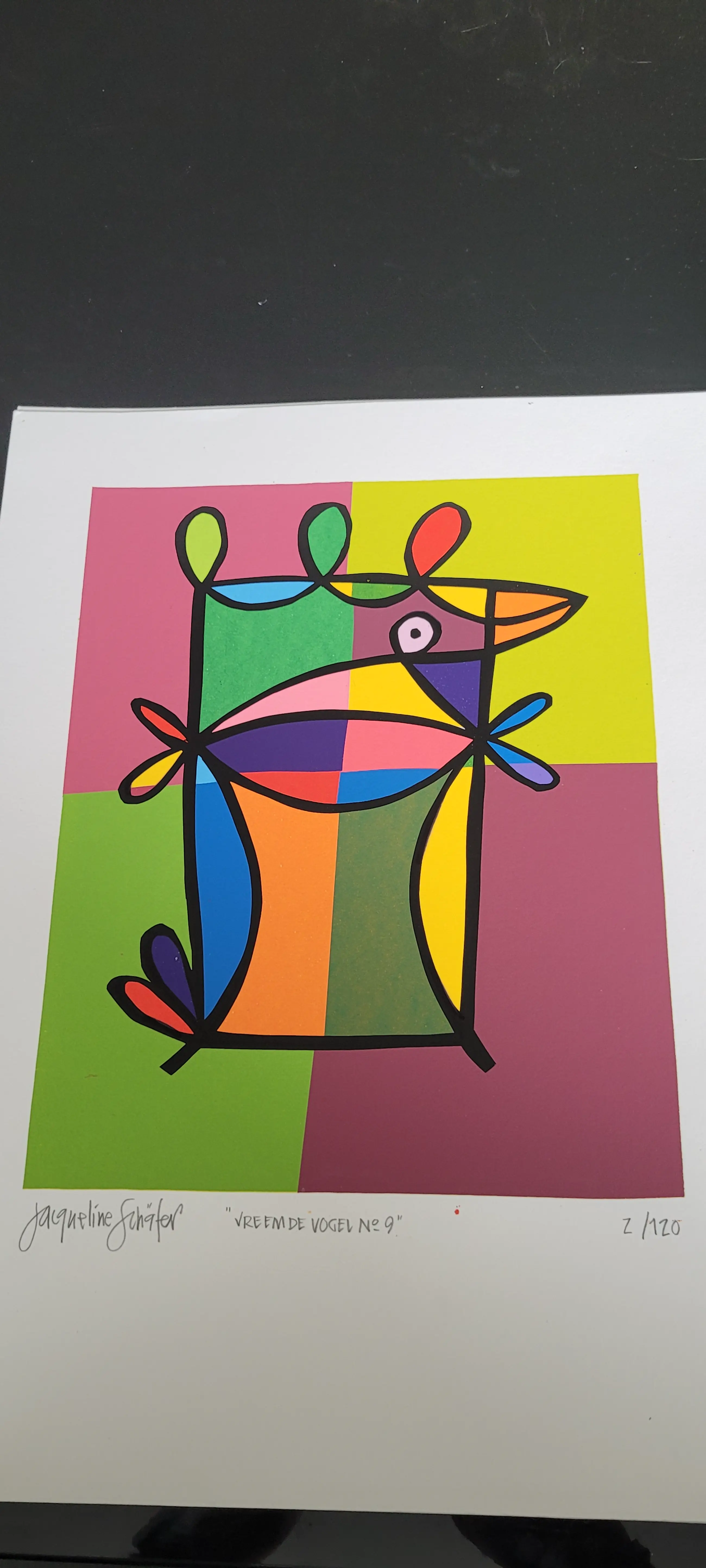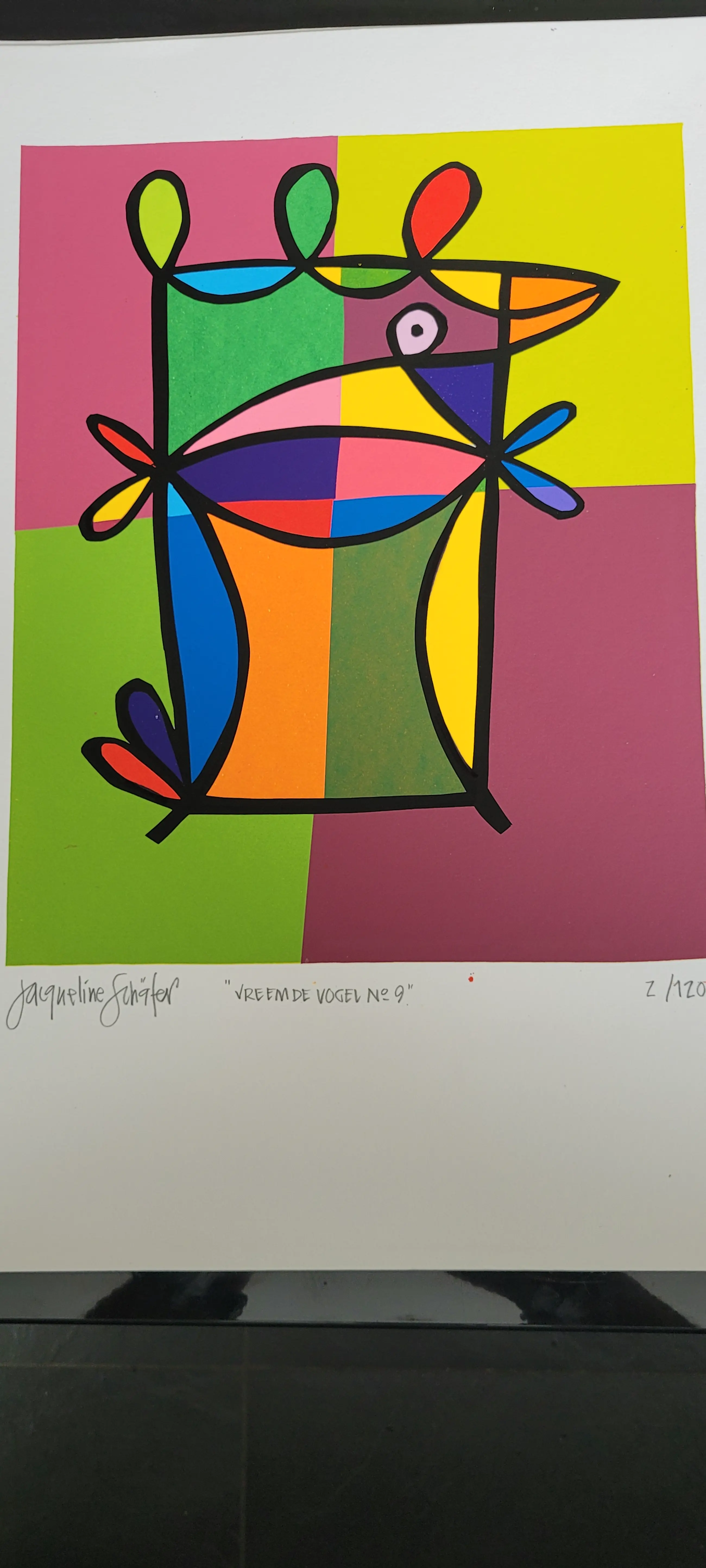 Vrolijk, grappig werk van Jacqueline Schäfer uit haar 'vreemde vogel' serie.