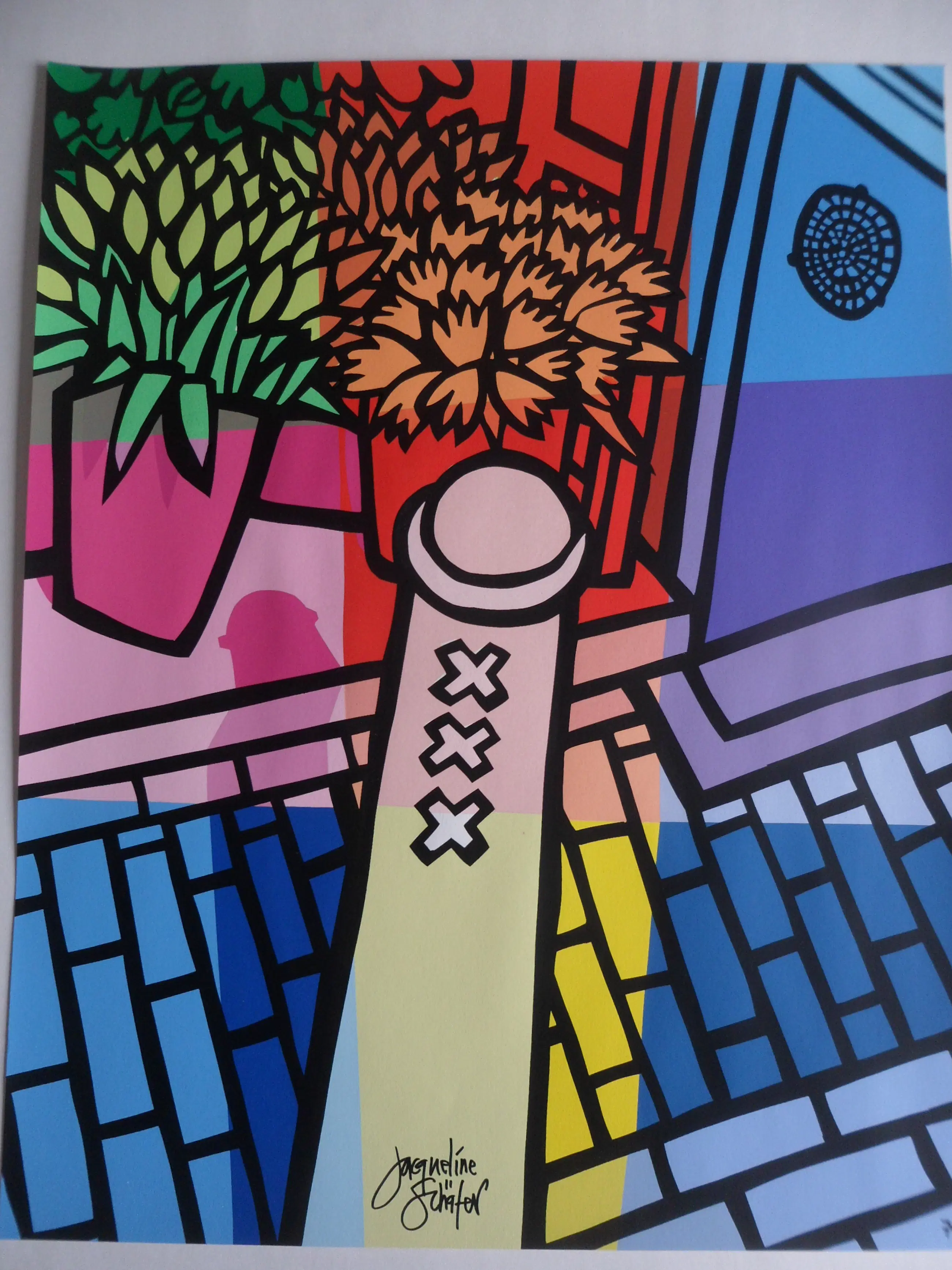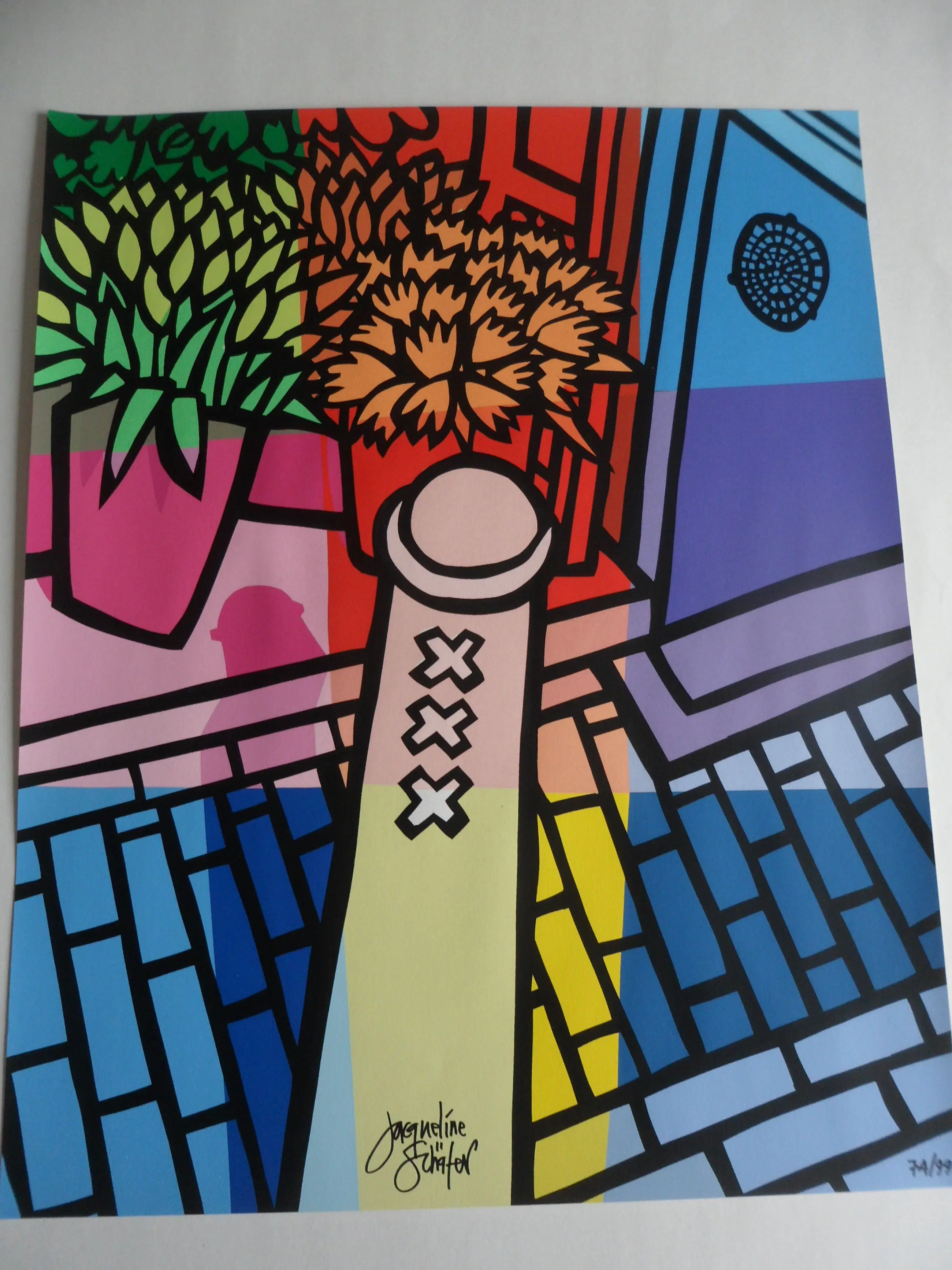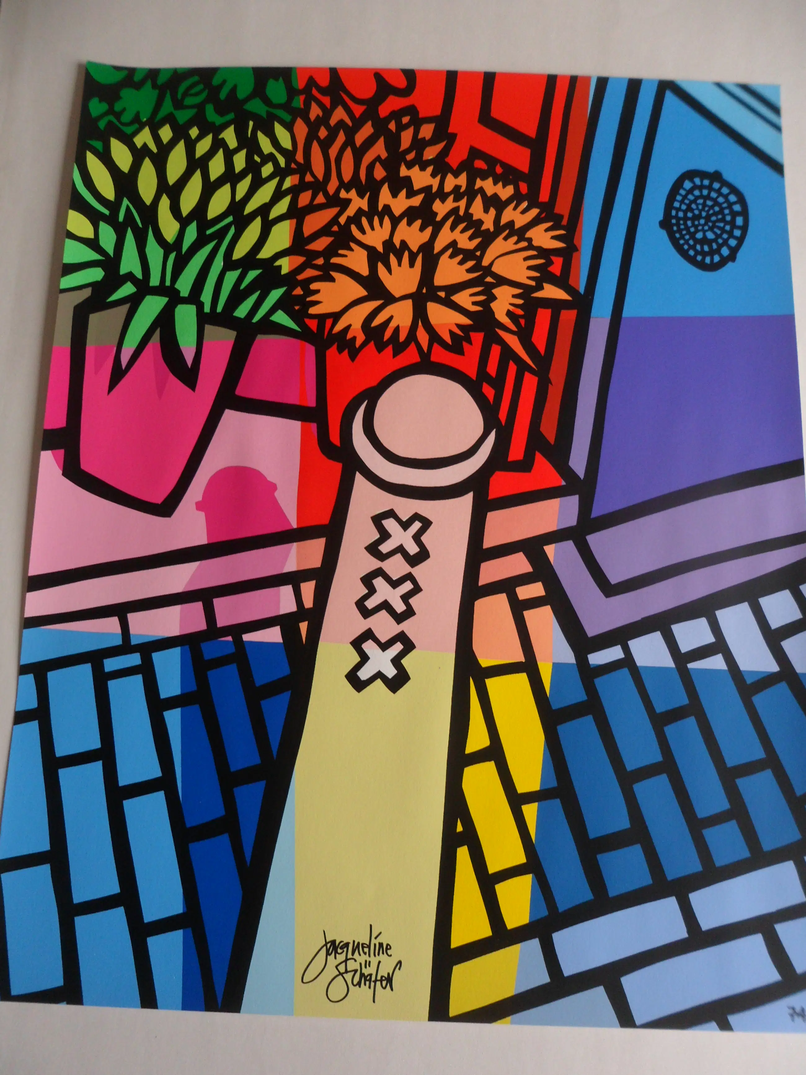 Kleurenzeefdruk Amsterdammertje Handgesigneerd, Oplage kan anders zijn als de foto. Jacqueline Schäfer woont en werkt in Amsterdam. Tijdens haar studie ging ze op zoek naar een vormentaal die bij haar paste. Ze vond er haar eigen stijl en ontwikkelde die door de jaren heen. Door het spel van duidelijke vormen, heldere kleuren en sterk gedefinieerde, zwarte contouren onderverdeeld in harmonieuze kleurvlakken is haar werk nu zeer herkenbaar. Sinds 2004 maakt de kunstenares ook beeldjes van o.a. de Vreemde Vogels. Voor haar is dit een nieuwe artistieke uitdaging. Uit al haar werk spreekt duidelijk Schäfers heldere en positieve liefde voor het leven in een complexe moderne maatschappij.