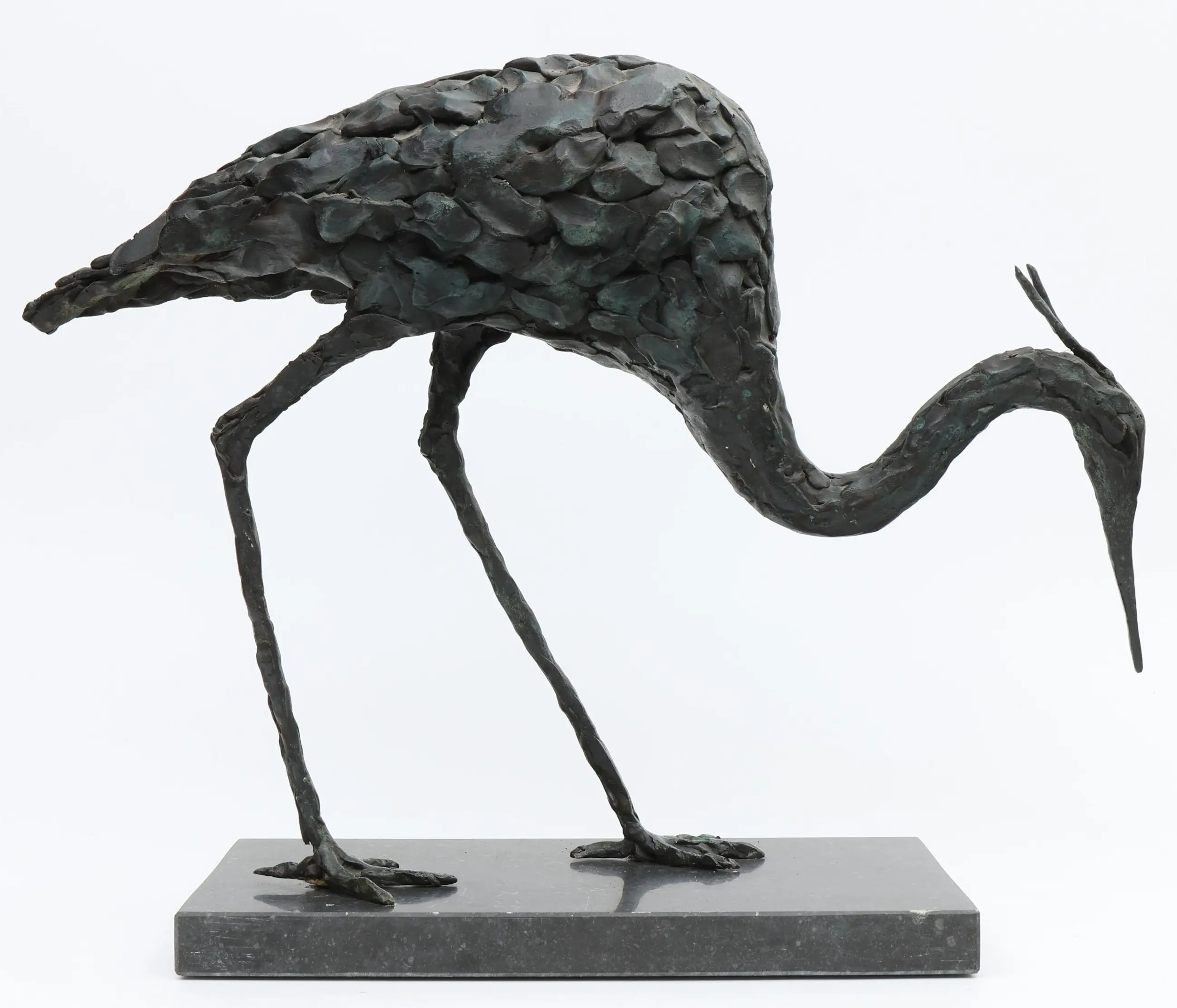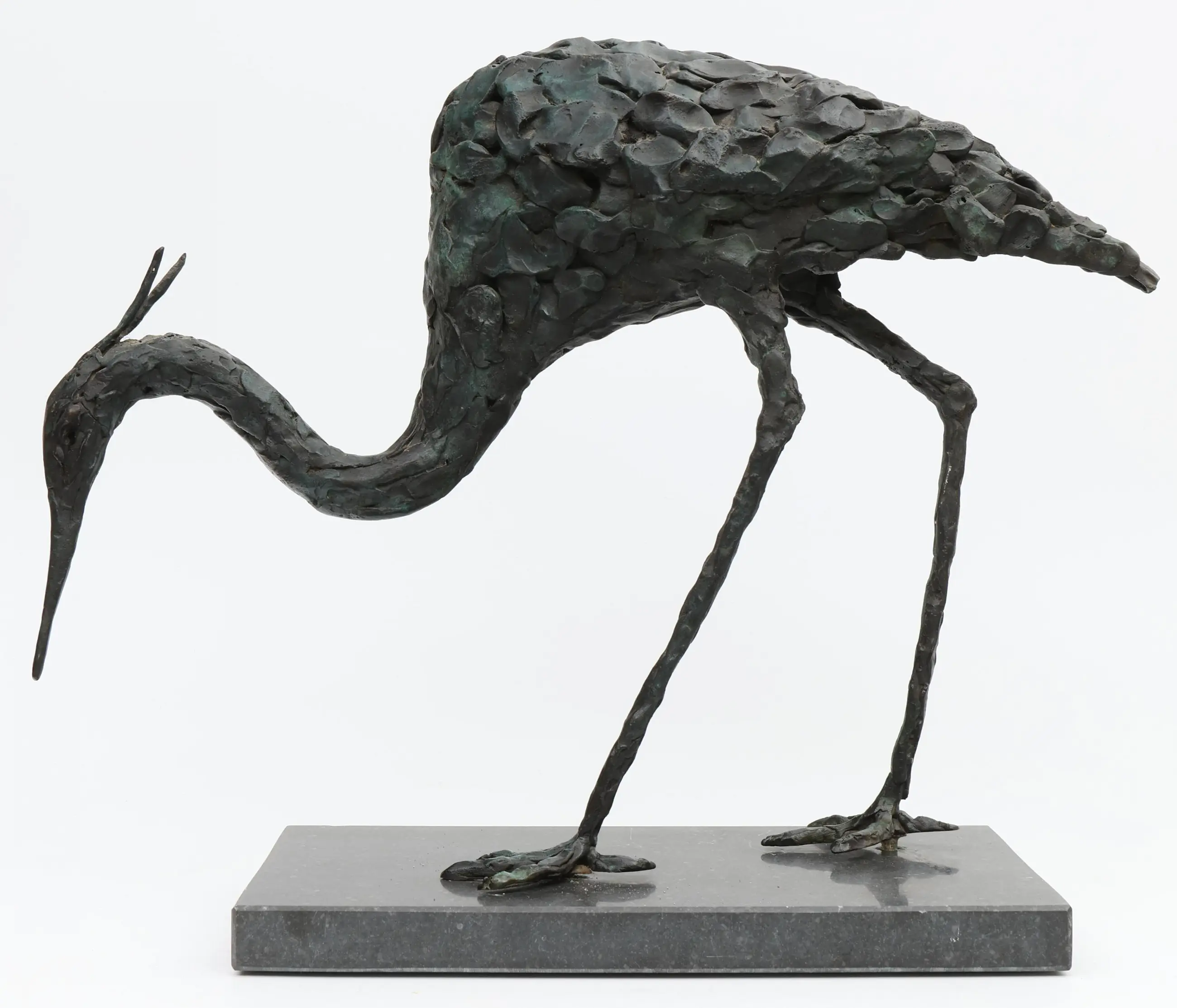Groen gepatineerd bronzen sculptuur, geplaatst op hardstenen voet, van Jacqueline van der Laan. Voorstelling van een reiger. Afmetingen beeld: H38cm x b50cm x d15cm. Het beeld is niet gesigneerd door de kunstenares.
