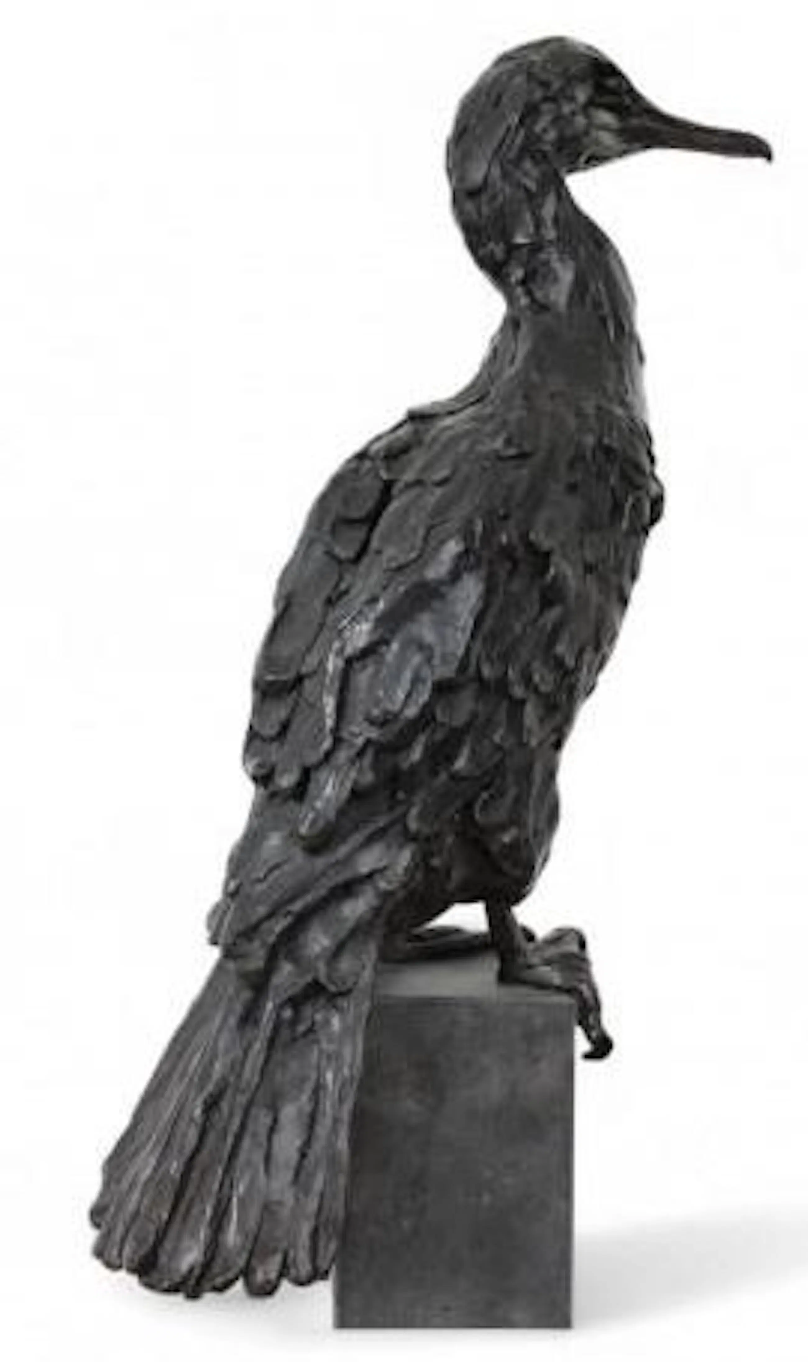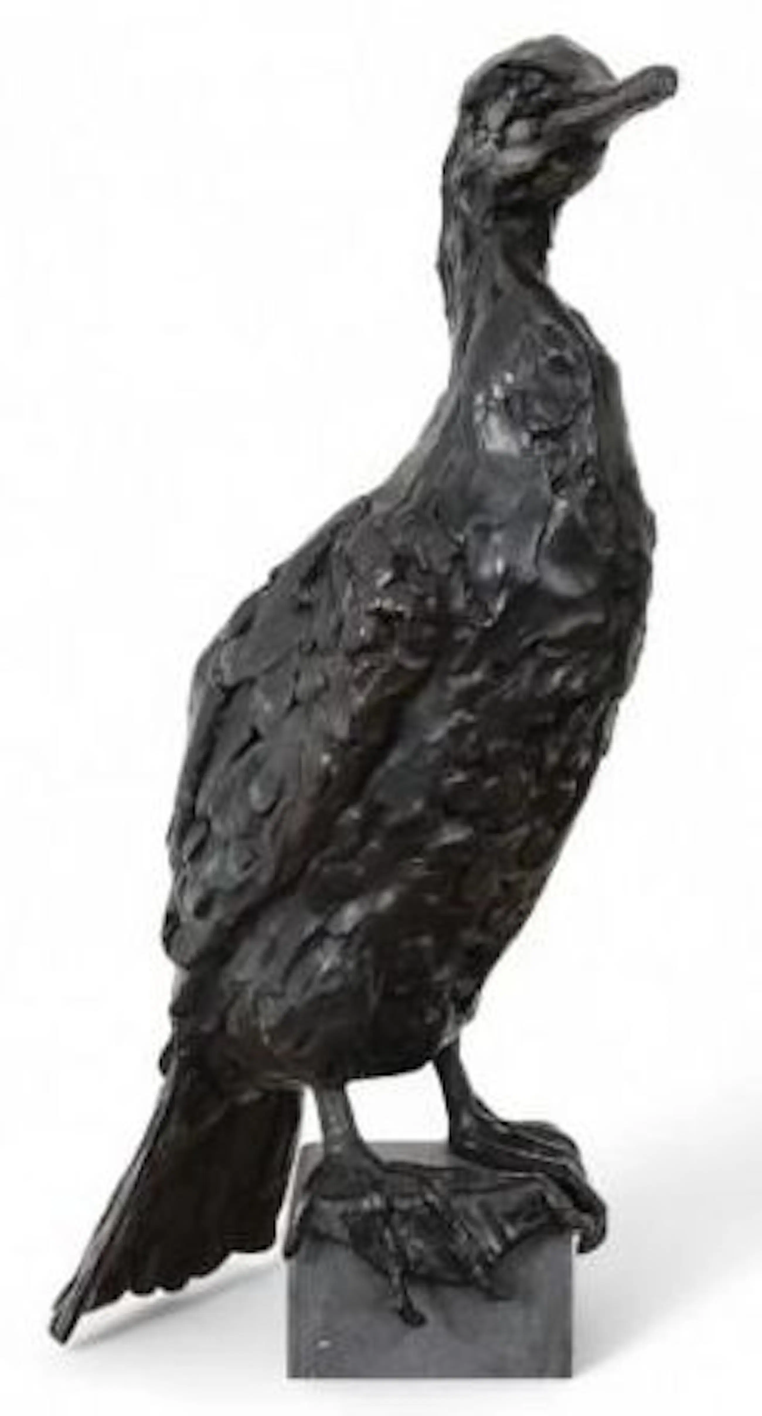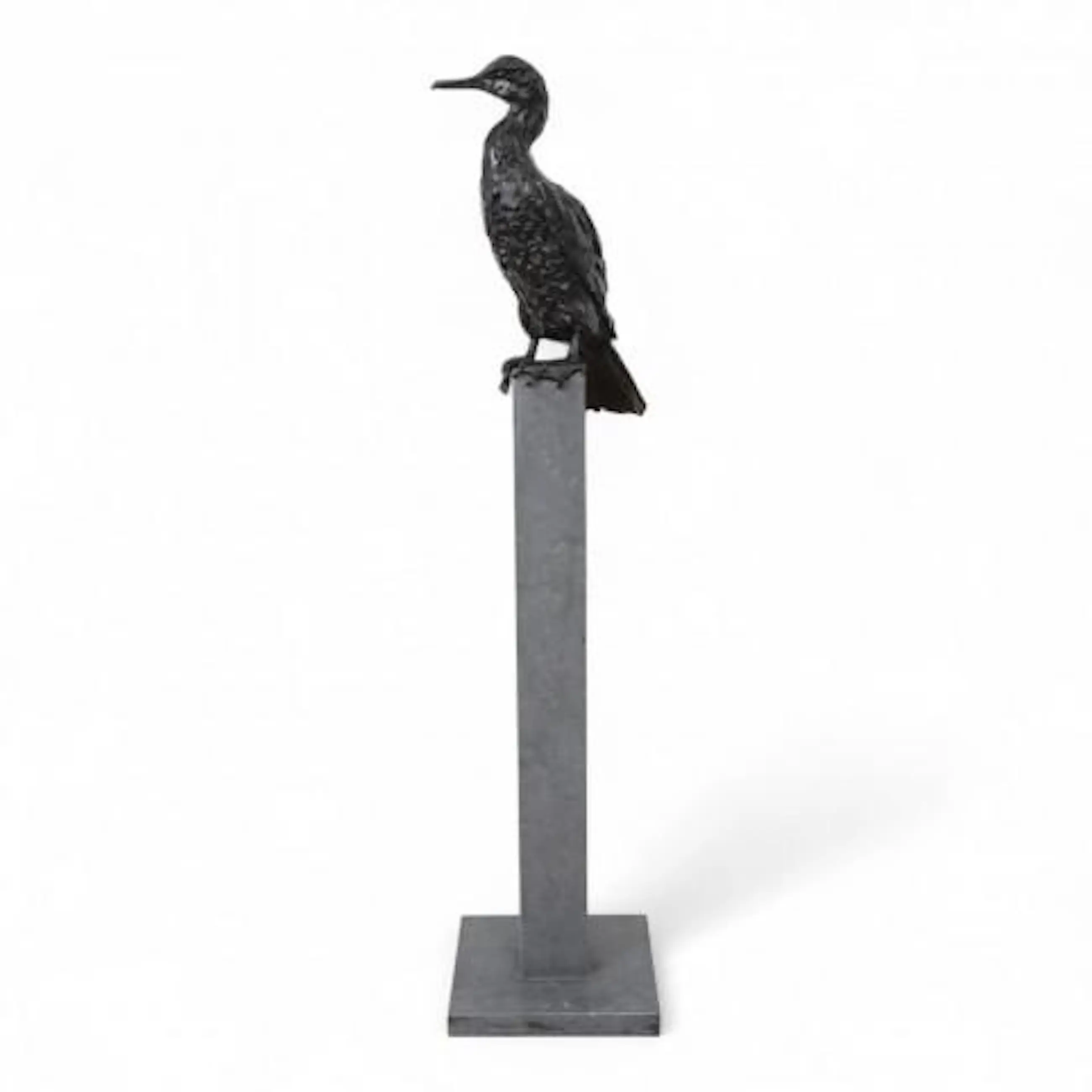Zwart gepatineerd bronzen sculptuur, geplaatst op hardstenen sokkel, van Jacqueline van der Laan. Voorstelling van een aalscholver. Afmetingen beeld: H135cm x b49cm x d15cm. Het beeld is niet gesigneerd door de kunstenares.