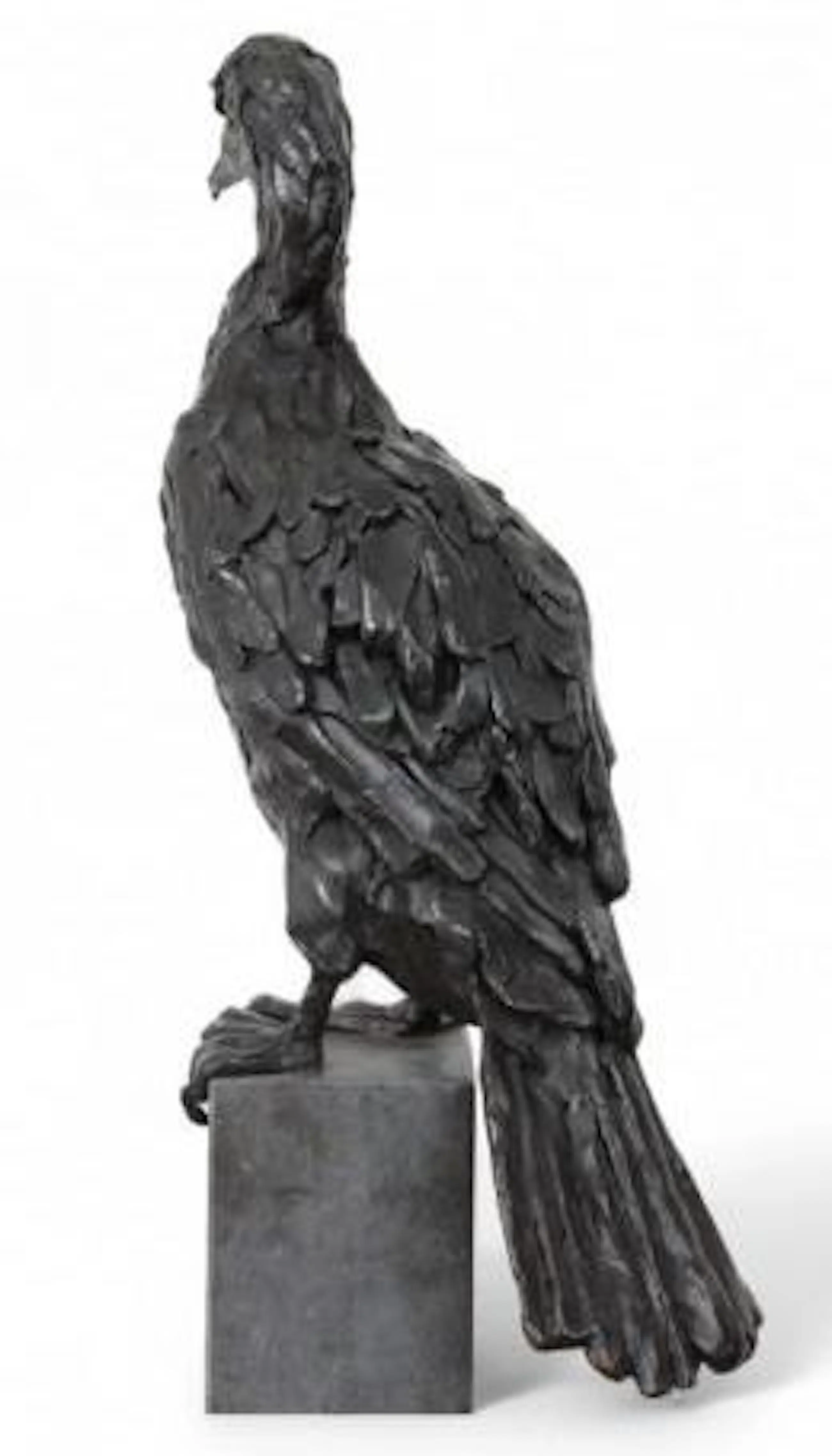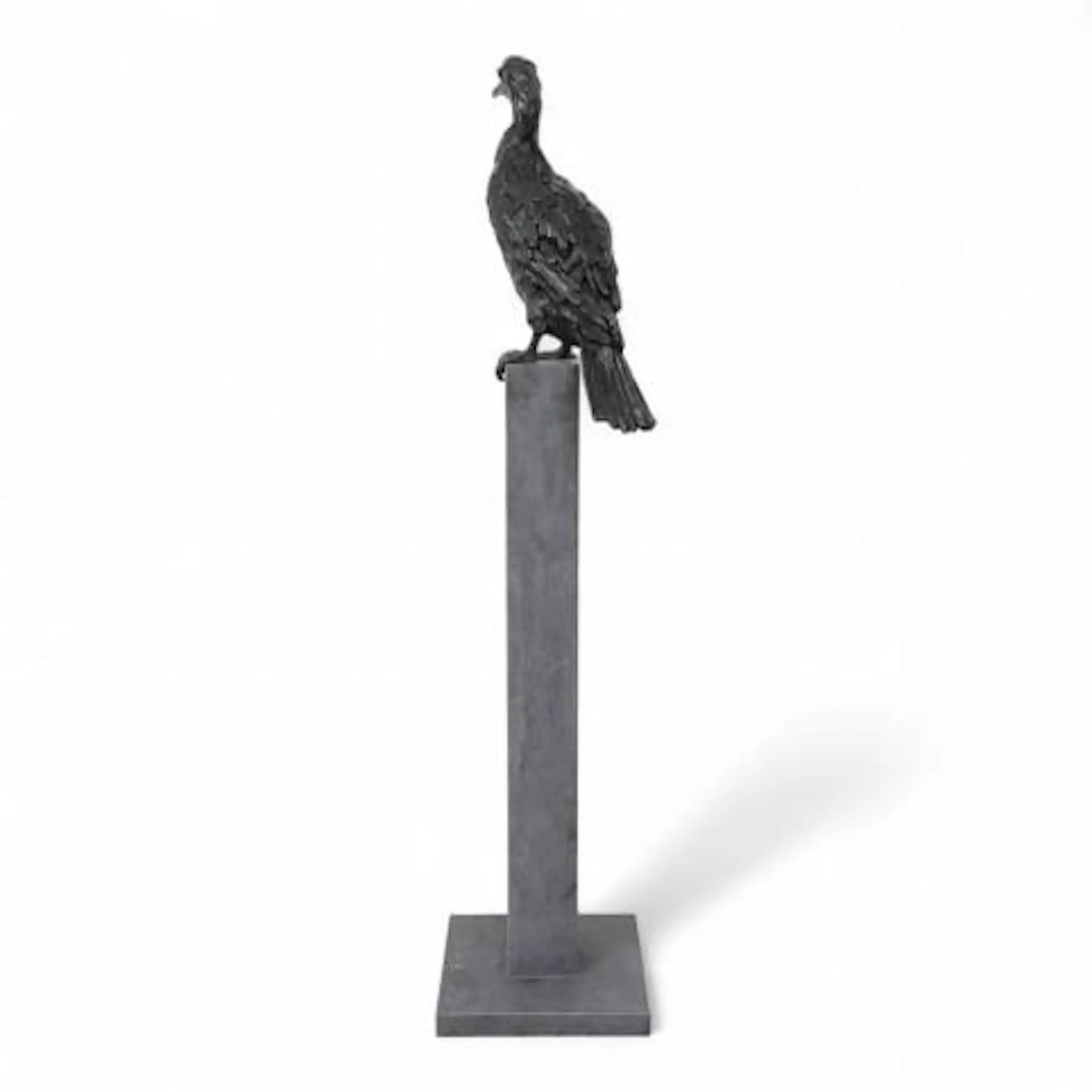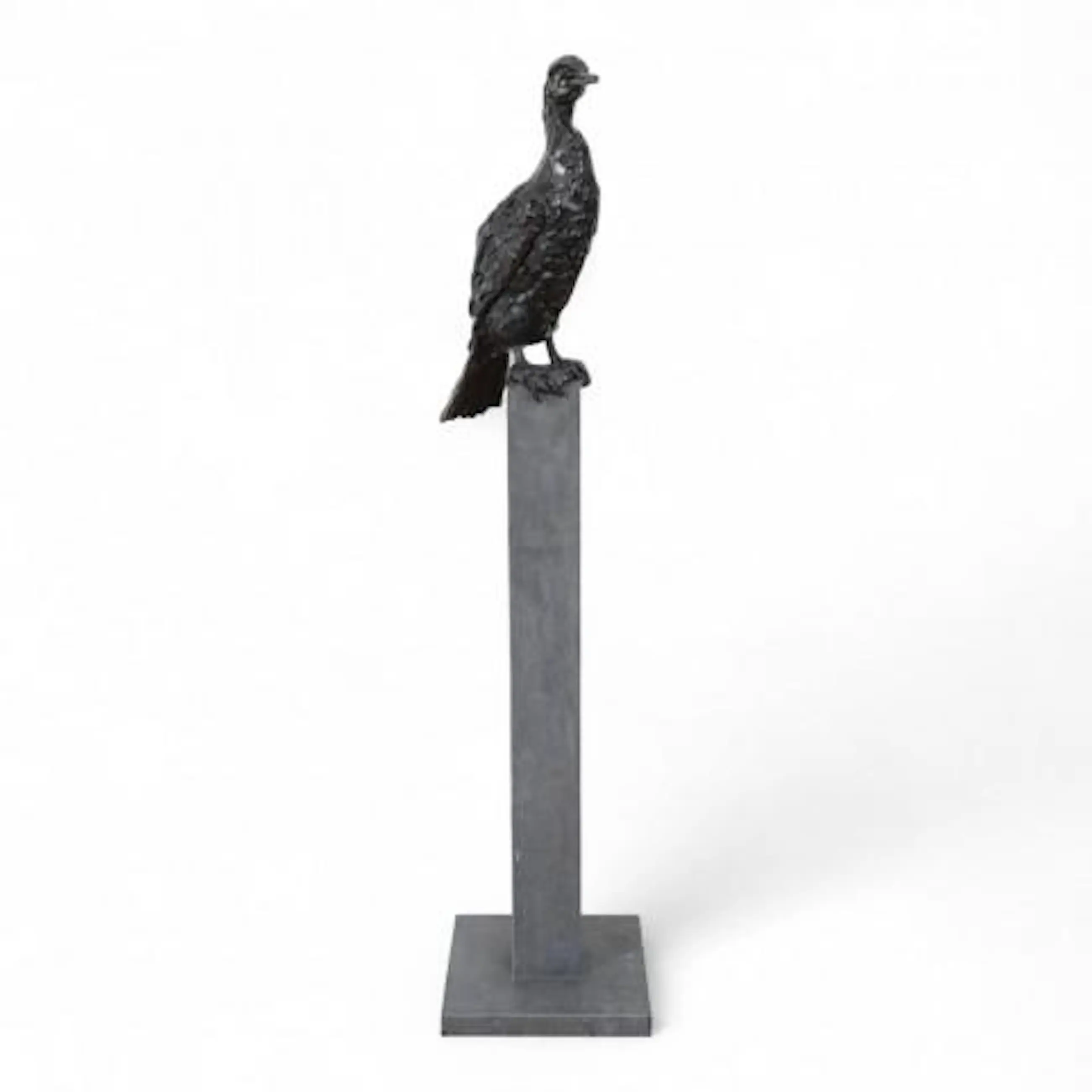 Zwart gepatineerd bronzen sculptuur, geplaatst op hardstenen sokkel, van Jacqueline van der Laan. Voorstelling van een aalscholver. Afmetingen beeld: H135cm x b49cm x d15cm. Het beeld is niet gesigneerd door de kunstenares.