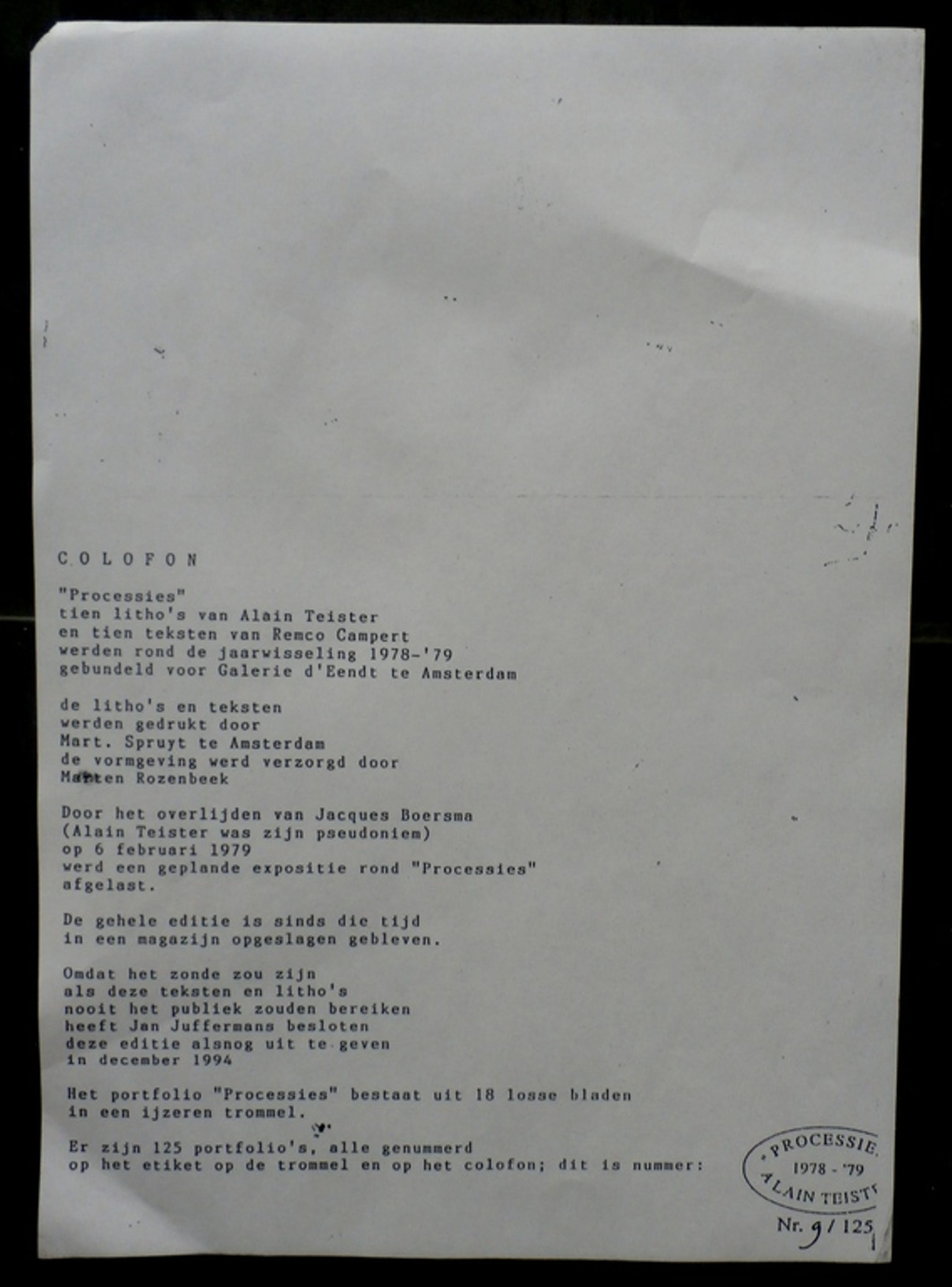 Tien litho's van Alain Teister en tien teksten van Remco Campert, in een ijzeren box, werden in het voorjaar 1971 gebundeld voor Galerie d'Eendt te Amsterdam. De litho's en teksten werden gedrukt door Mart Spruyt te Amsterdam de vormgeving werd verzorgd door Marten Rozenbeek.