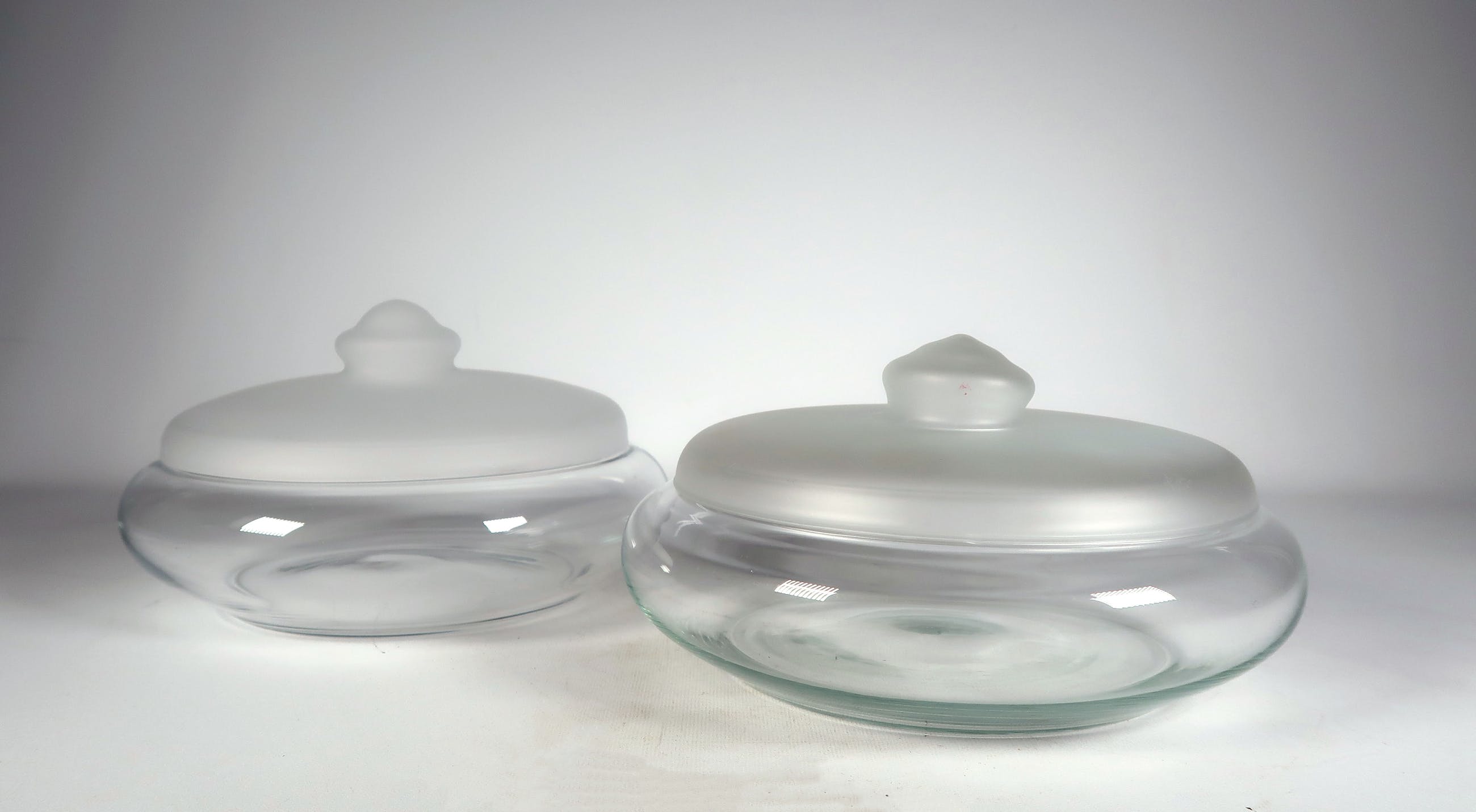 Doordat de items mondgeblazen en met de hand gemaakt zijn, verschillen de twee dozen licht in vorm en kleur.