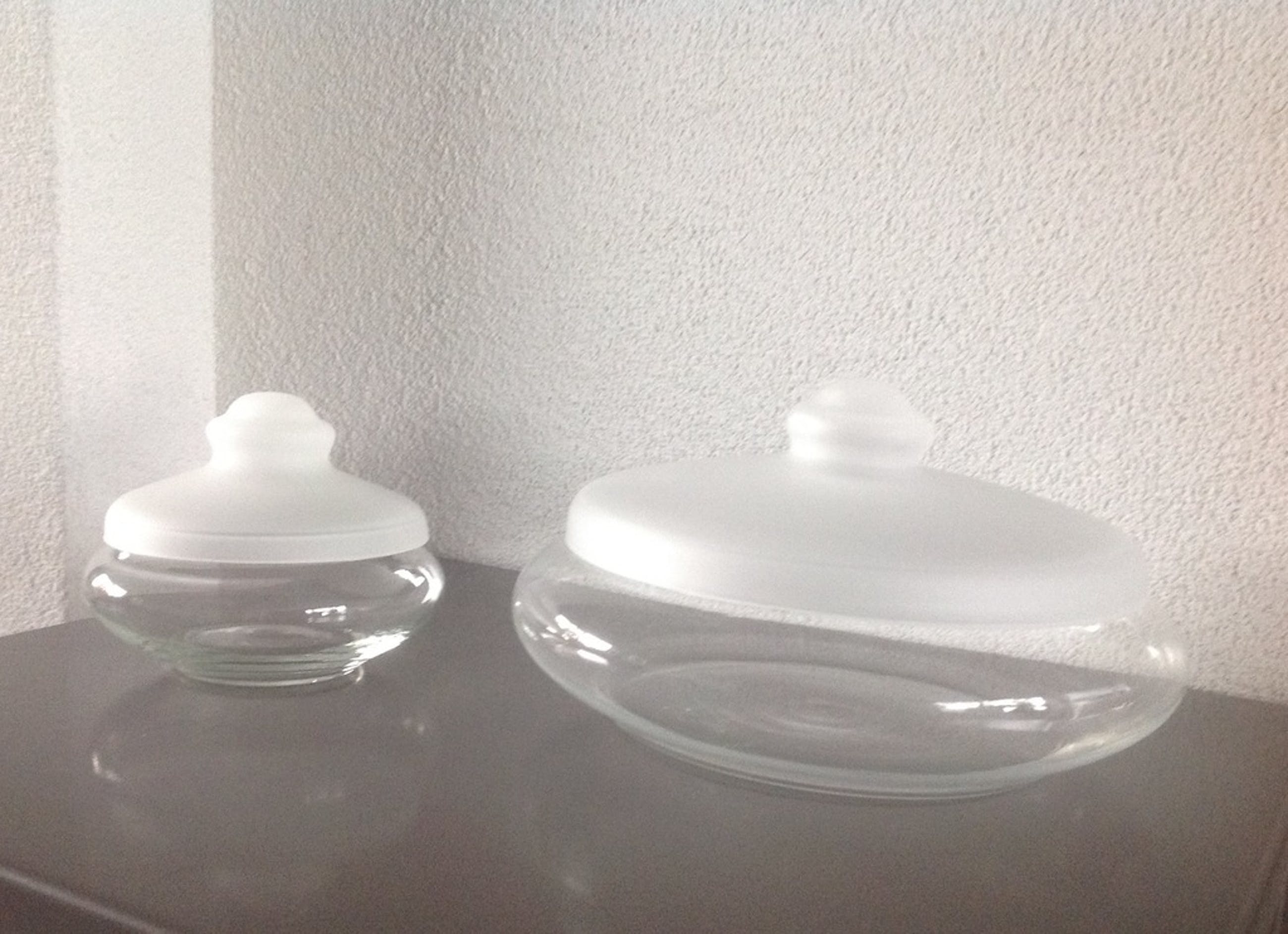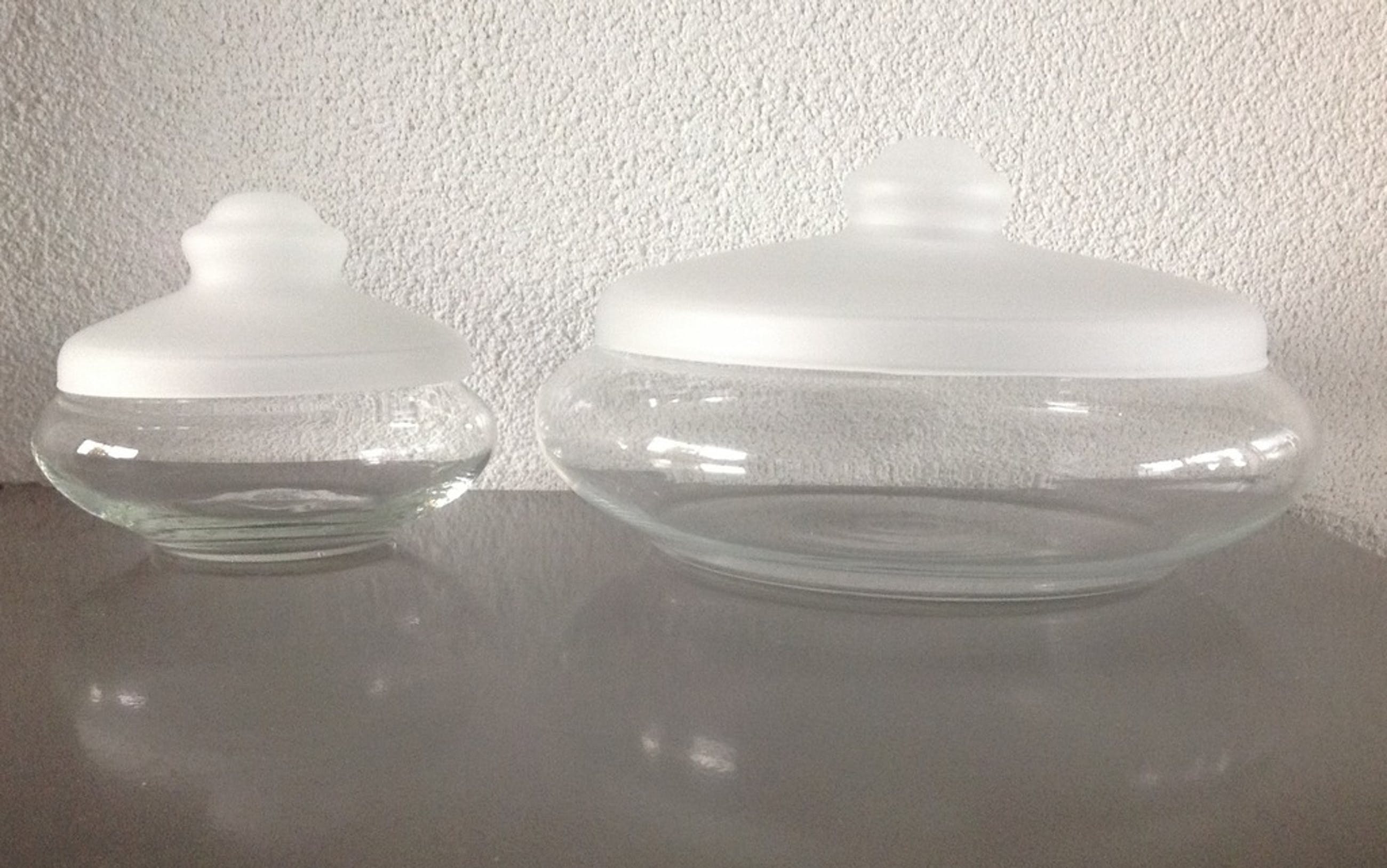 Zowel koekdoos als bonbondoosjes hebben een helder glazen schaal en een gesatineerd deksel.