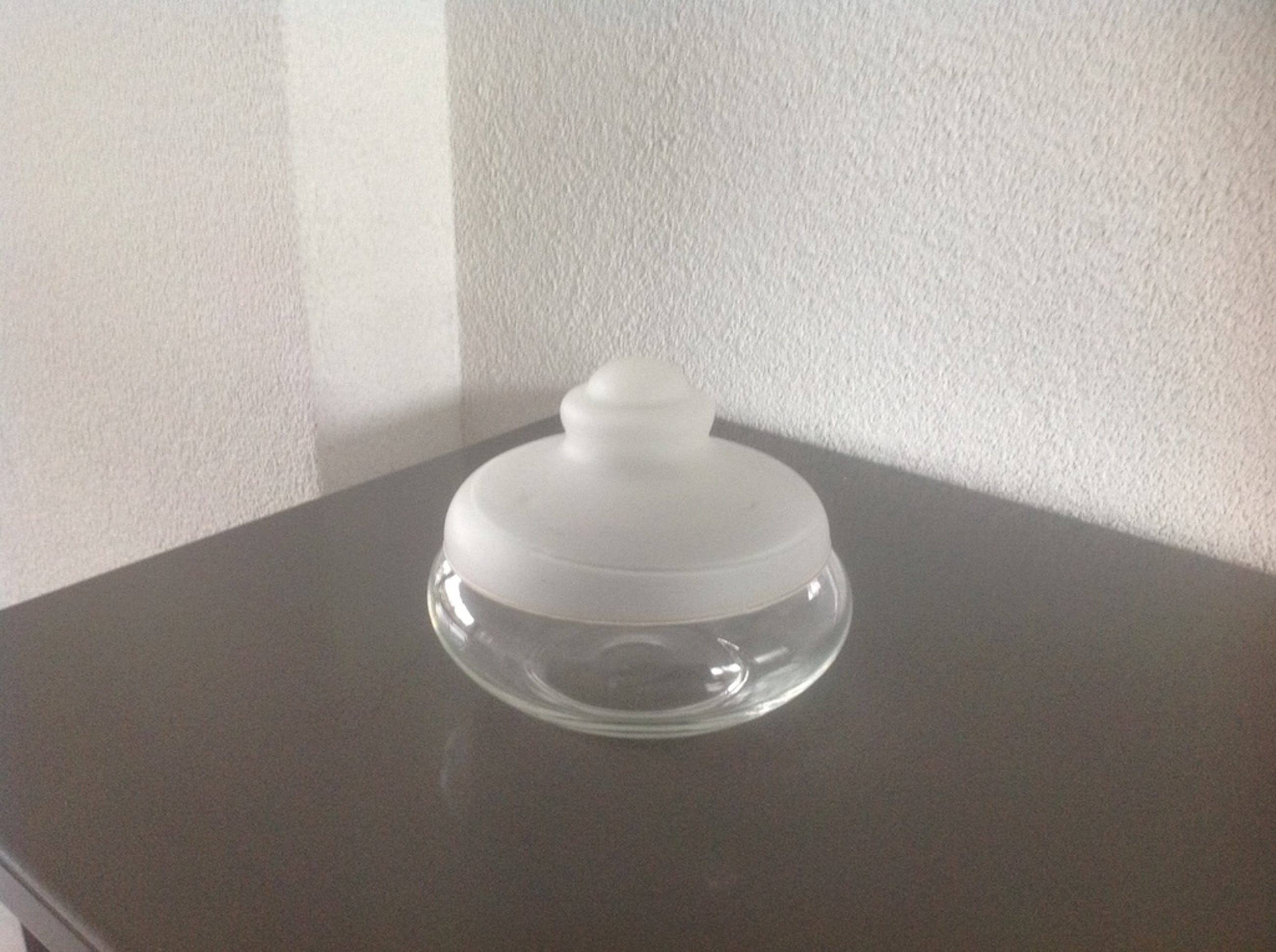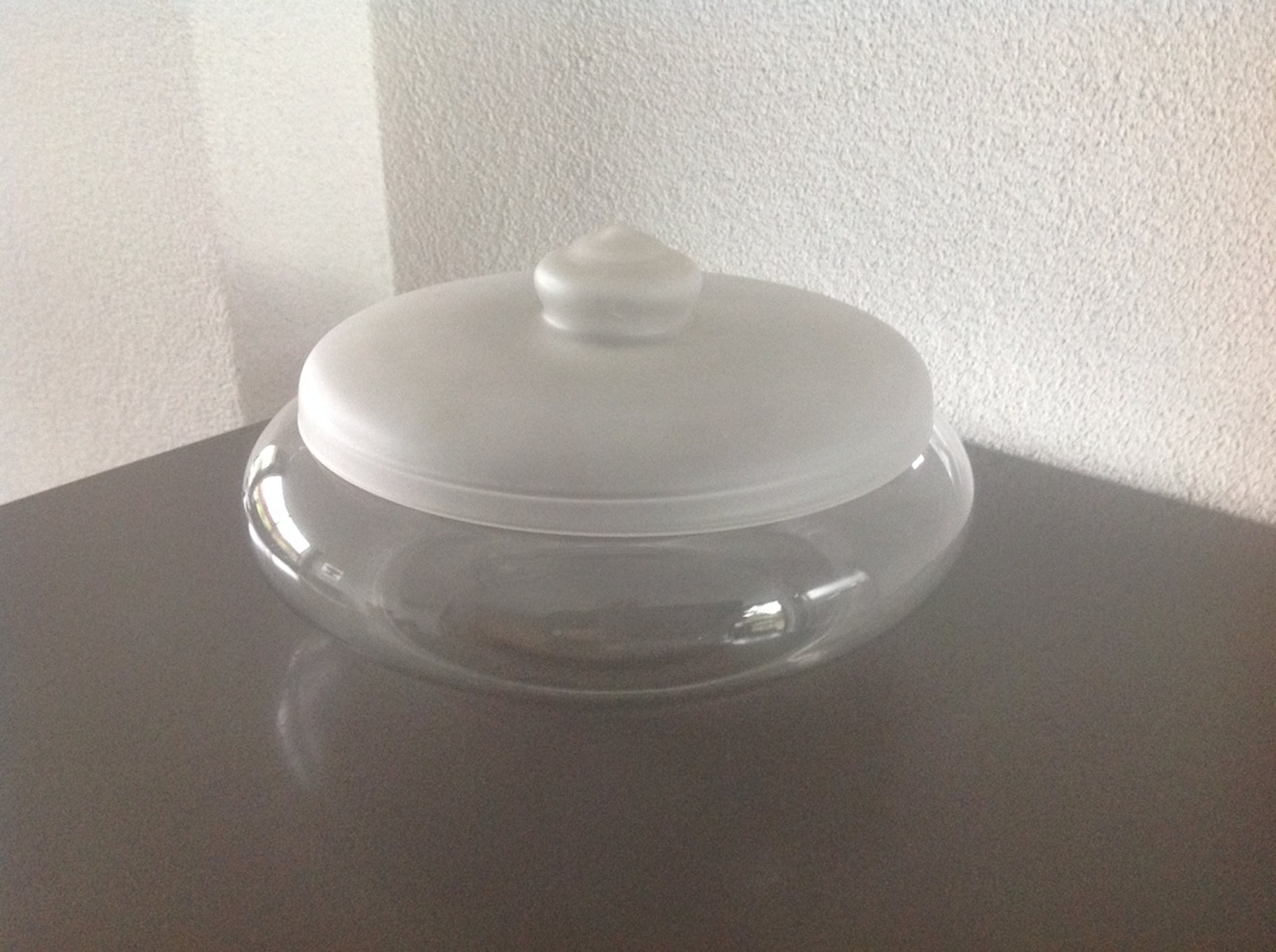 Voor de glasfabriek "Leerdam" ontwierp Jacques Boon deze koekdoos en bonbonnière van helder glas en gesatineerde deksels.