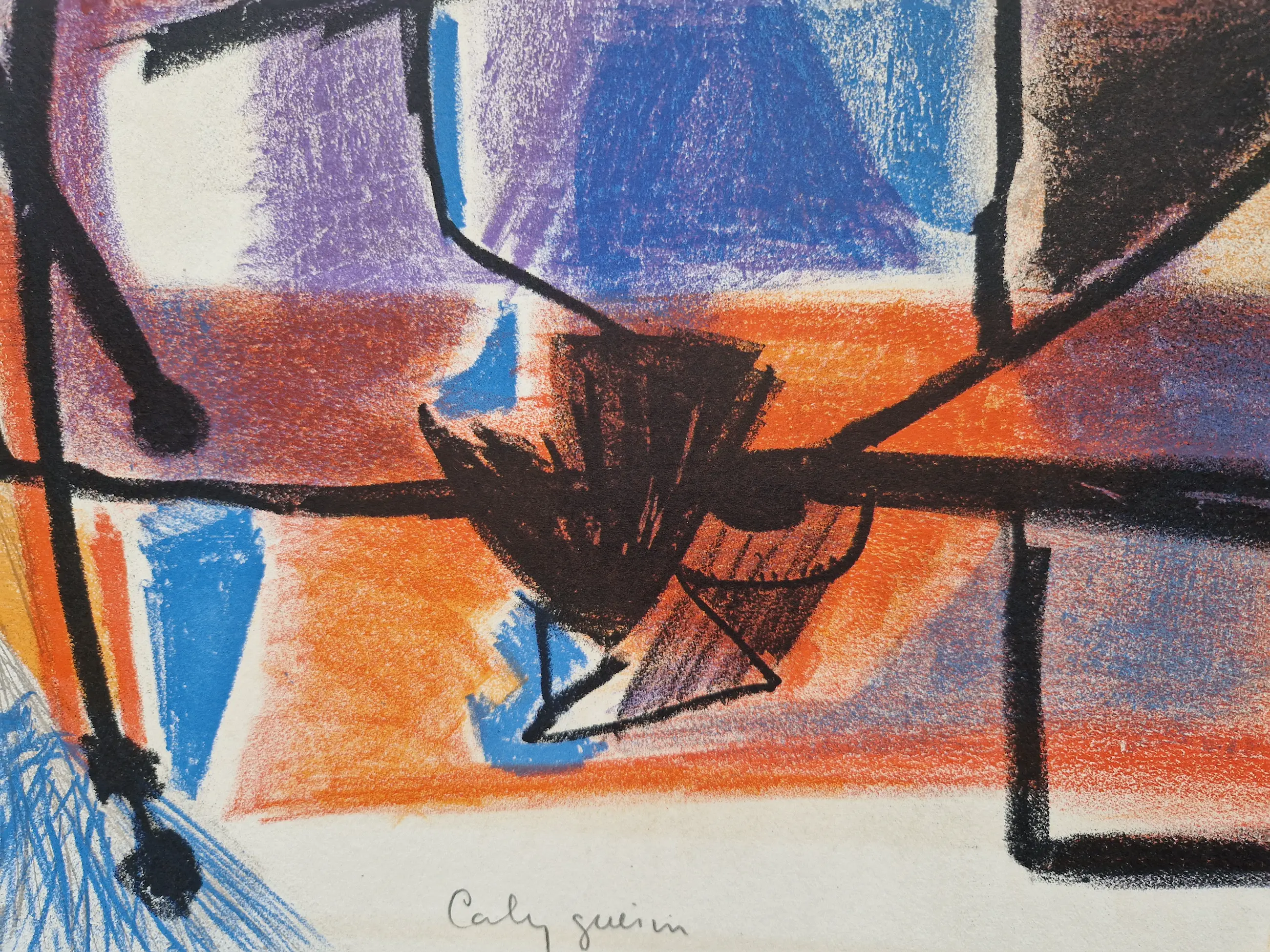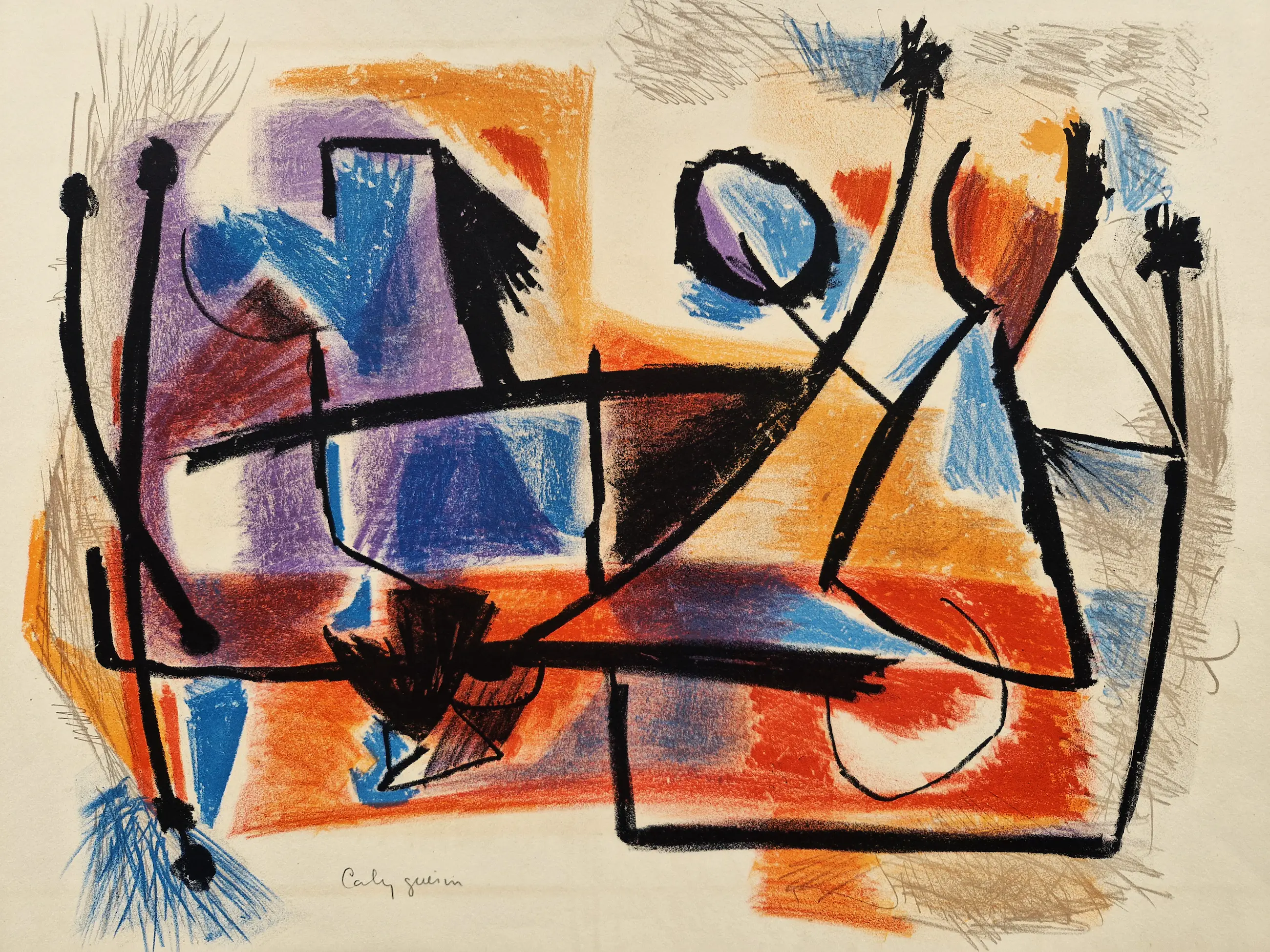 - Een in 1962 door de Franse kunstschilder, graficus tapijtontwerper en glazenier Jacques Colas-Guerin (1927-) gemaakte Lithografie getiteld "composition nr2". Nummer 7 in een zeer beperkte oplage van slechts 7 ex. op dik papier. Verkeert in goede staat met erg mooie kleuren. Potlood-gesigneerd en getiteld. Beeldmaat 33x43cm (HxB). Bladmaat 49x39cm.