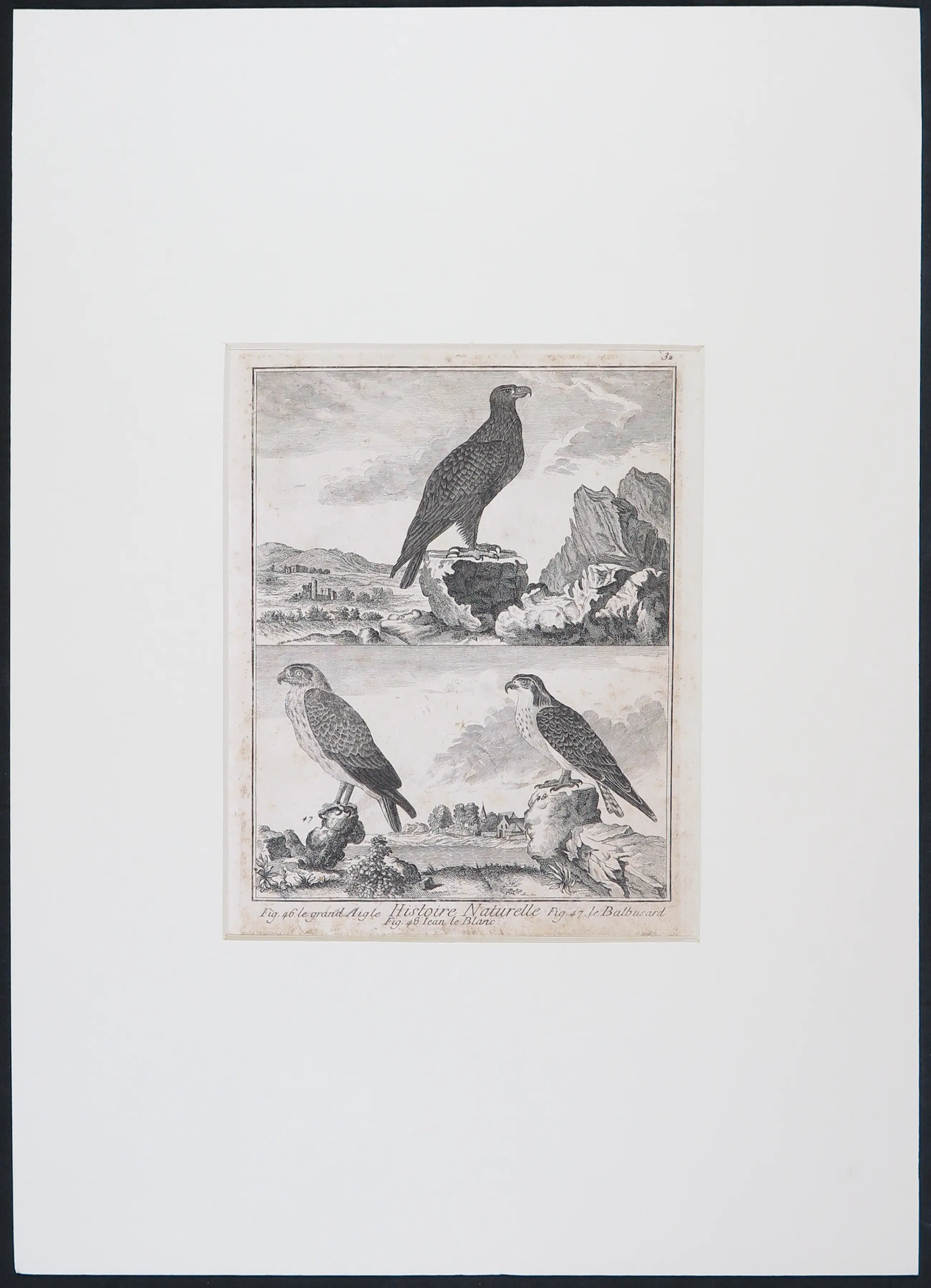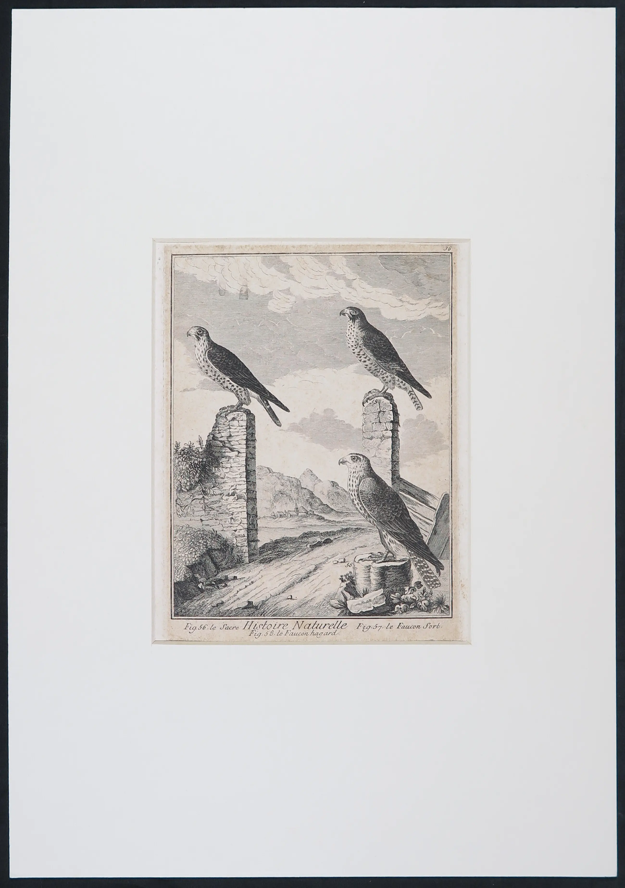 | Goede staat gezien de leeftijd. Sprake van vergeling, foxing en vlekjes. Klein krasje door de bovenste valk op de linker gravure. Een passe-partout heeft een vouw in de hoek rechtsboven en een vlekje op het passe-partout. | |||||||||||