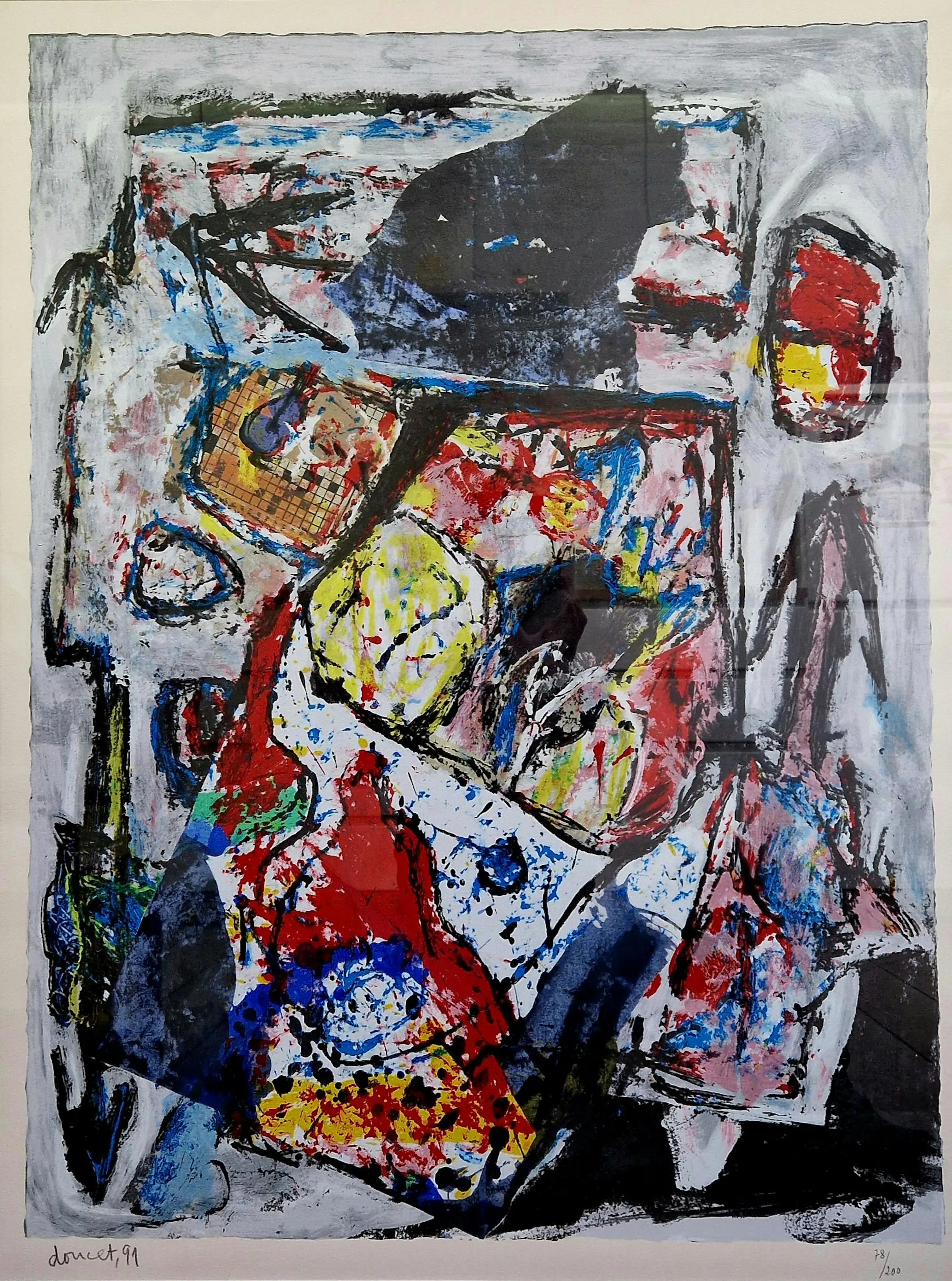 Fraaie grote zeefdruk uit 1991 van kunstenaar Jacques Doucet, de Franse tak van Cobra. Op Arches papier, uitgave Jaski Art Amsterdam. In professionele lijst achter glas met passe-partout. Minimale gebruikssporen aan de lijst.