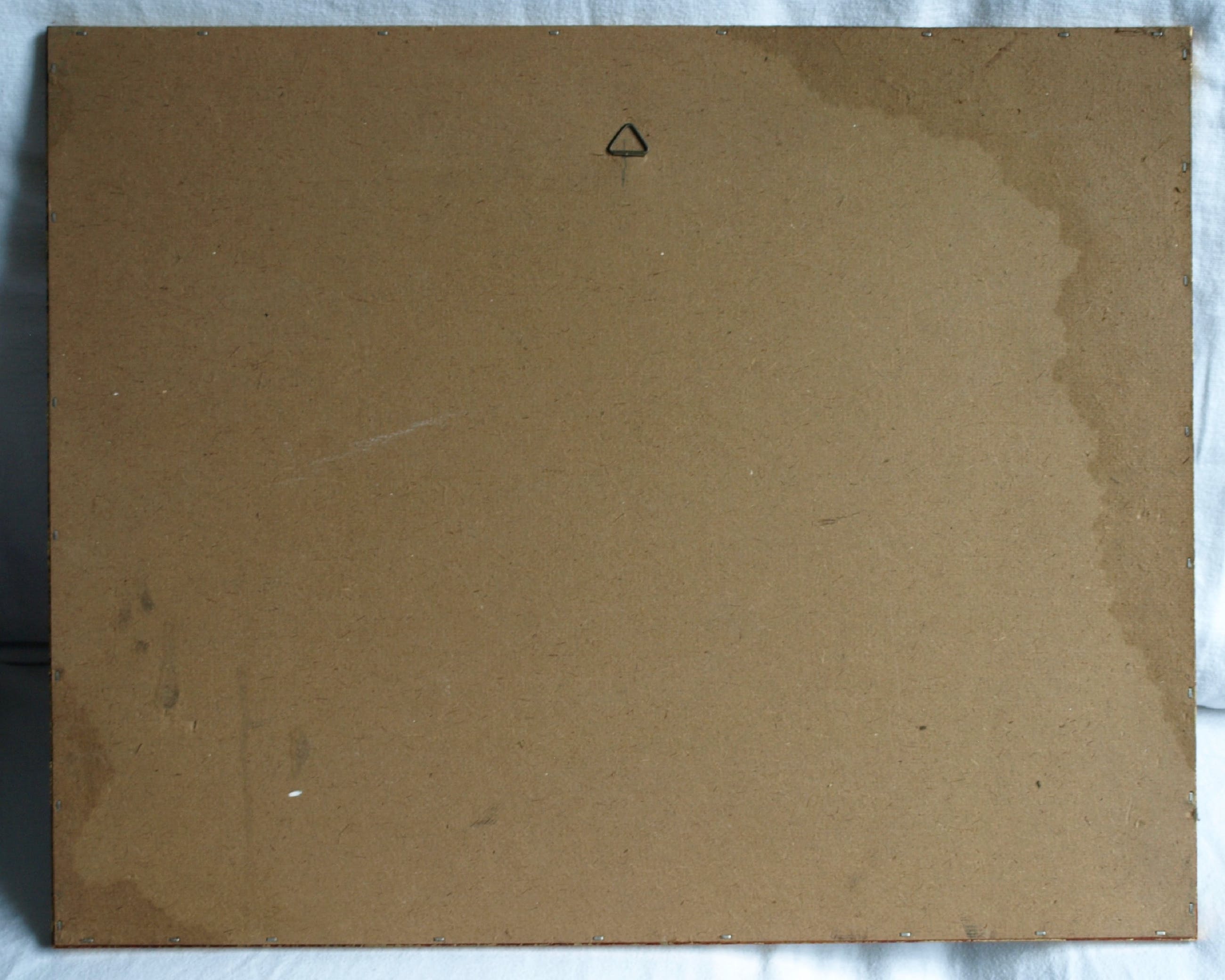 De houten lijst heeft slijtplekjes en de kartonnen achterplaat heeft een