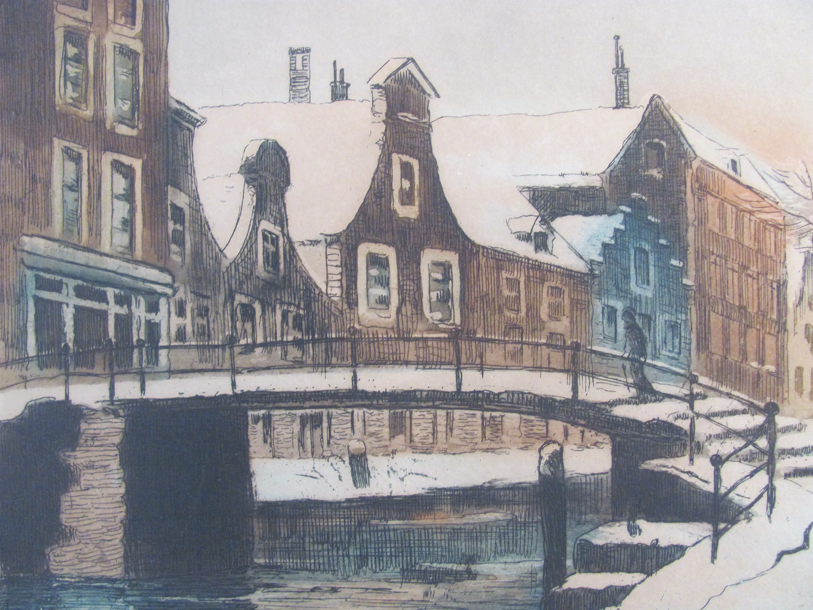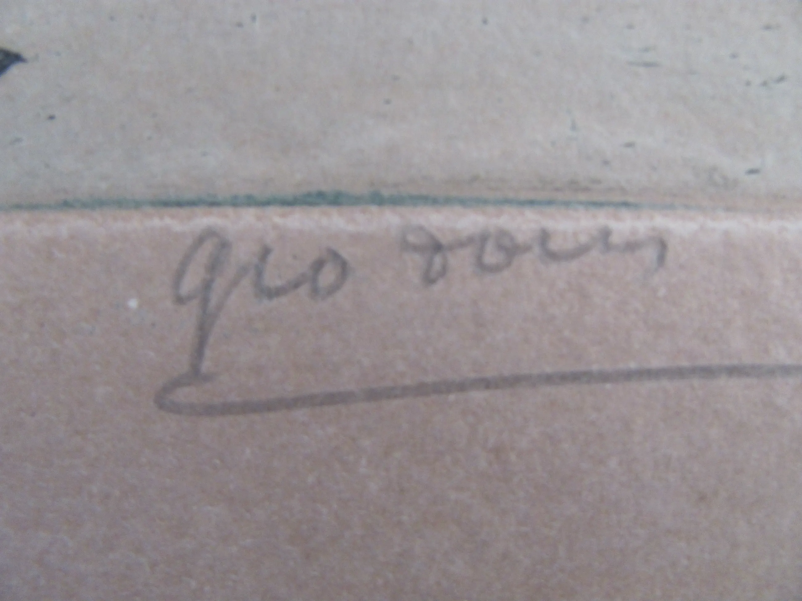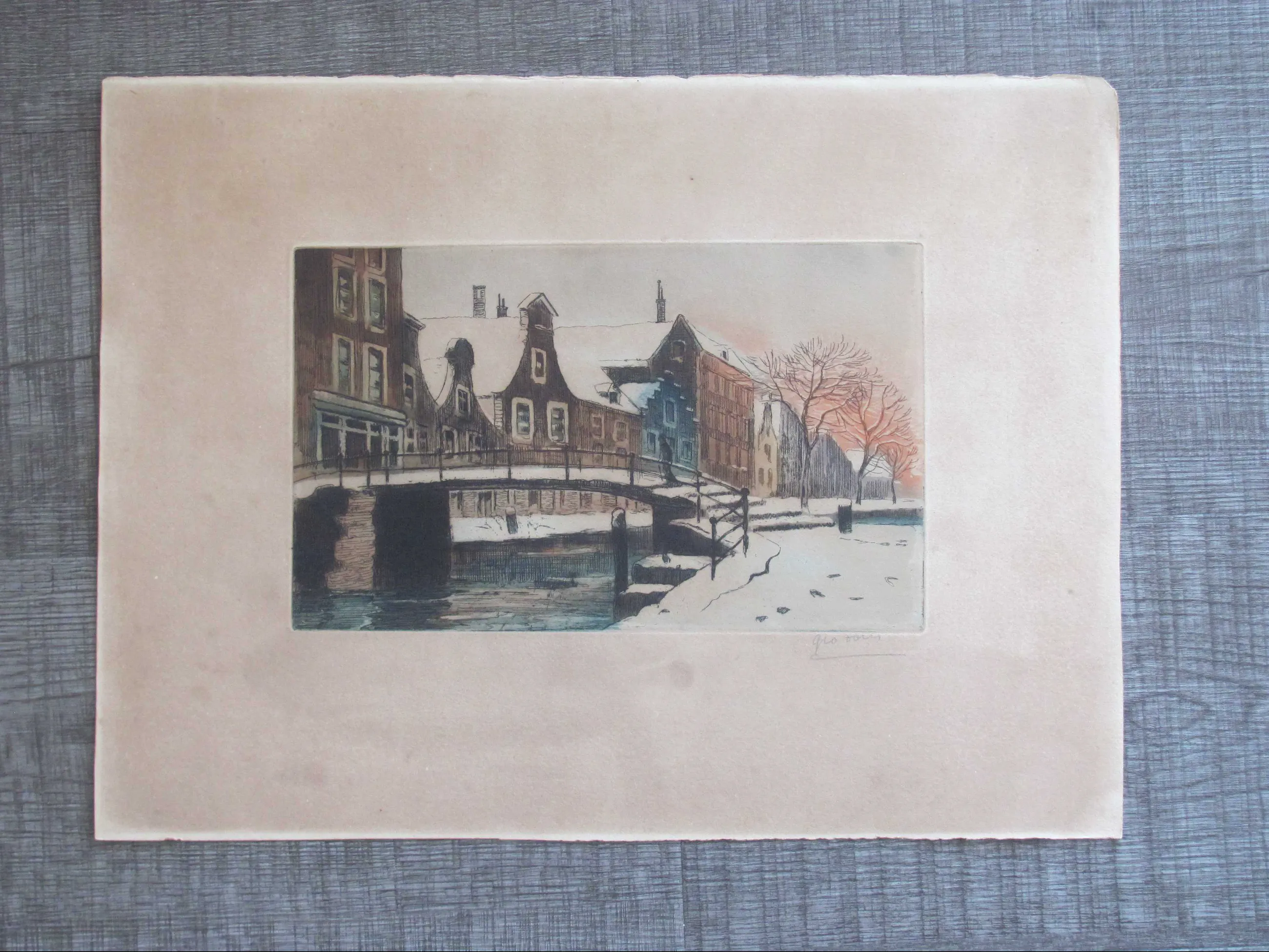 Daarbij een ets van een voor mij onbekende kunstenaar, m.i. ook uit België. Gesigneerd (Gio Doeij ?) Los etsblad, egaal verkleurd. Doet nauwelijks afbreuk aan de mooie ingekleurde ets. Afmeting ets 27 cm breed en 17 cm hoog. Inclusief de brede etsranden 40 cm x 30 cm.