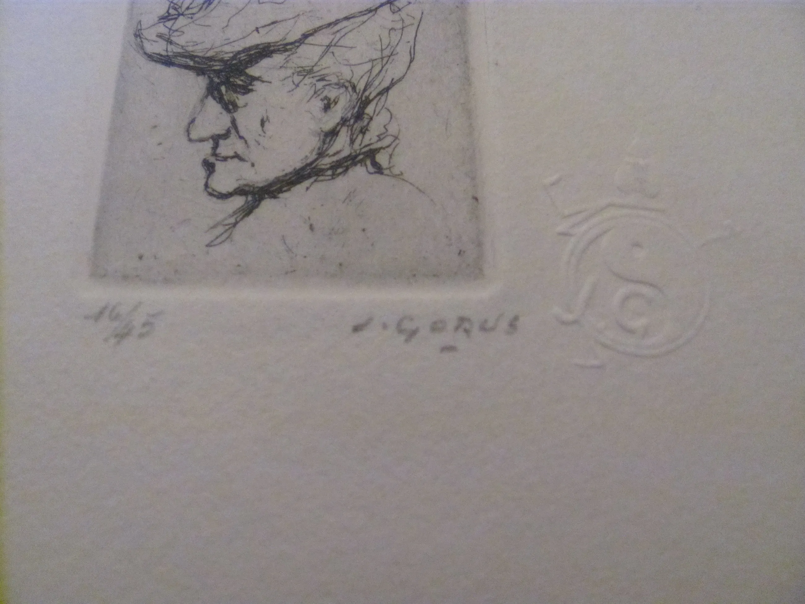 Jacques Goris: Papier van 28 cm hoog en 19 cm breed, met een kleine ets van Jacques Gorus (1901-1981). Genummerd en gesigneerd. Nummer 16/45. Jacques Gorus was docent aan academie, etser, tekenaar geboren op 1901 te Sint-Gillis (België, Brussel) en overleden op 1981 te Antwerpen.