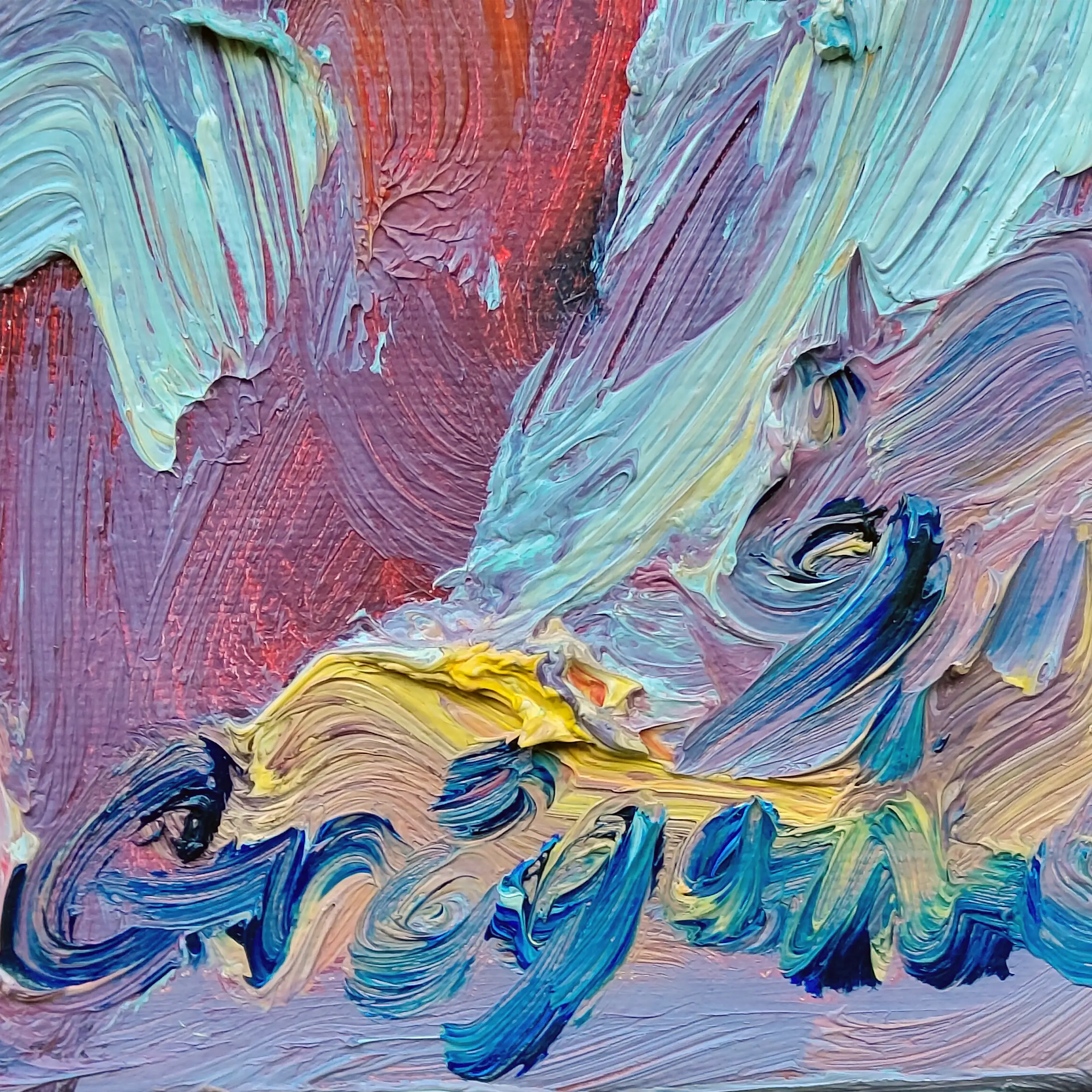 Uitsnede: 50 x 40 cm, in handgemaakte baklijst. Pasteus geschilderd.