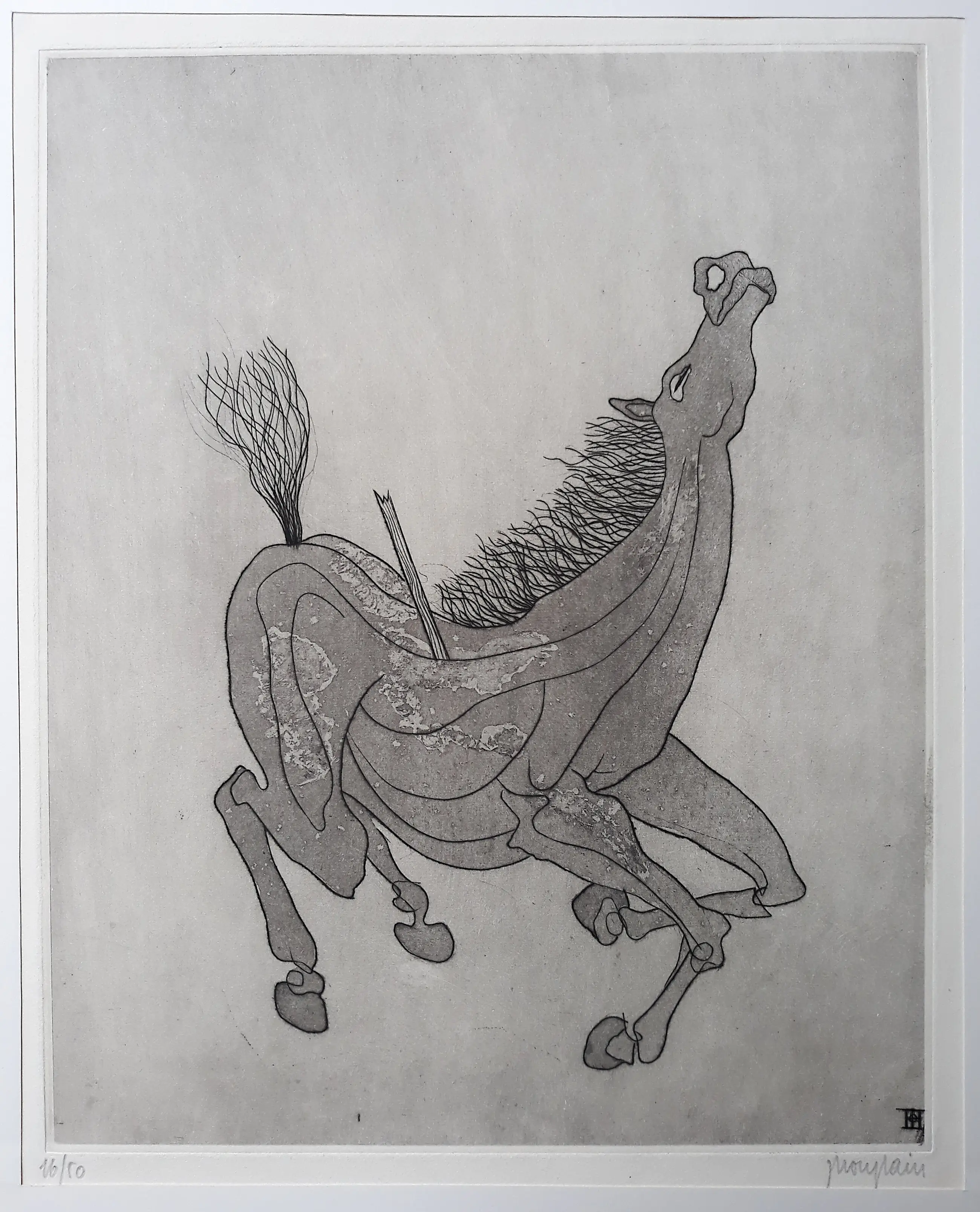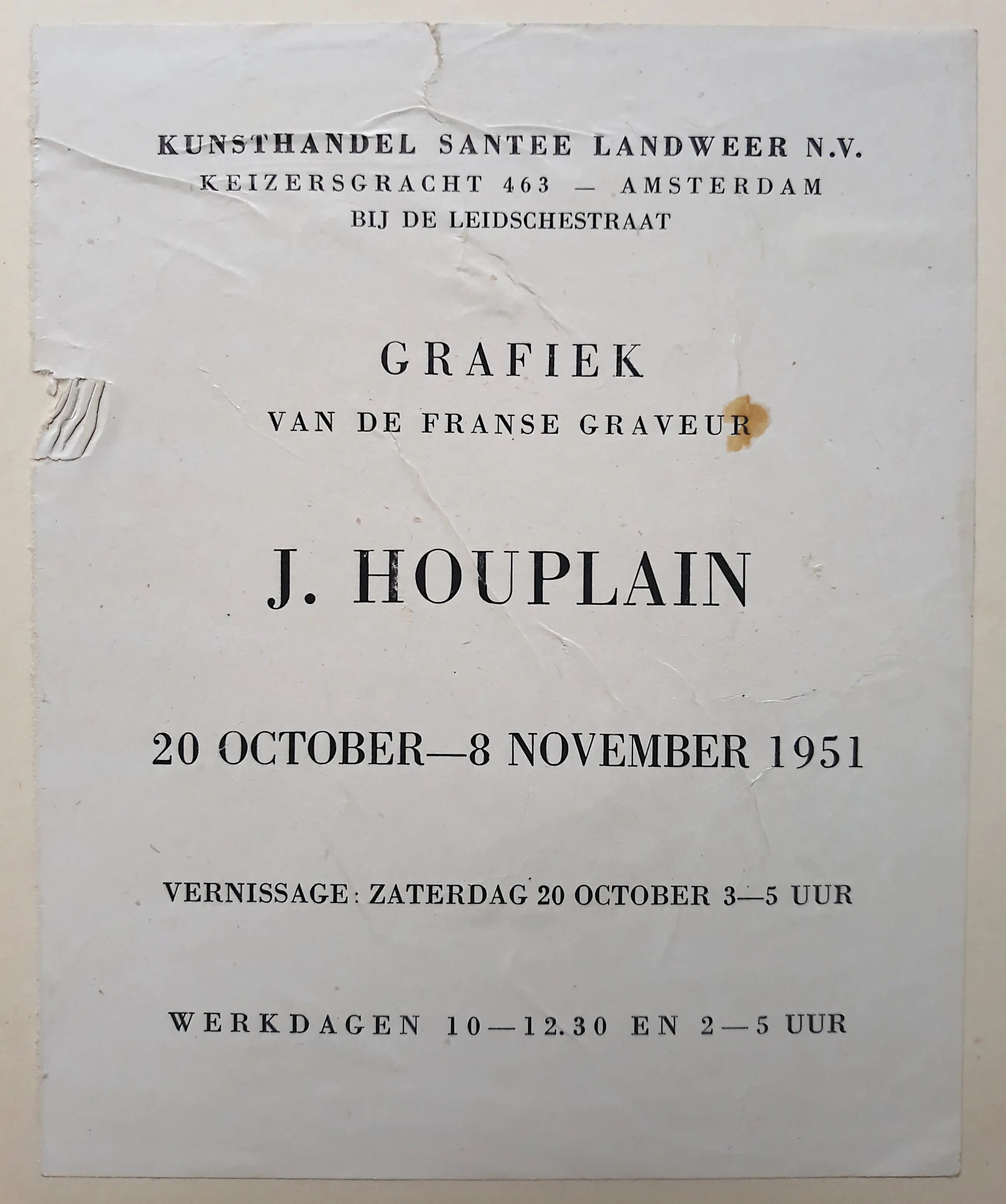 Zeer mooie ets van de Frans kunstenaar Jacques Houplain, die vooral geroemd werd om zijn graveerwerk. Aquatint ets op geschept papier, met potlood gesigneerd en genummerd (15/50), gemonogrammeerd in de plaat, in verso met potlood getiteld. Achterop het passe-partout zit een label met de herkomst: Kunsthandel Santee Landweer, Amsterdam (1951). In zeer goede conditie. Het blad kan eenvoudig uit het passe-partout worden gehaald.