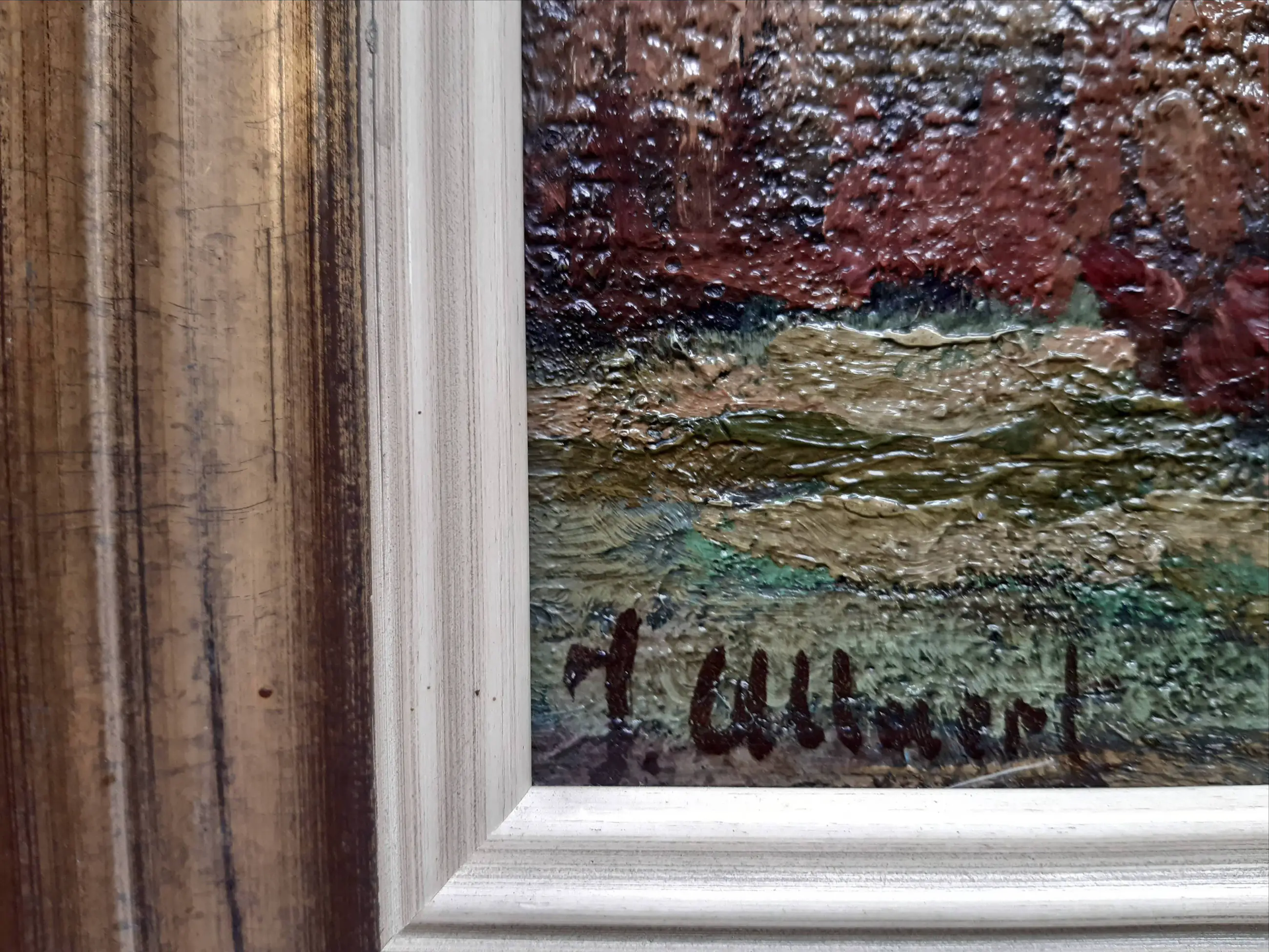 Mooi klein landschap met hooimijten. Pasteuze olieverf op paneel in een techniek met veel diepte en apart kleurgebruik.