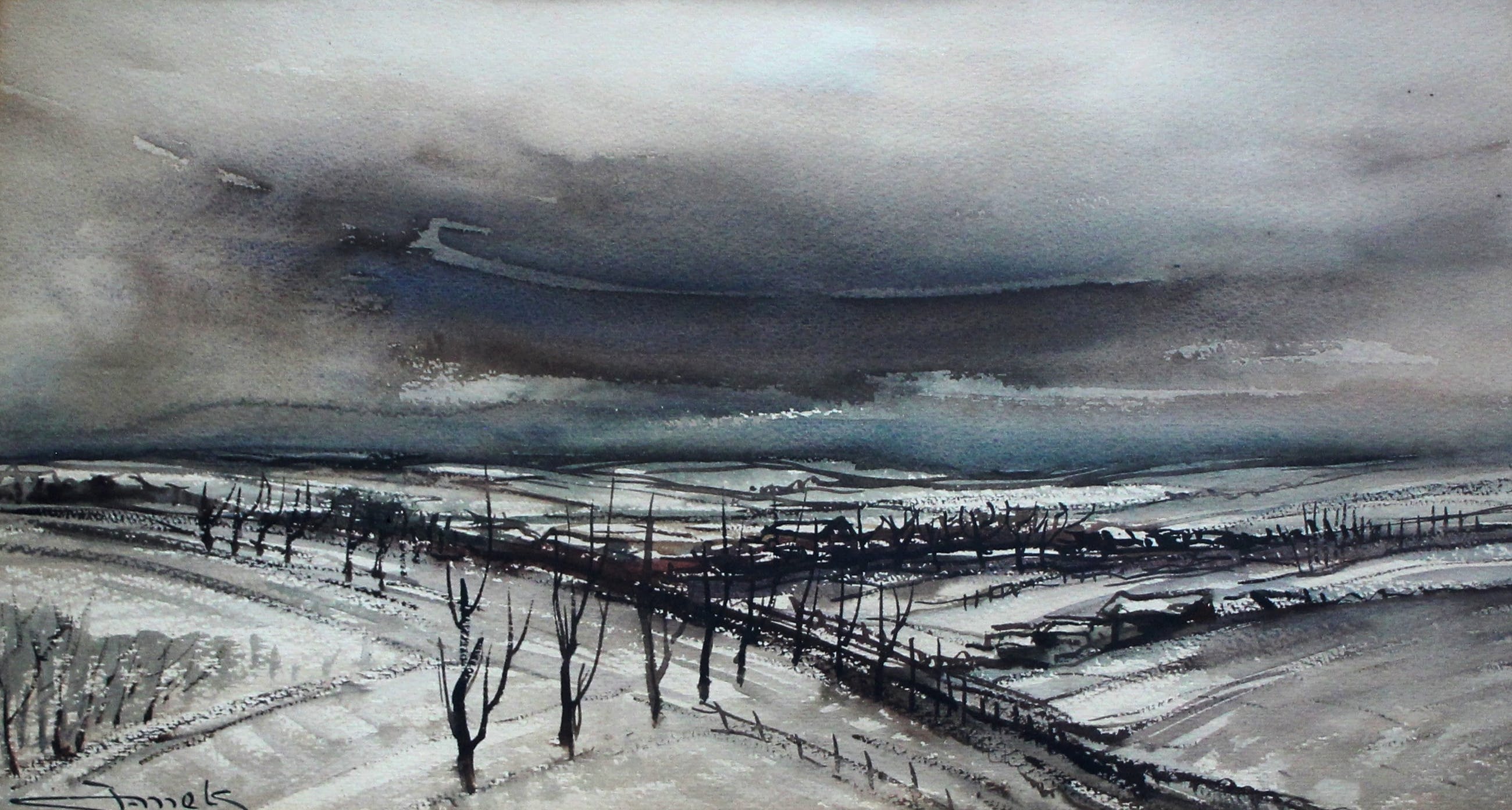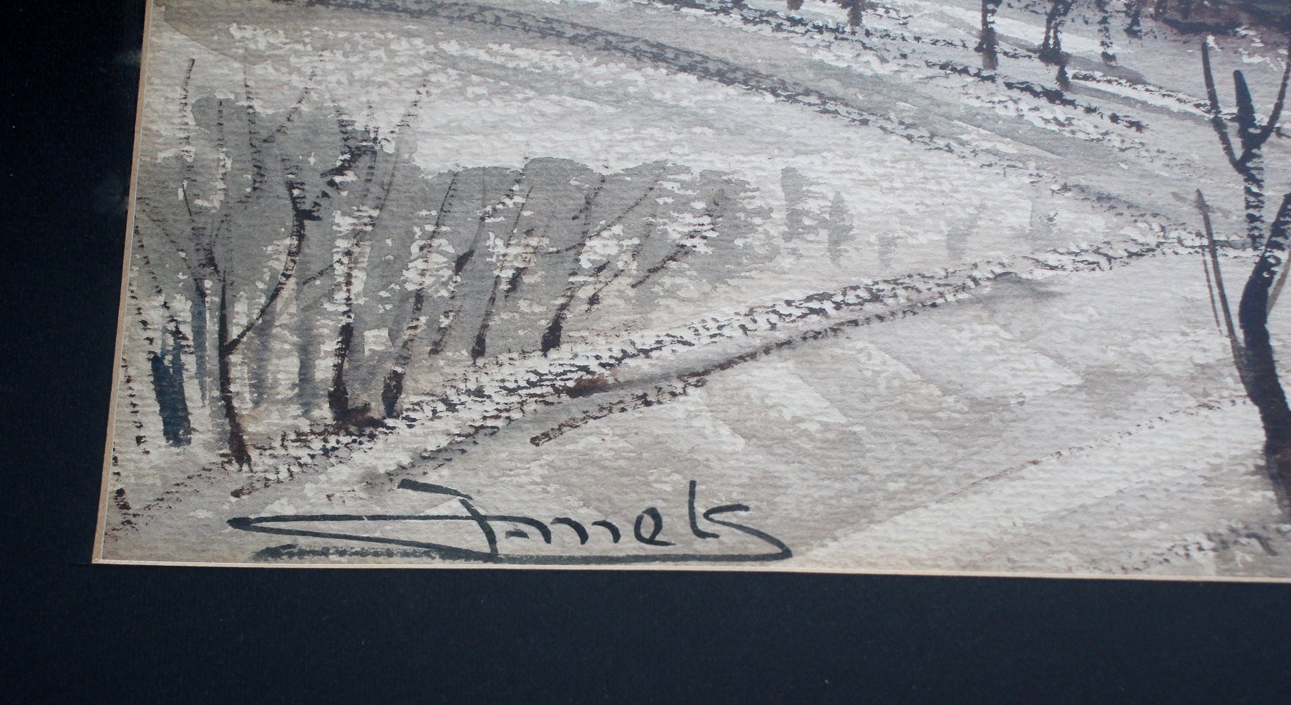 Ingelijst winterlandschap van Jacques Mels. Het werk is linksonder gesigneerd door de kunstenaar. Het werk kan verzonden worden. Alleen het glaswerk kan niet verzekerd worden.
