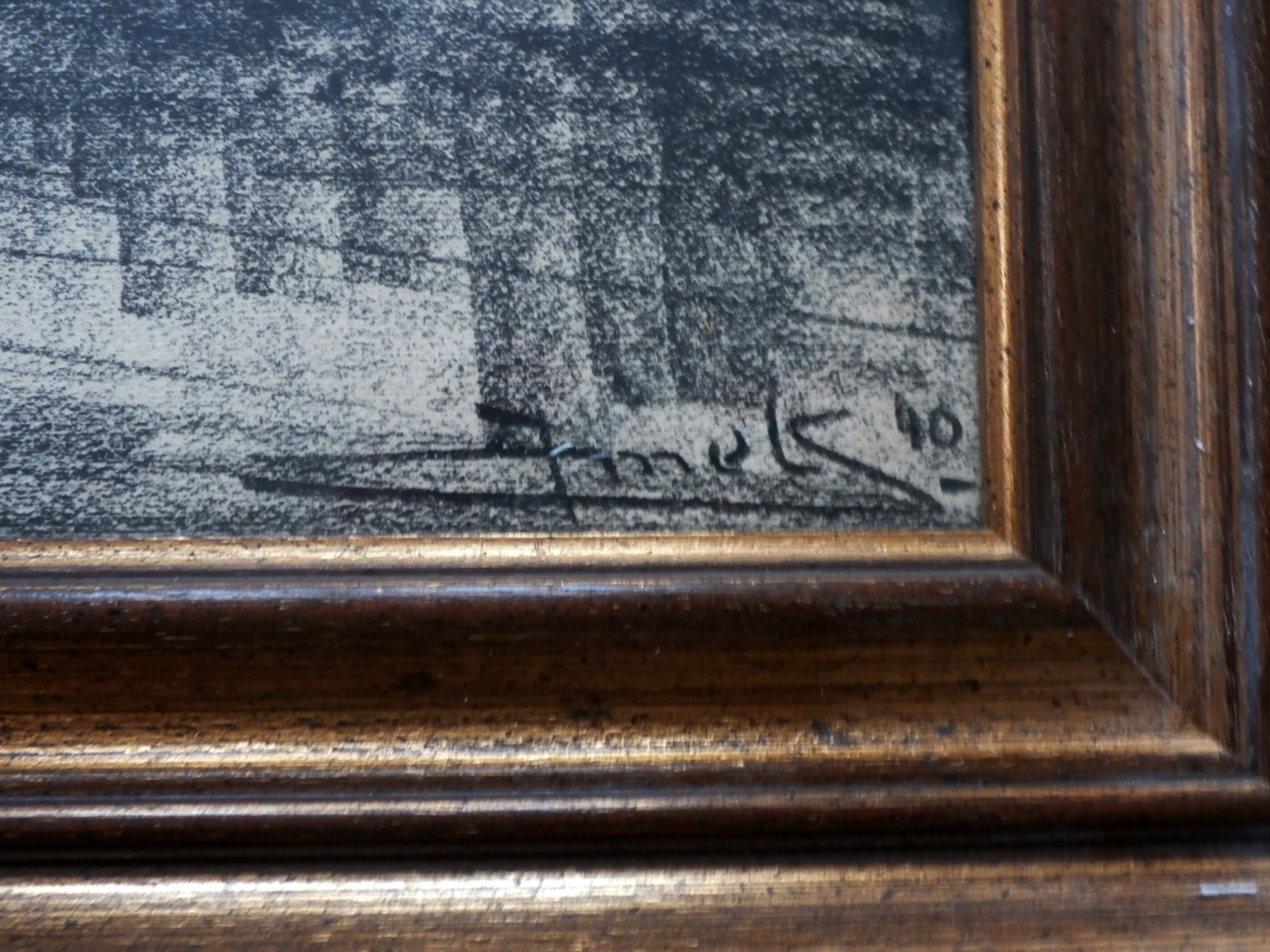 Grote ingelijste houtskooltekening van Jacques Mels uit 1940. Titel: Maasbrug, Maastricht. Het werk is rechtsonder met potlood gesigneerd en gedateerd door de kunstenaar. Afmetingen incl. lijst: H51 x b68 cm. Afmetingen voorstelling; H36 x b54 cm. Conditie: in goede staat.
