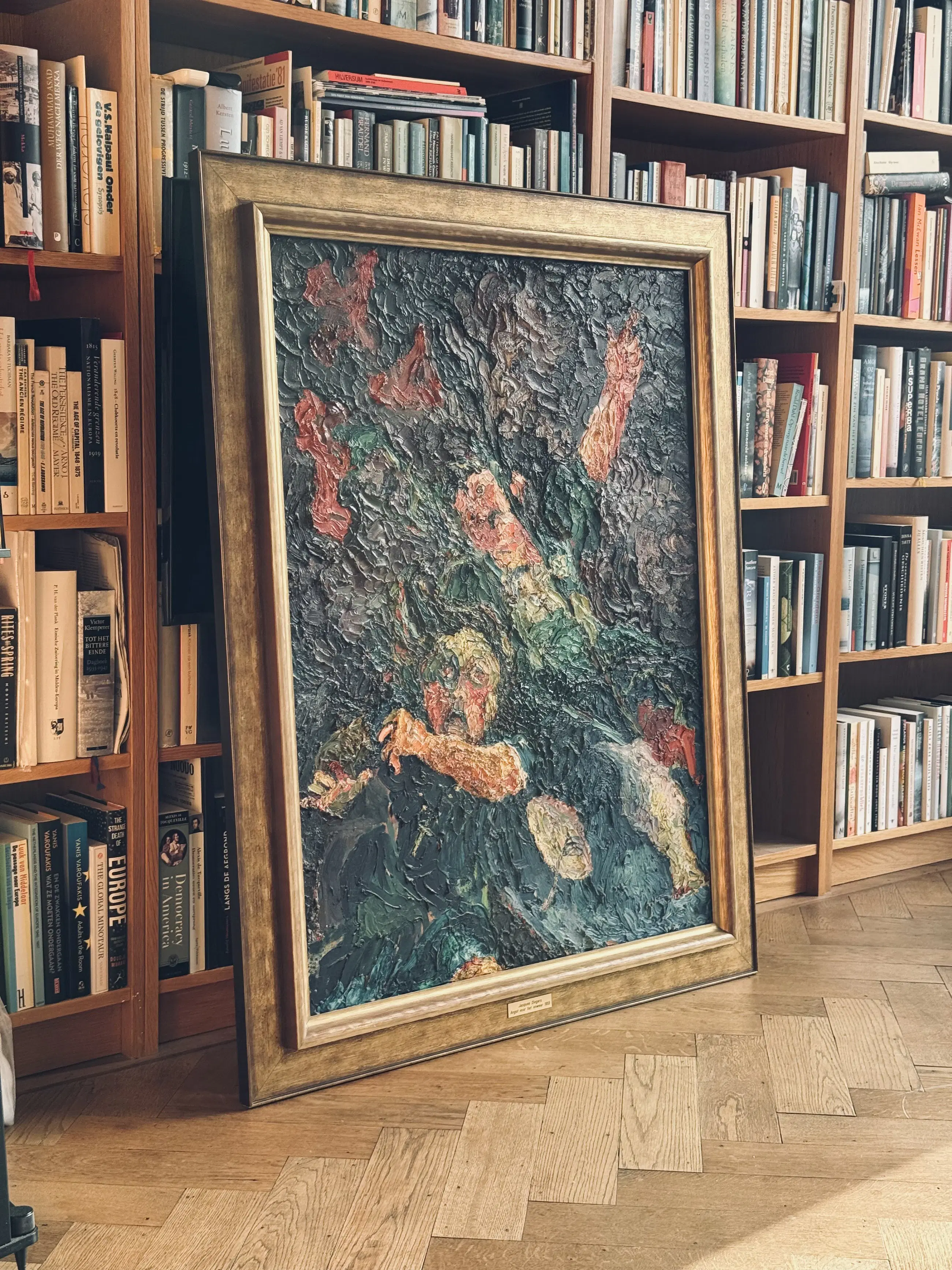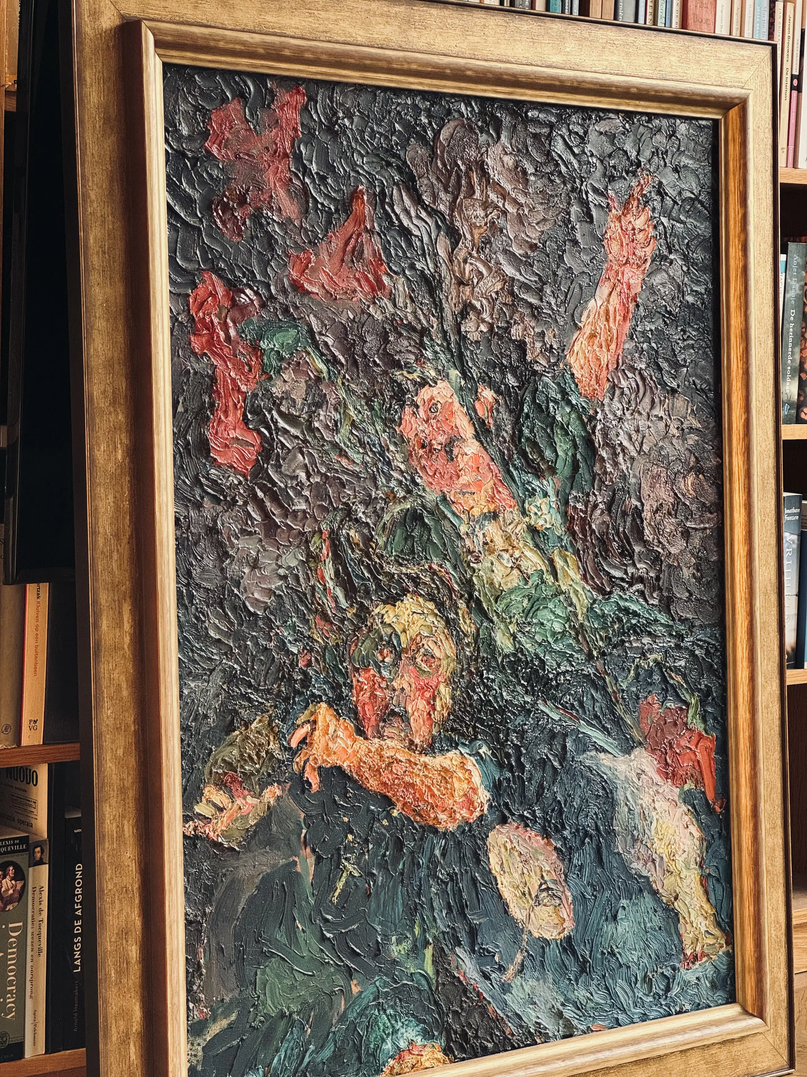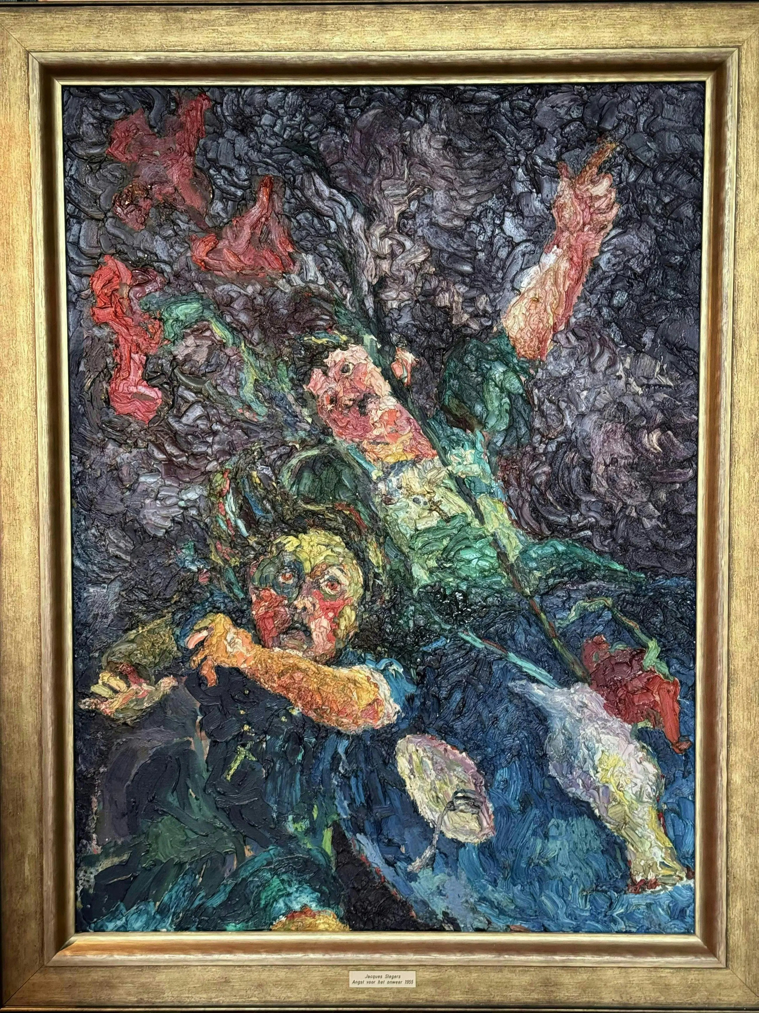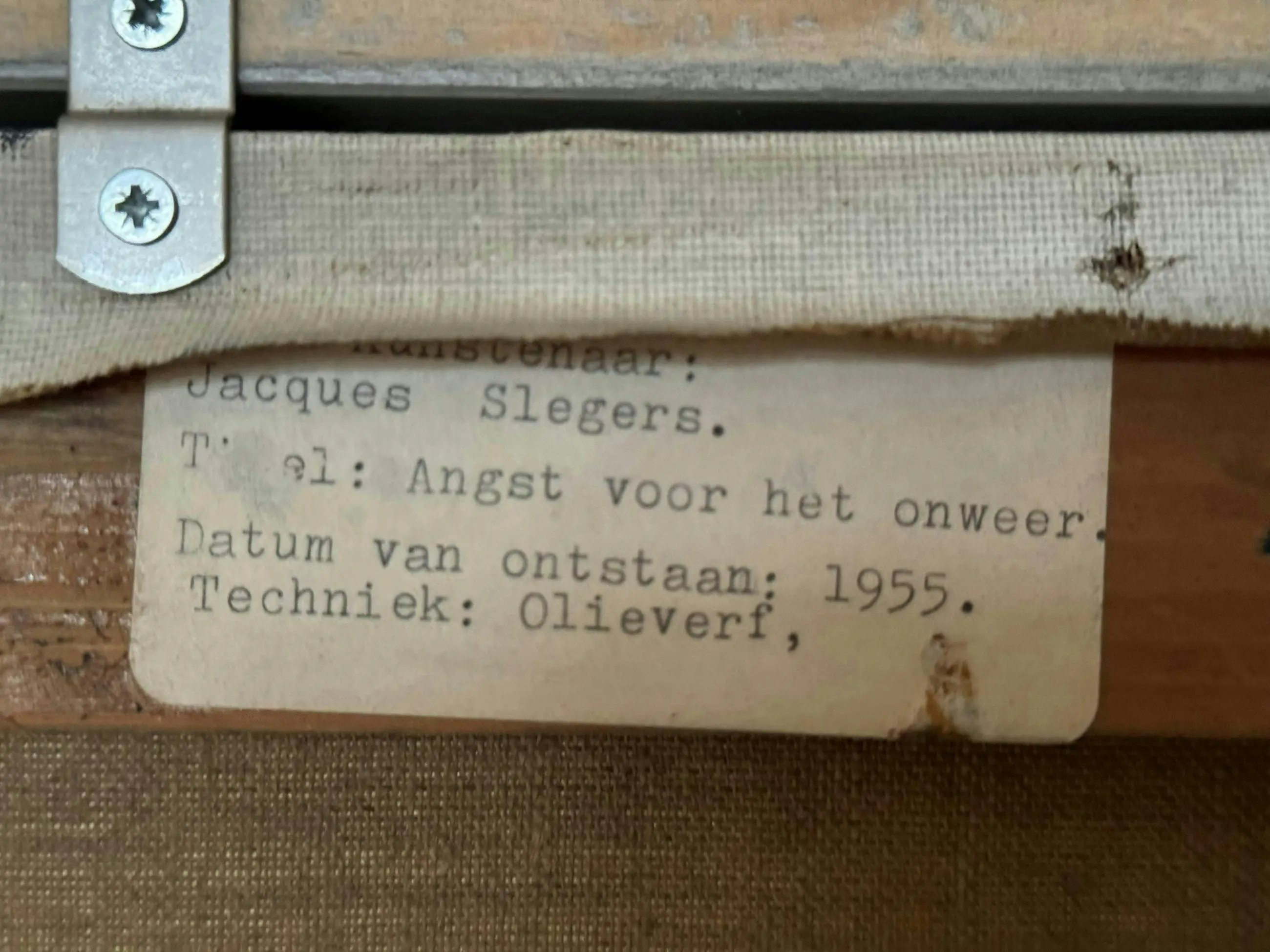 Kleurrijk museaal schilderij uit 1955 van de Eindhovense kunstenaar Jacques Slegers (1936-2000): 'Angst voor het onweer' (verso gesigneerd). Hoewel tegenwoordig misschien wat in vergetelheid geraakt, gold Slegers in zijn tijd als een belangrijke kunstenaar, hetgeen ook blijkt uit de overheids-opdrachten (zie foto stadsfontein). In zijn latere werk schoof hij op richting abstractie, maar het aangeboden werk stamt nog bij uitstek uit zijn vroege(re) expressionistische fase: de jaren '50 van de vorige eeuw. Zijn schilderstijl in die periode vertoont verwantschap met het werk van Oskar Kokoschka. De pasteus aangebrachte olieverf toont een prachtig coloriet. Het is een volumineus schilderij (100 x 75 cm) en verkeert in perfecte staat. Het doek is gevat in een dure goud- en bronskleurige lijst. Al met al een zeer waardevaste investering in een belangwekkend stuk beeldende kunst. Gelet op grootte en gewicht van het schilderij zelf ophalen of laten bezorgen (bijv. door Brenger).