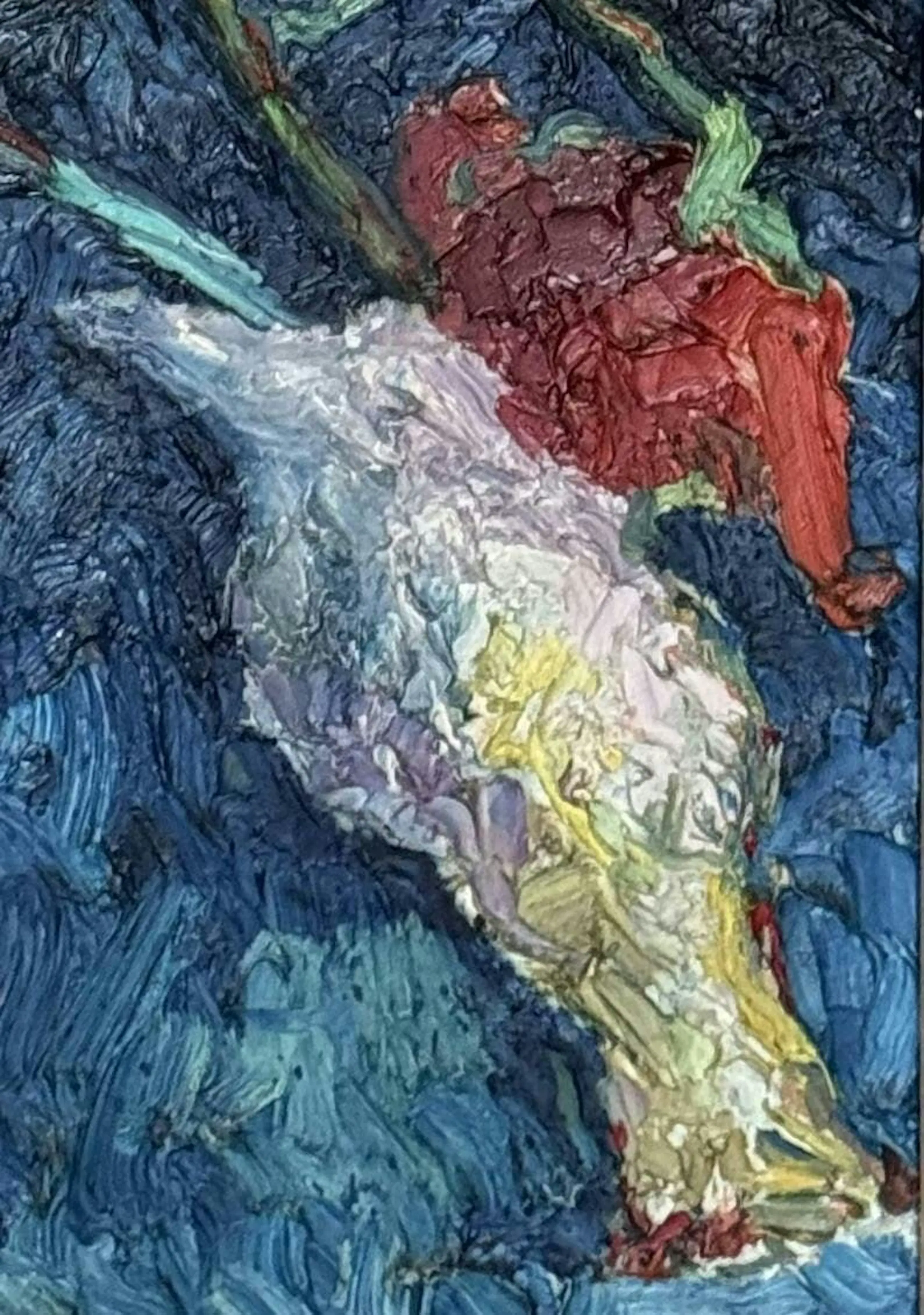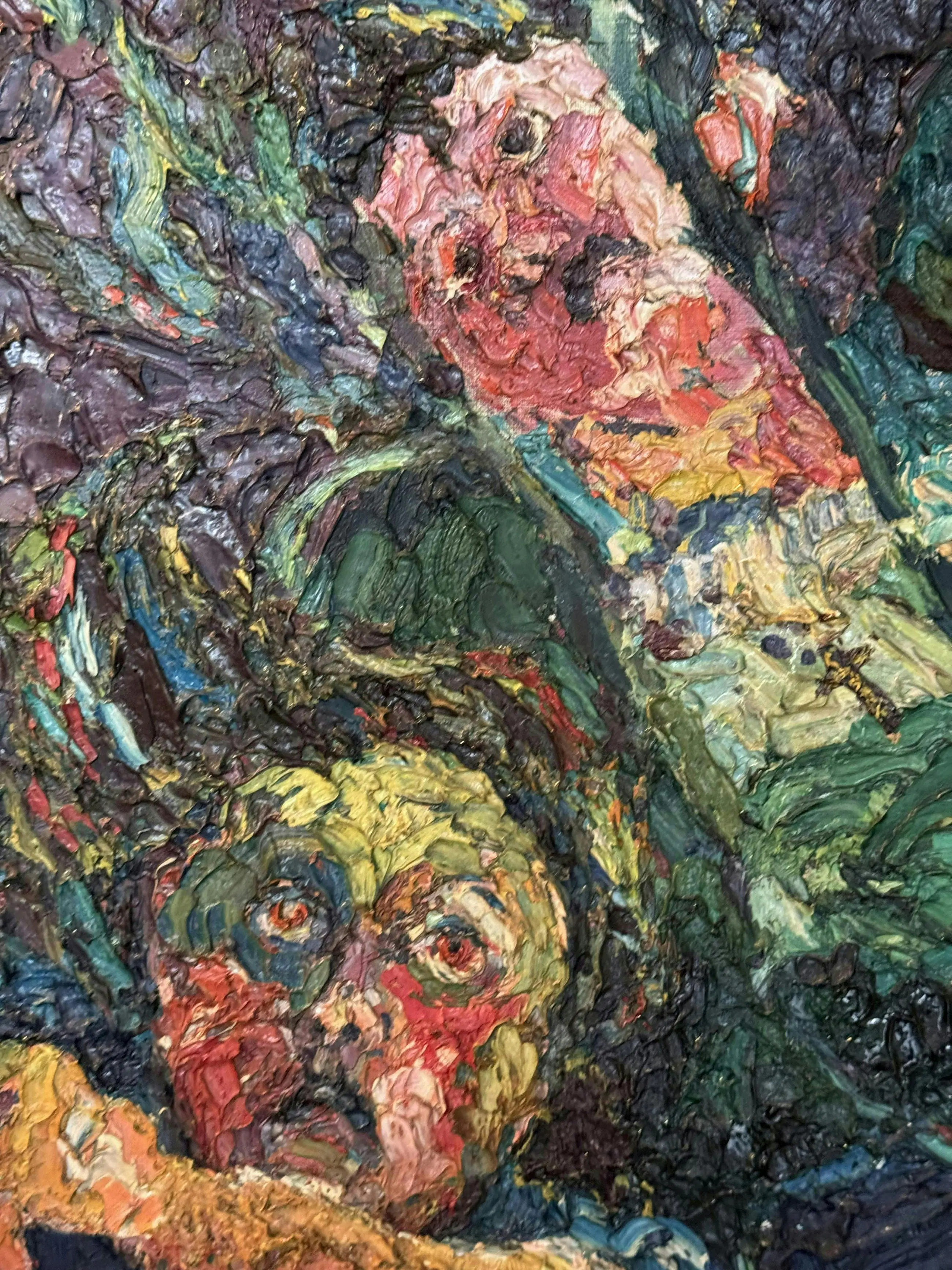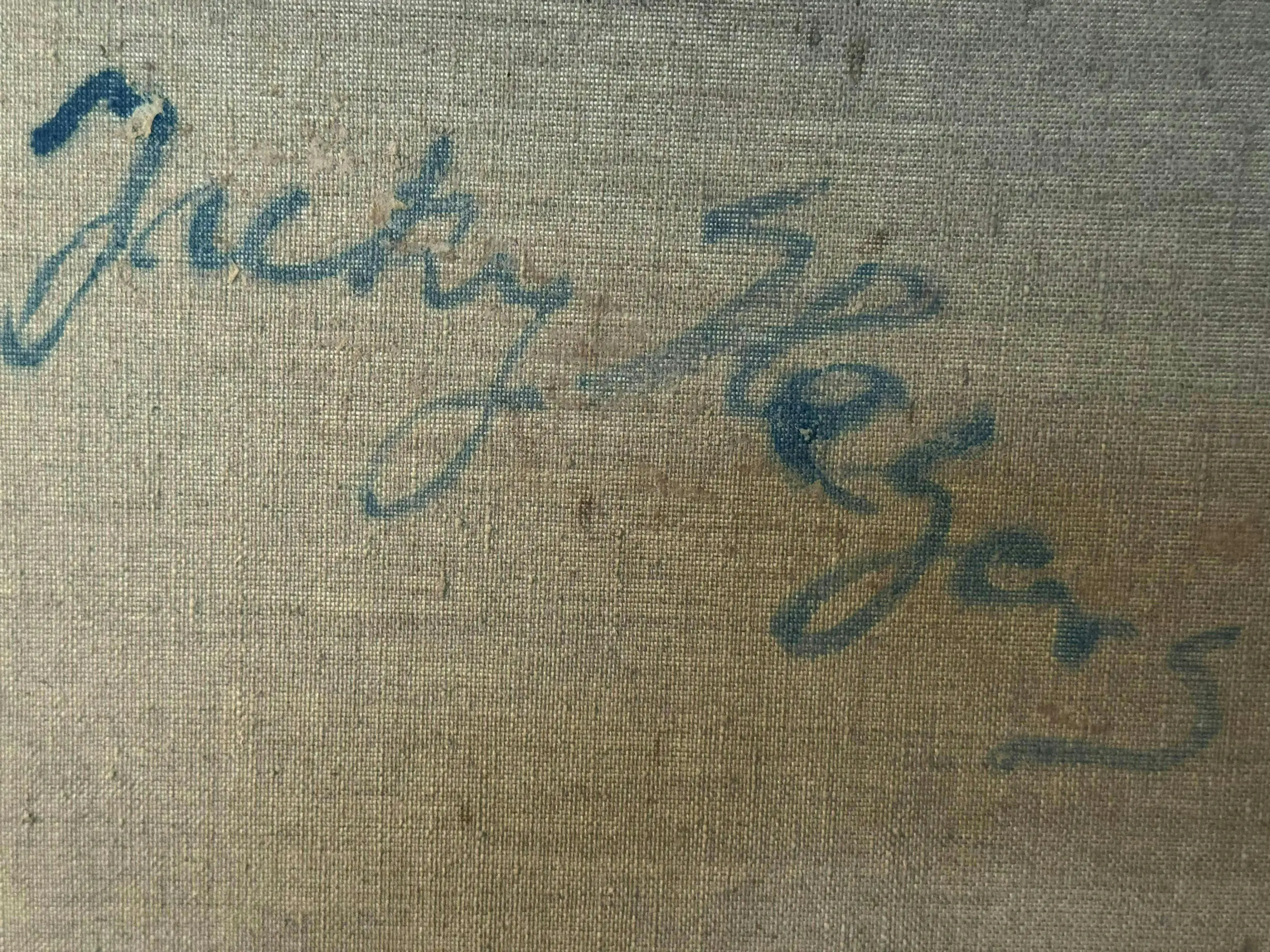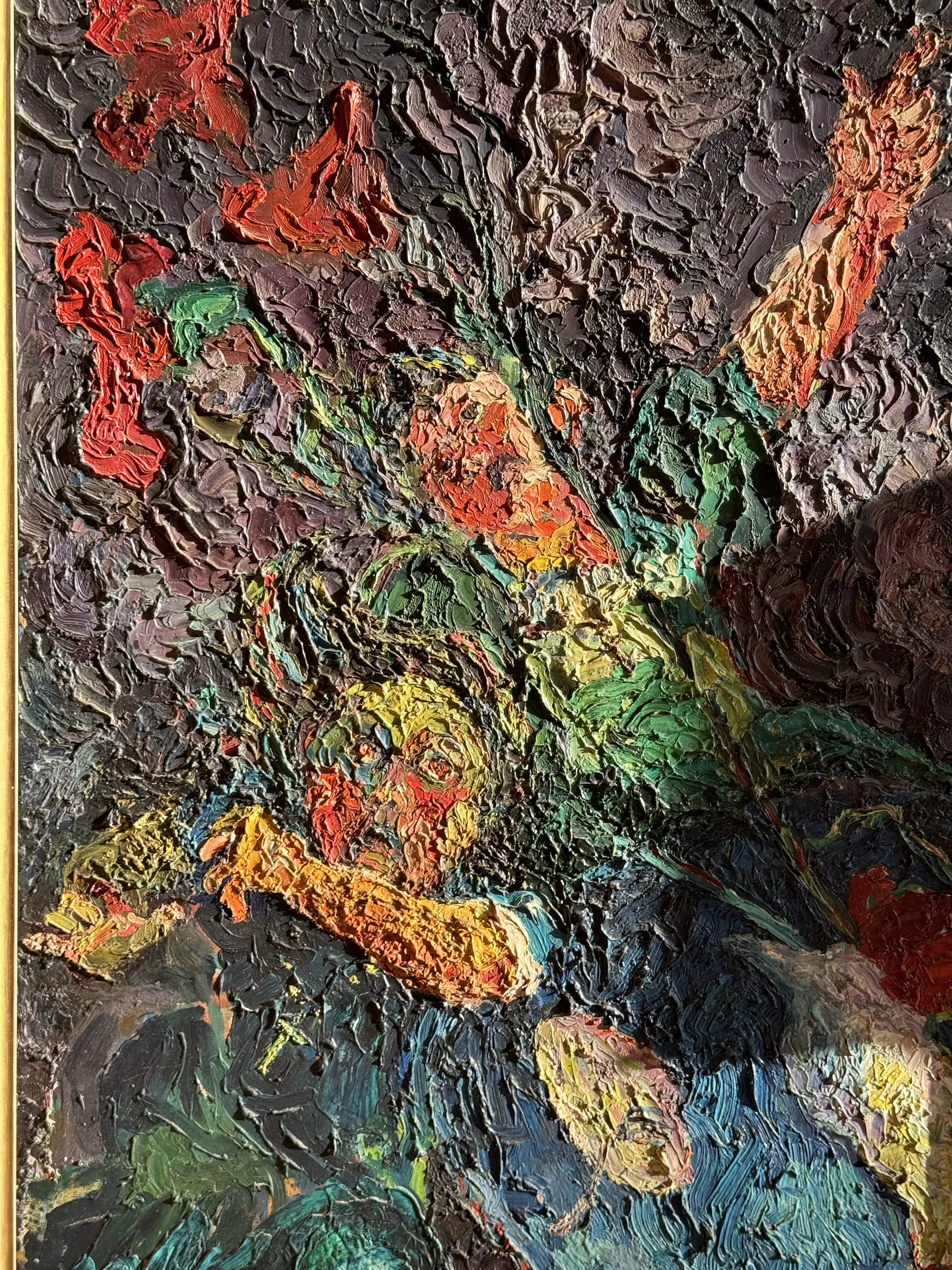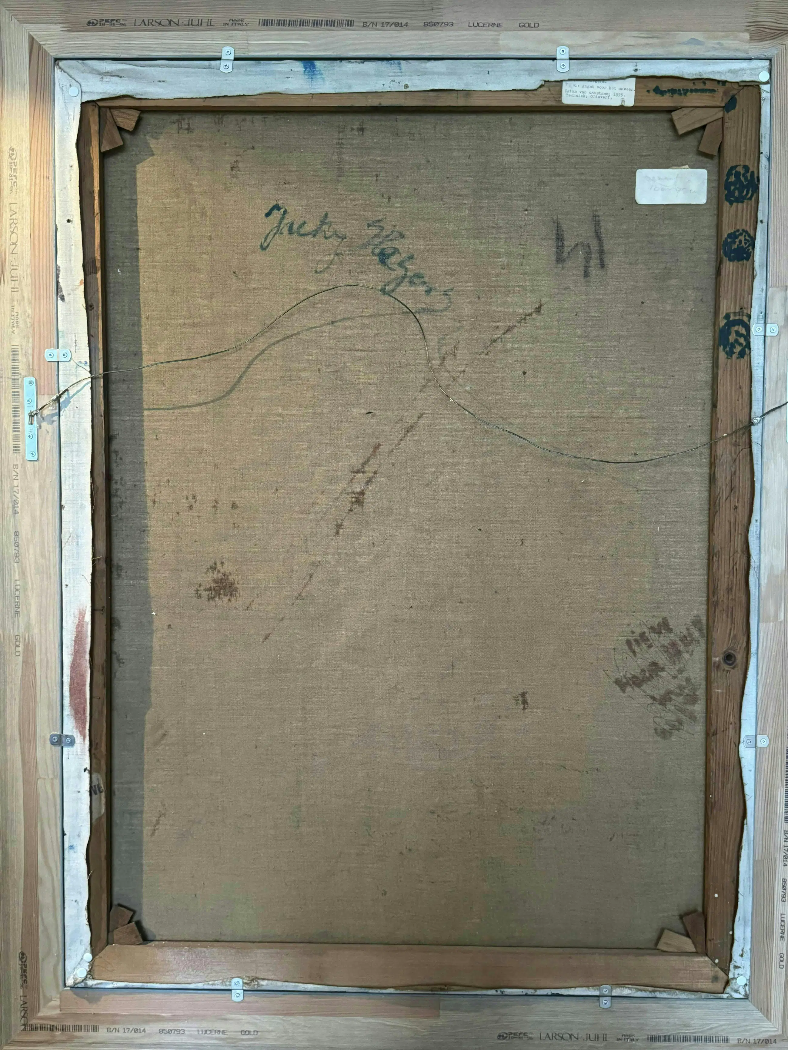 Kleurrijk museaal schilderij uit 1955 van de Eindhovense kunstenaar Jacques Slegers (1936-2000): 'Angst voor het onweer' (verso gesigneerd). Hoewel tegenwoordig misschien wat in vergetelheid geraakt, gold Slegers in zijn tijd als een belangrijke kunstenaar, hetgeen ook blijkt uit de overheids-opdrachten (zie foto stadsfontein). In zijn latere werk schoof hij op richting abstractie, maar het aangeboden werk stamt nog bij uitstek uit zijn vroege(re) expressionistische fase: de jaren '50 van de vorige eeuw. Zijn schilderstijl in die periode vertoont verwantschap met het werk van Oskar Kokoschka. De pasteus aangebrachte olieverf toont een prachtig coloriet. Het is een volumineus schilderij (100 x 75 cm) en verkeert in perfecte staat. Het doek is gevat in een dure goud- en bronskleurige lijst. Al met al een zeer waardevaste investering in een belangwekkend stuk beeldende kunst. Gelet op grootte en gewicht van het schilderij zelf ophalen of laten bezorgen (bijv. door Brenger).
