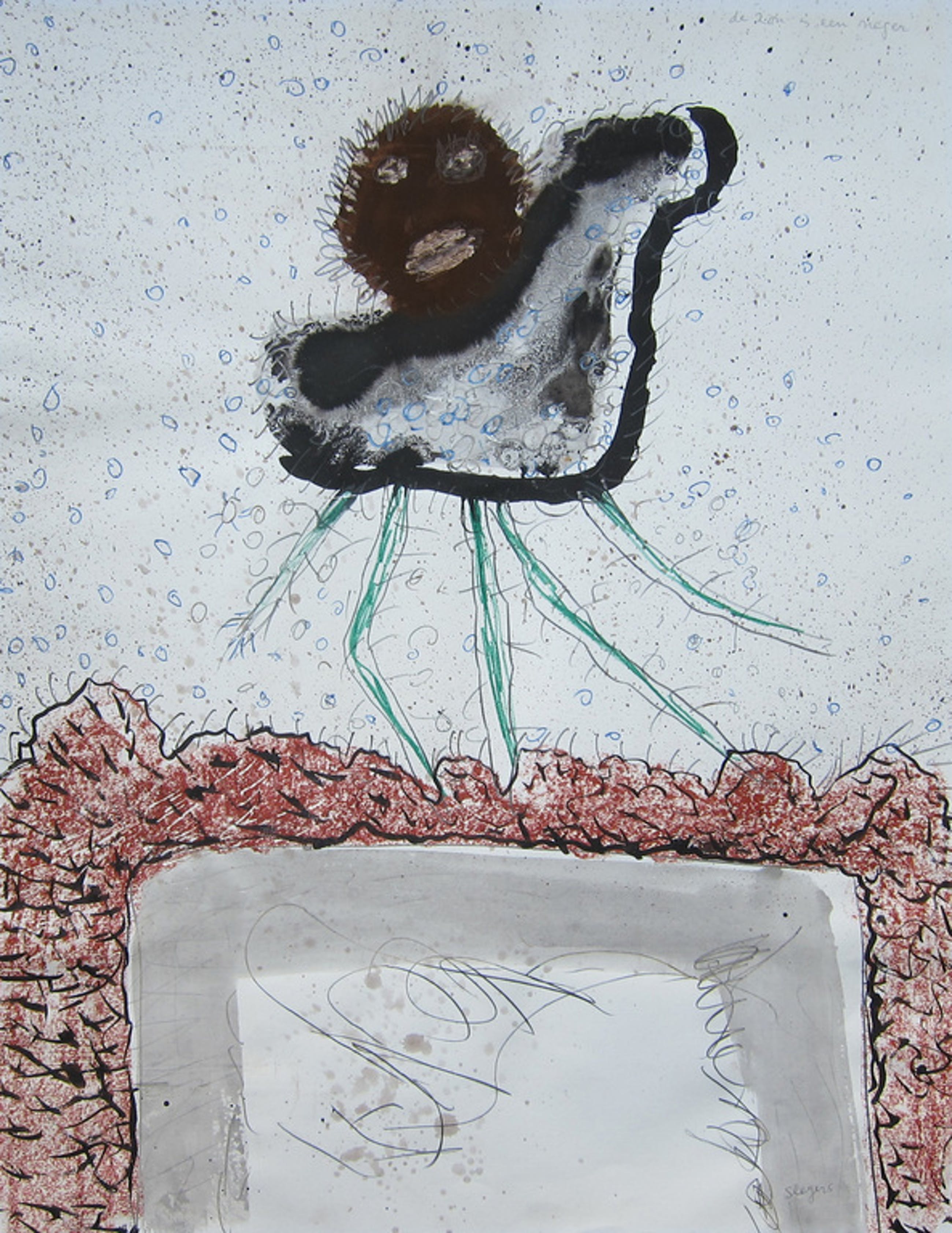 Groot formaat/tekeninge /gouache van de in 2000 op 63 jarige leeftijd overleden Jacques Slegers uit 1984. Slegers is zijn hele leven trouw gebleven aan zijn eigen stijl. Expressionistisch maar vol fantasie en uniek.