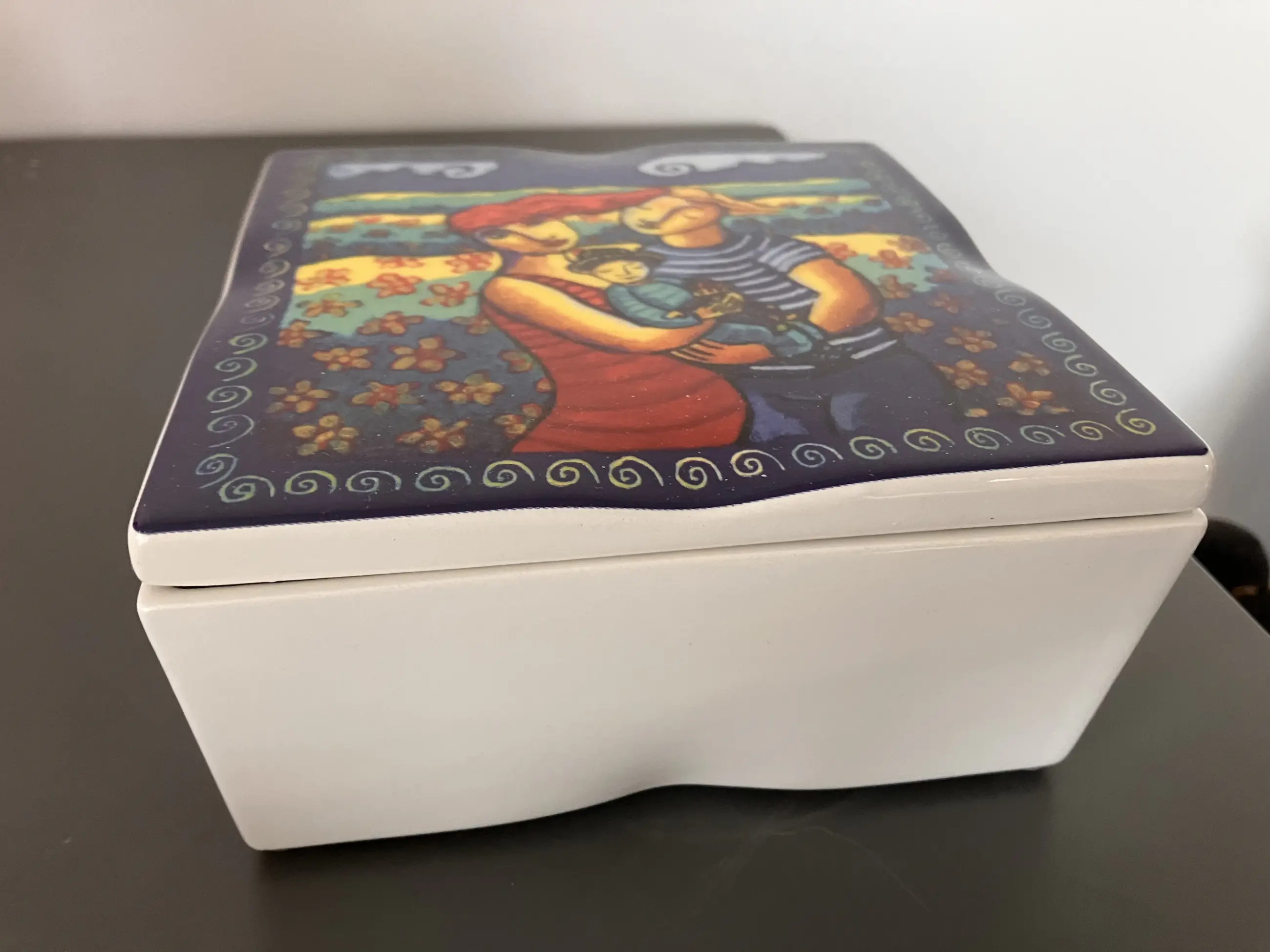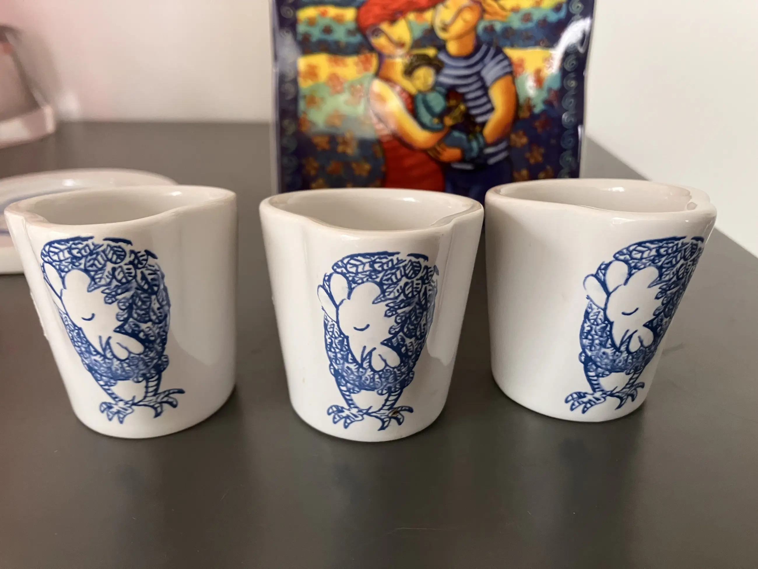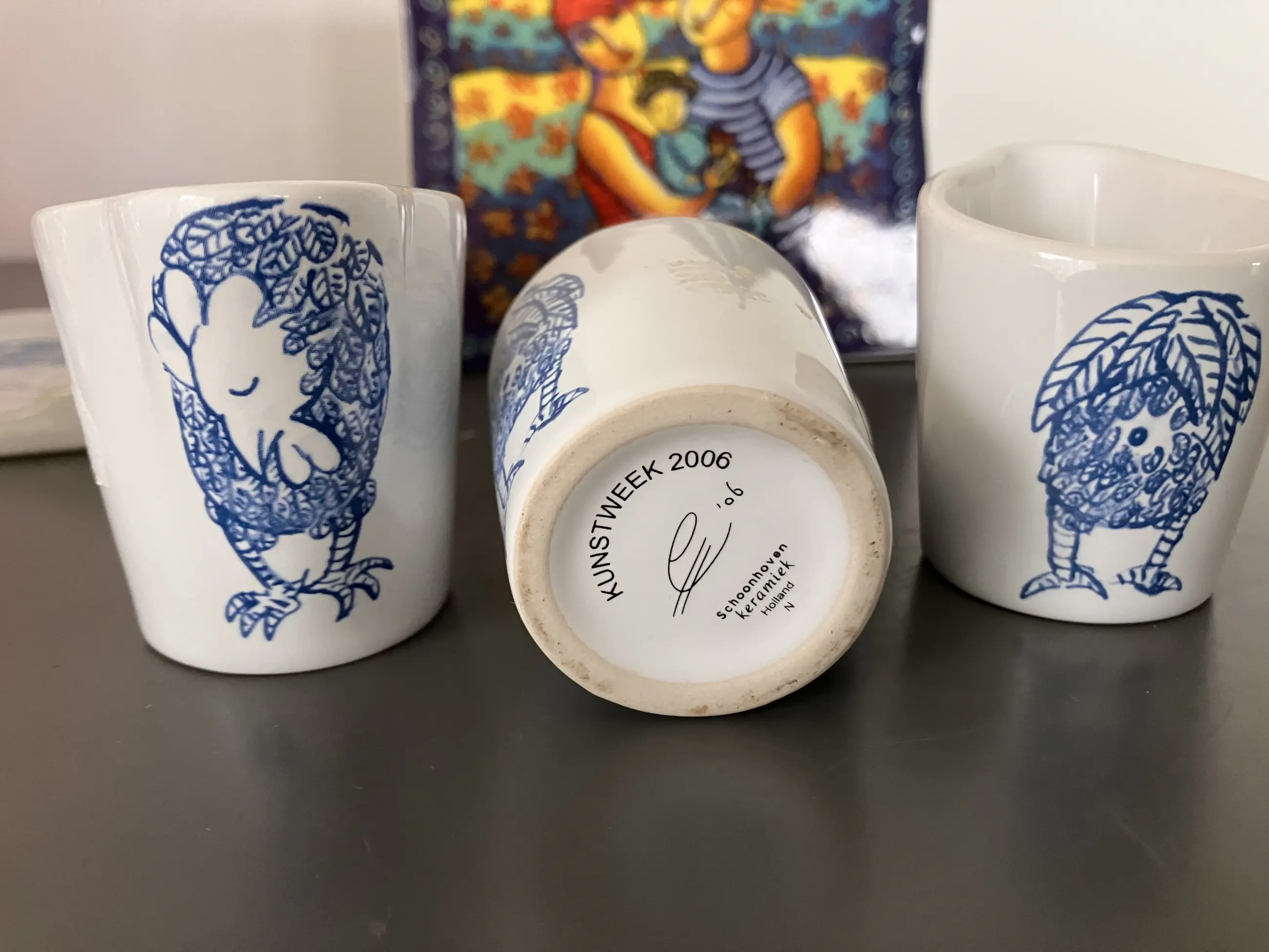Dekseldoos: Family, feeling, fine 2005 Eierdopjes Kunstweek 2006 , 5x Onderzetter Kunstweek 2006 Alle items gesigneerd en gemaakt bij Schoonhoven Keramiek