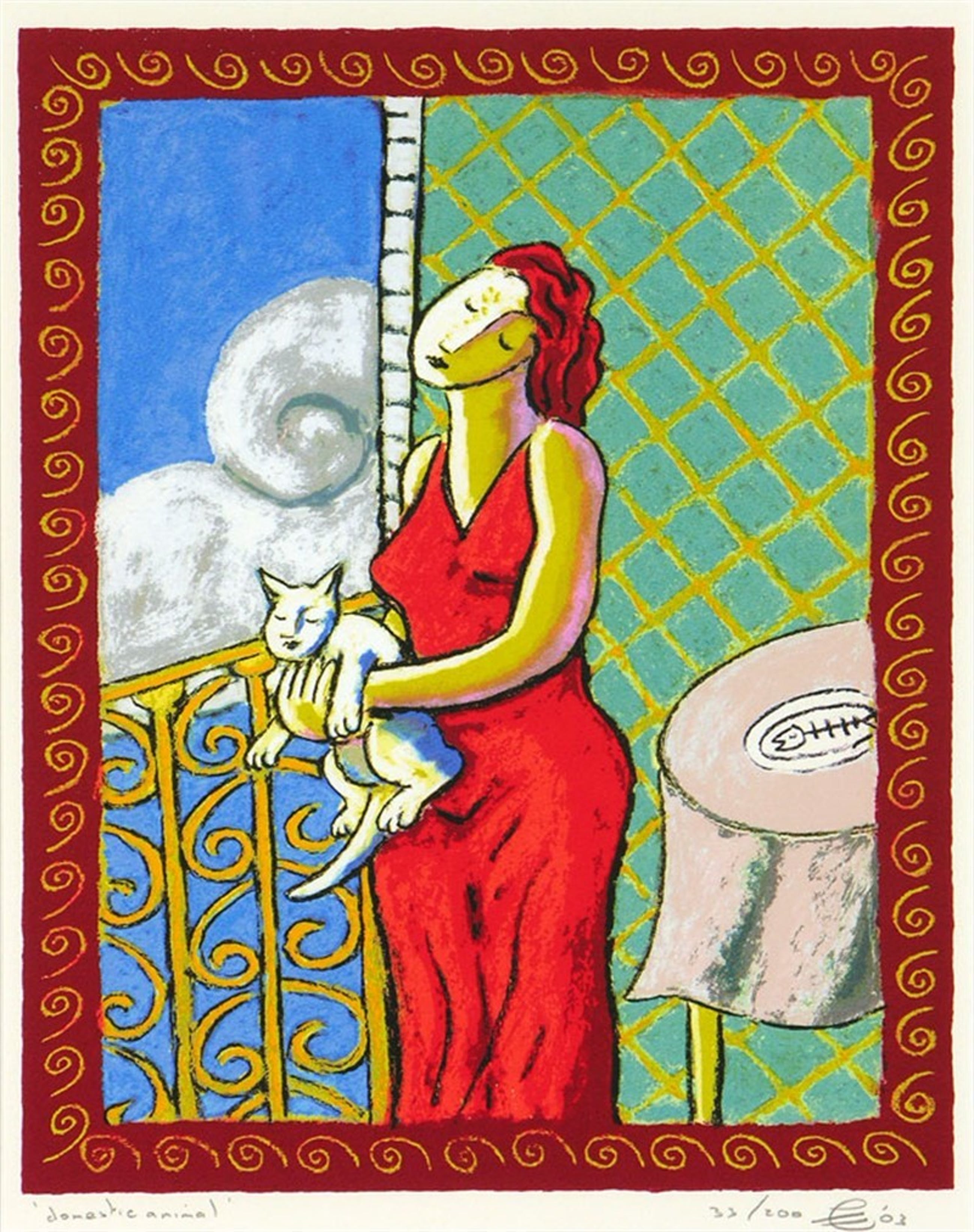 Titel:Domestic animalTechniek:LithografieIngelijst: Signatuur: OndertekendUitgave:Origineel, 35/200 (kan afwijken van foto)Staat:GoedPeriode:2003