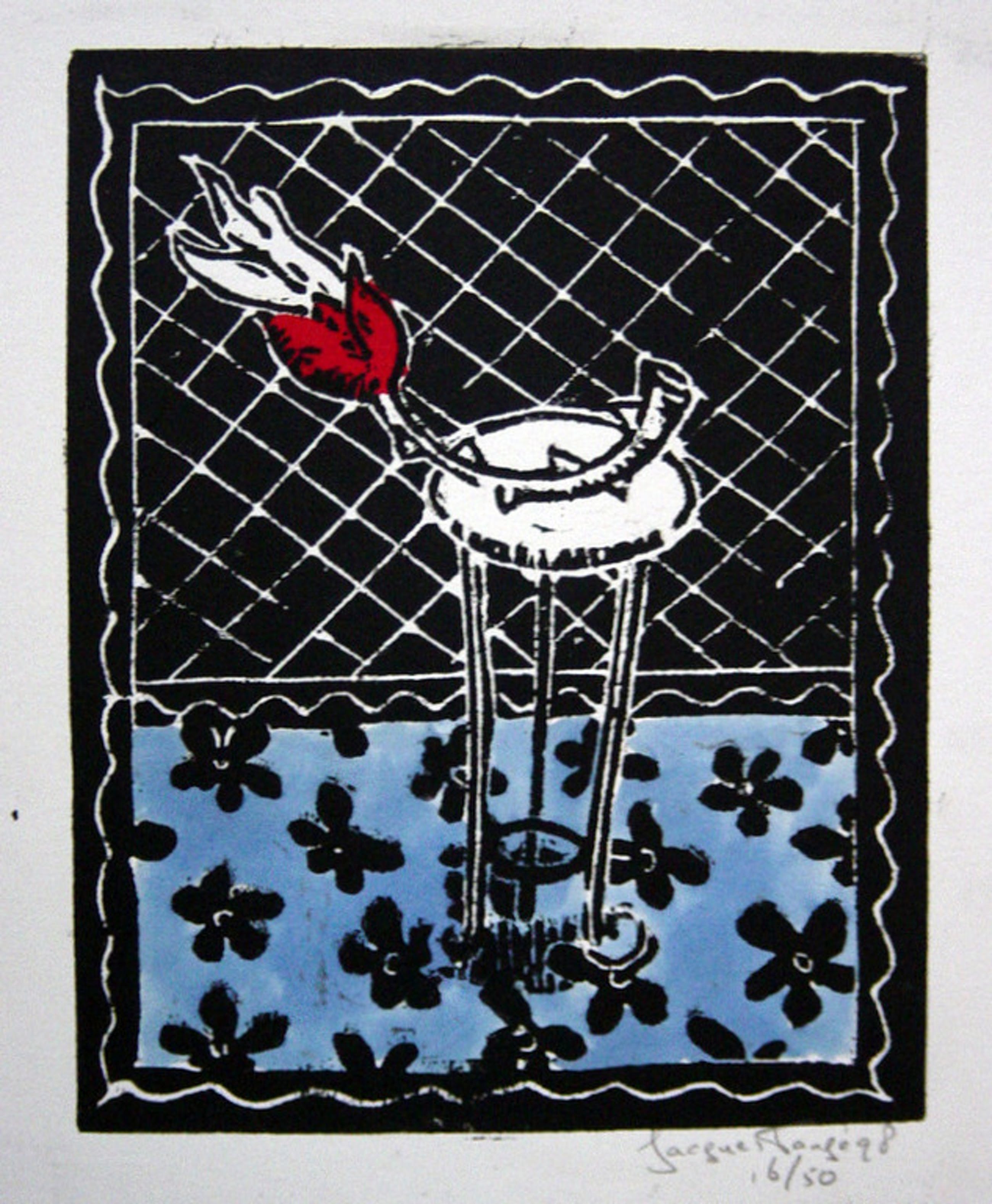 Afmeting 23x19 cm. Deze linoleumsnede is eerst afgedrukt en daarna met aquarelverf bewerkt. Het aangeboden kunstwerk is nr 16/50 en is nooit ingelijst geweest.