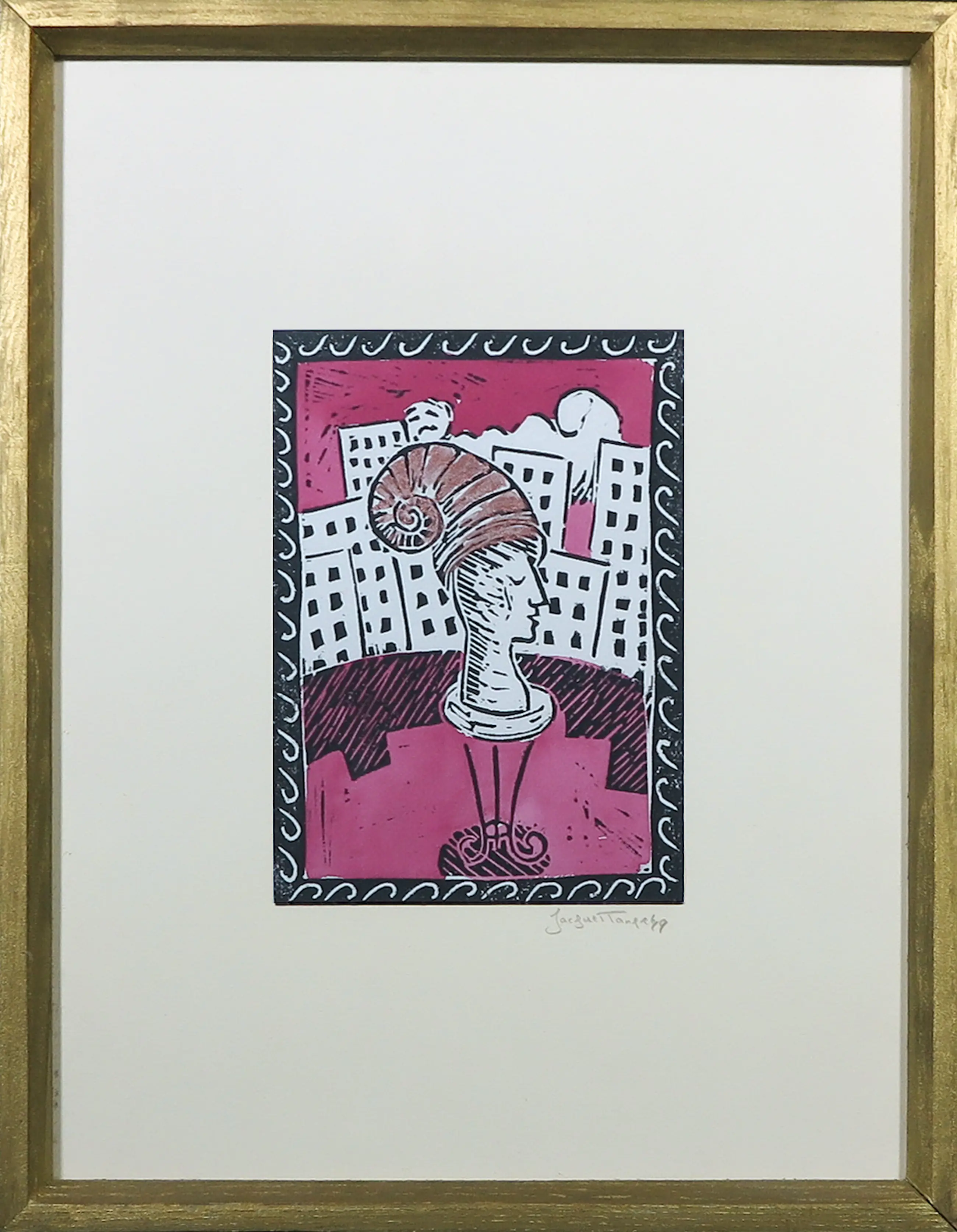 Handbewerkte Grafiek van Jacques Tange in een bijzondere goudgeverfde lijst.