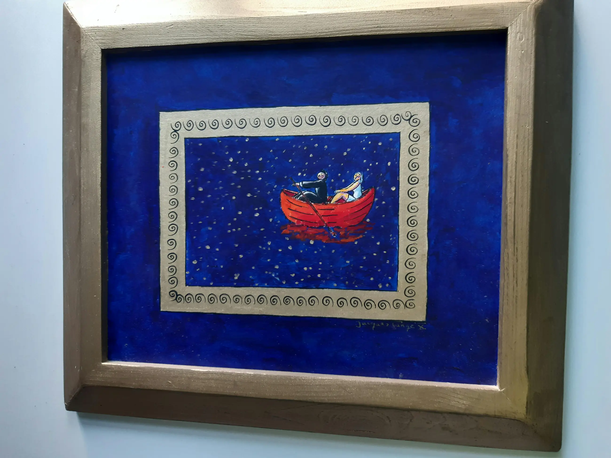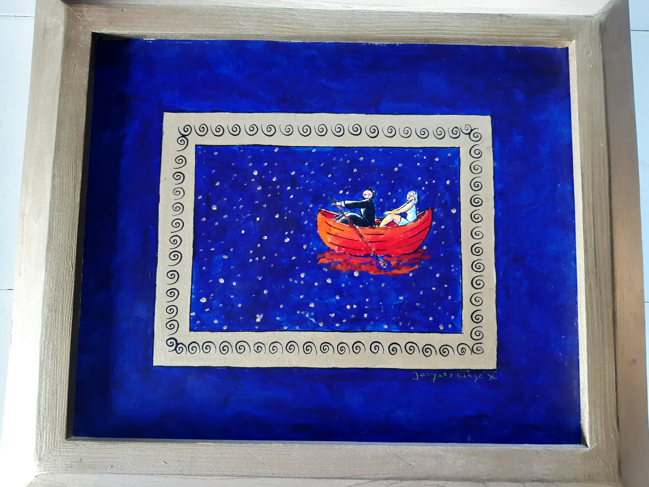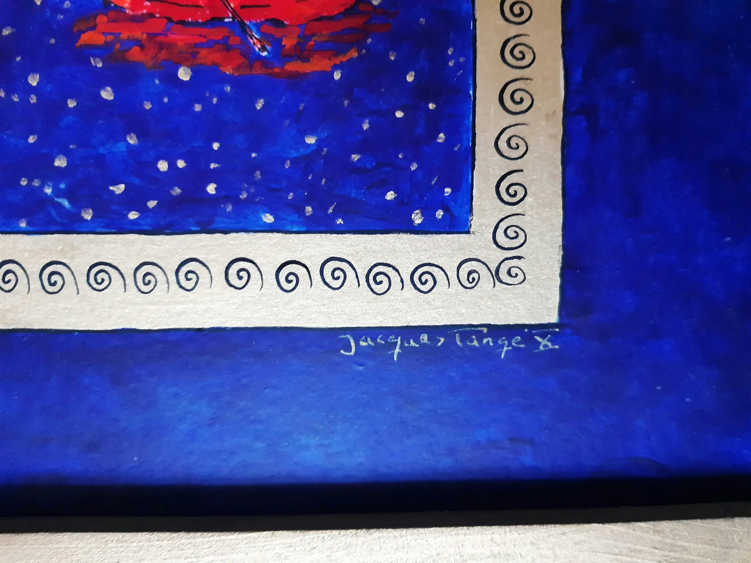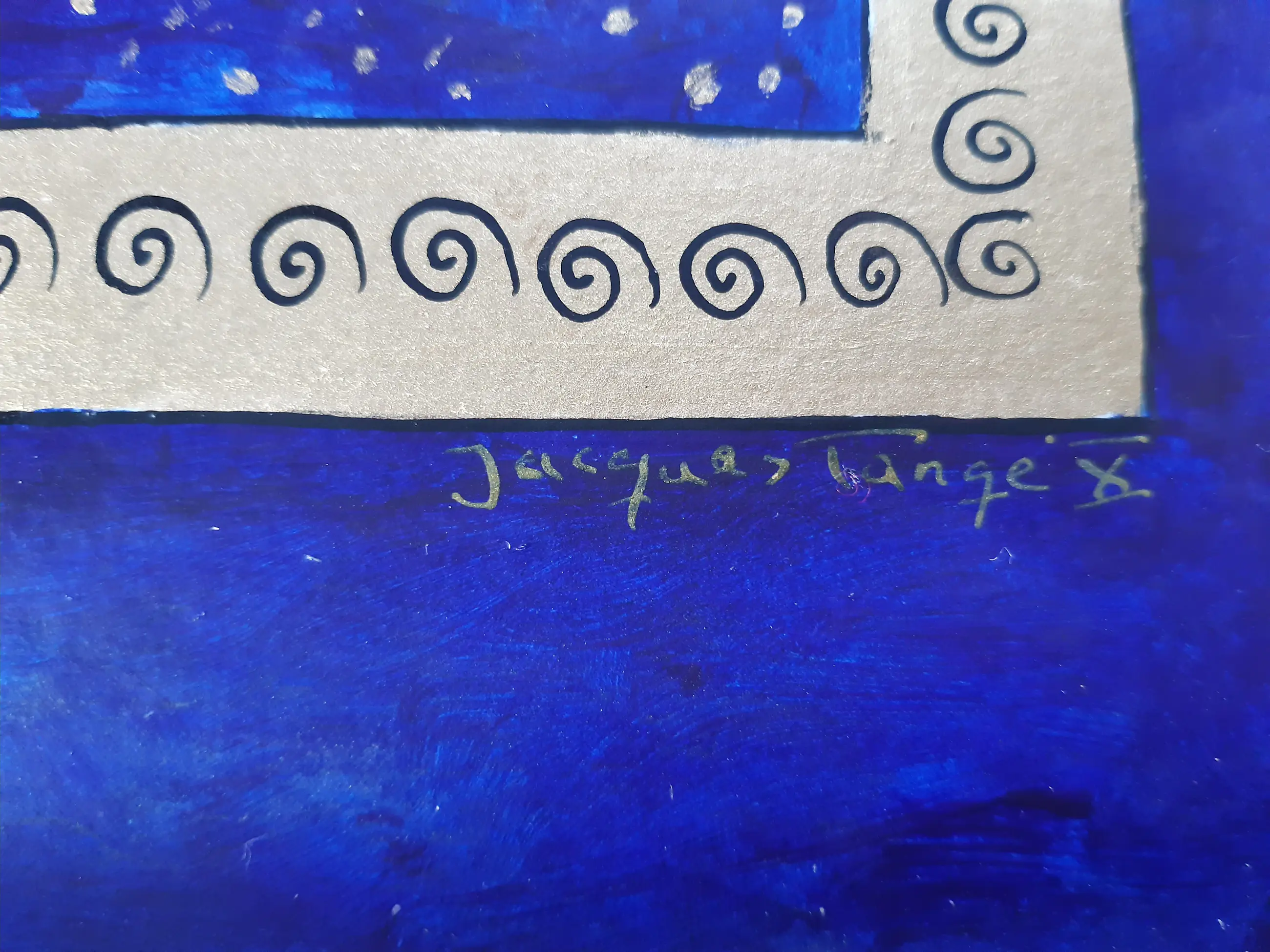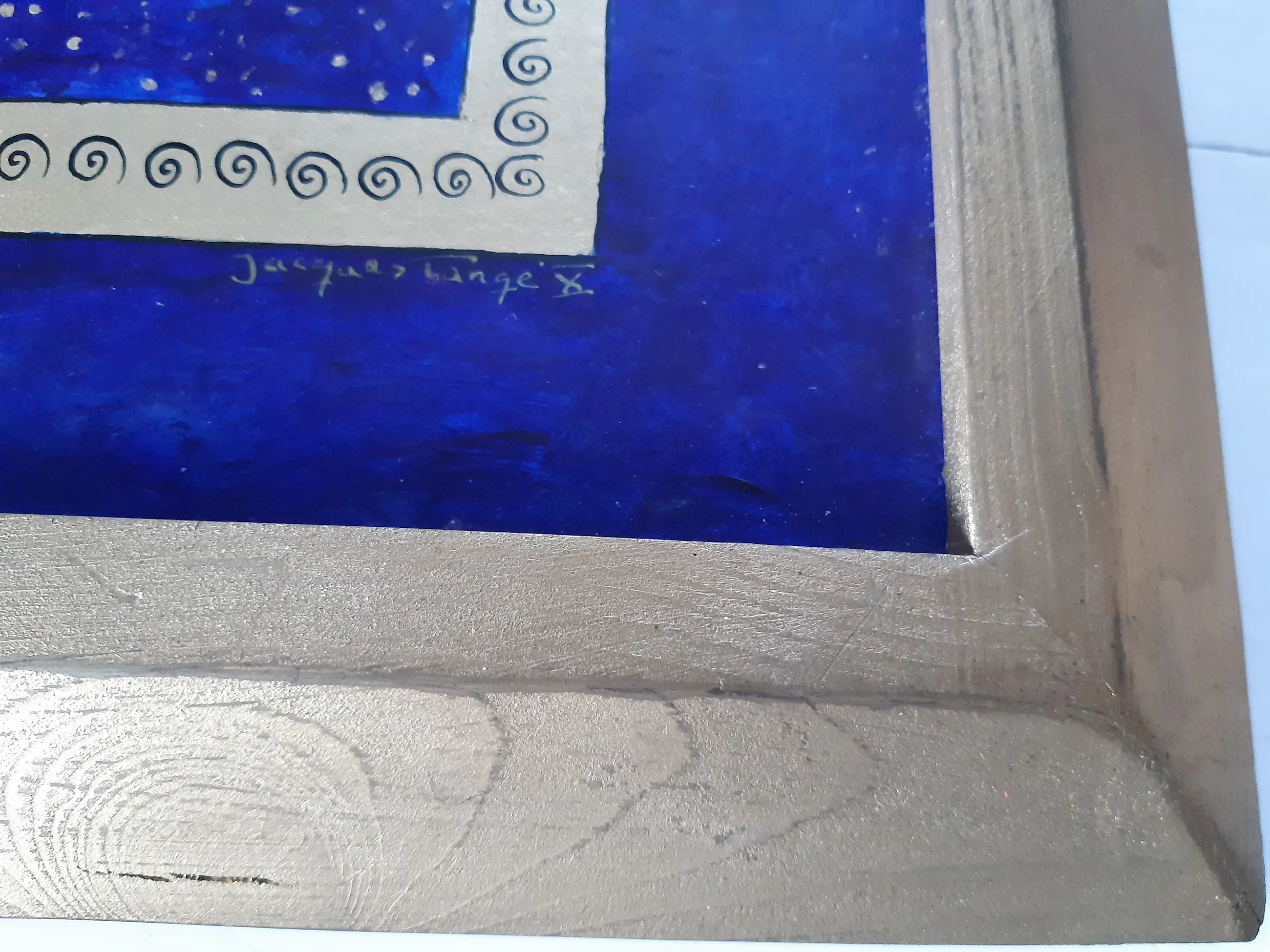 Uniek werk van Jacques Tange uit 2010 Zowel voor als achter gesigneerd Gouden houten lijst (zelfde kleur als goud gebruikt in het schilderij)