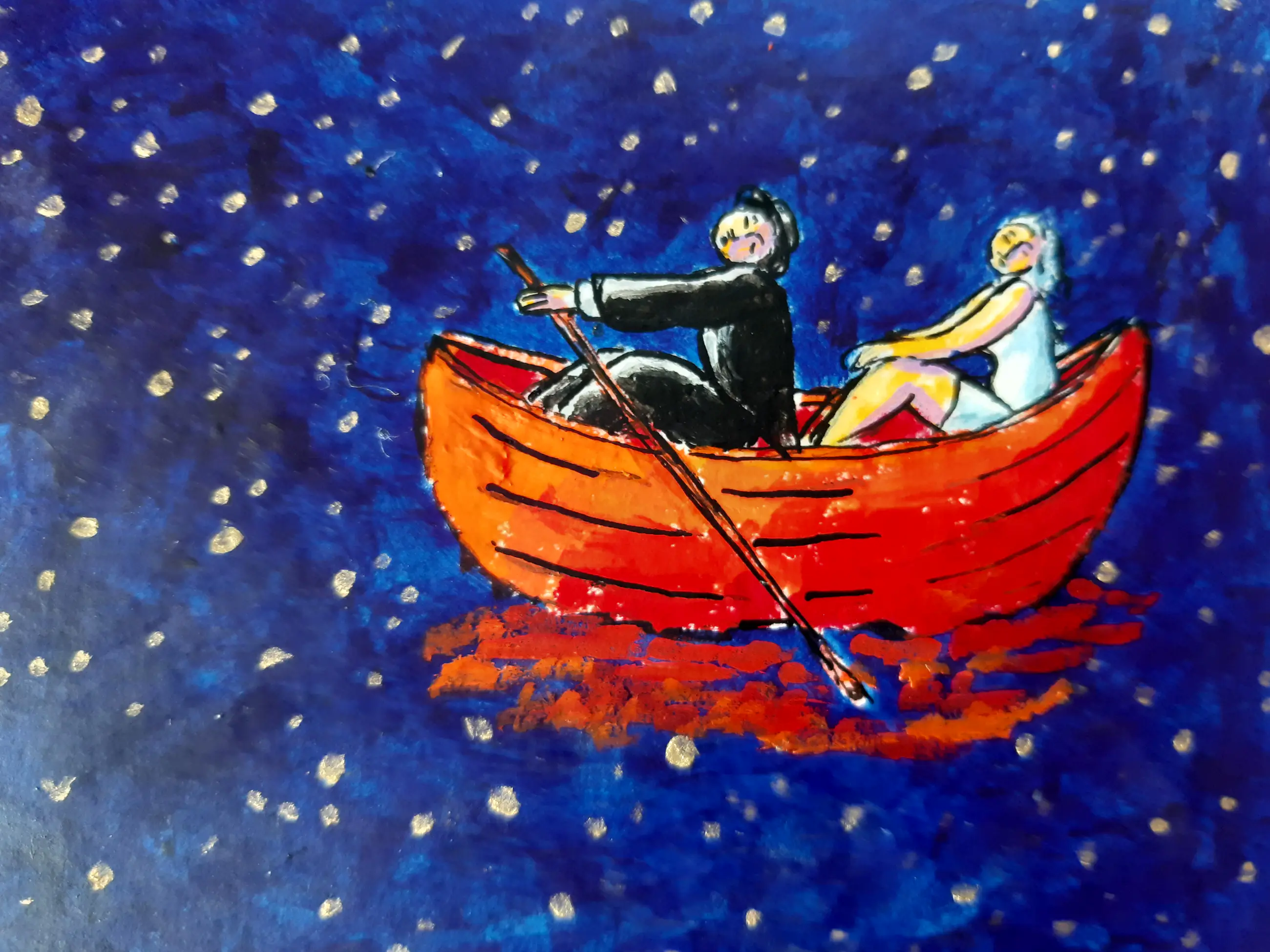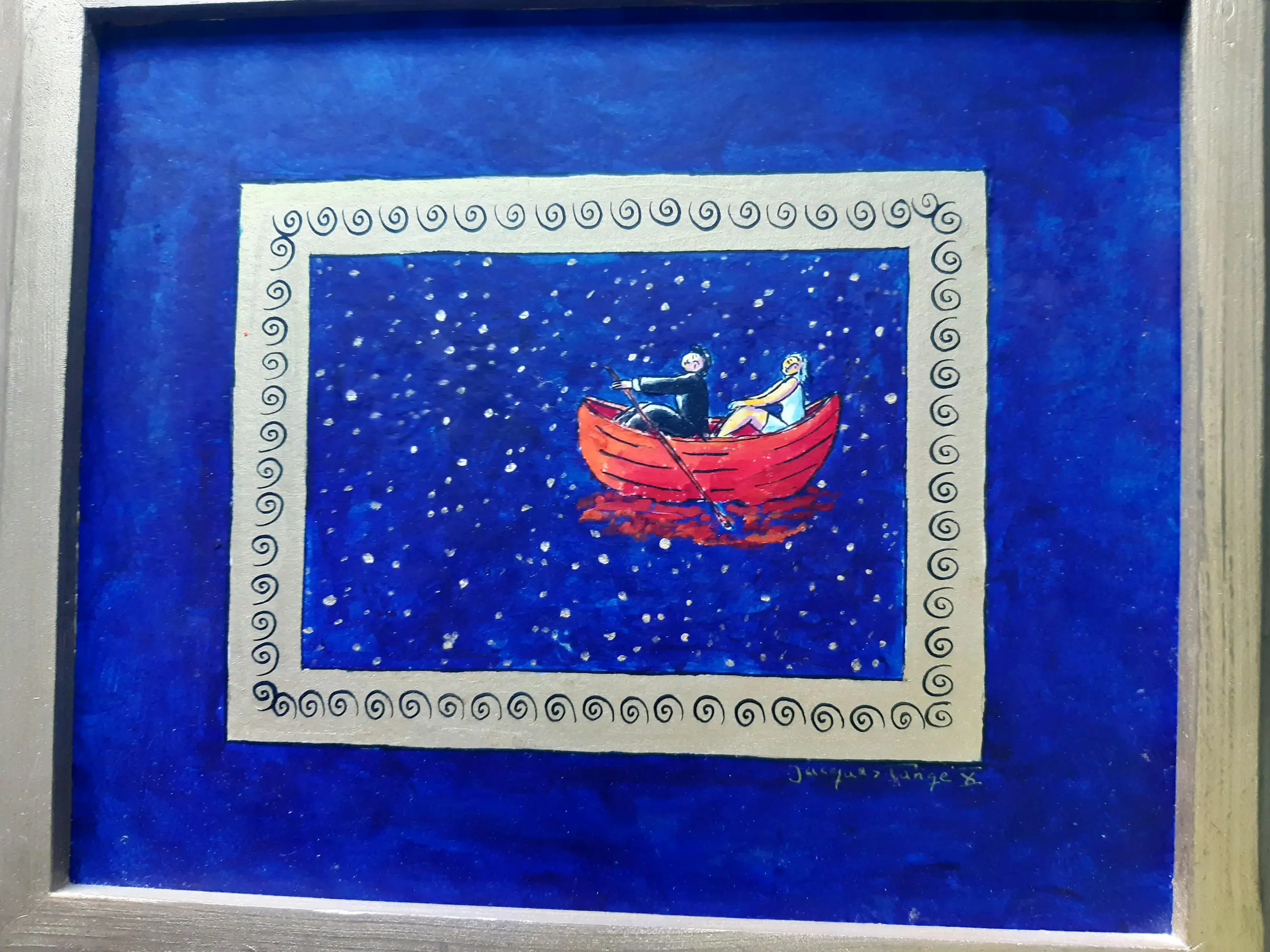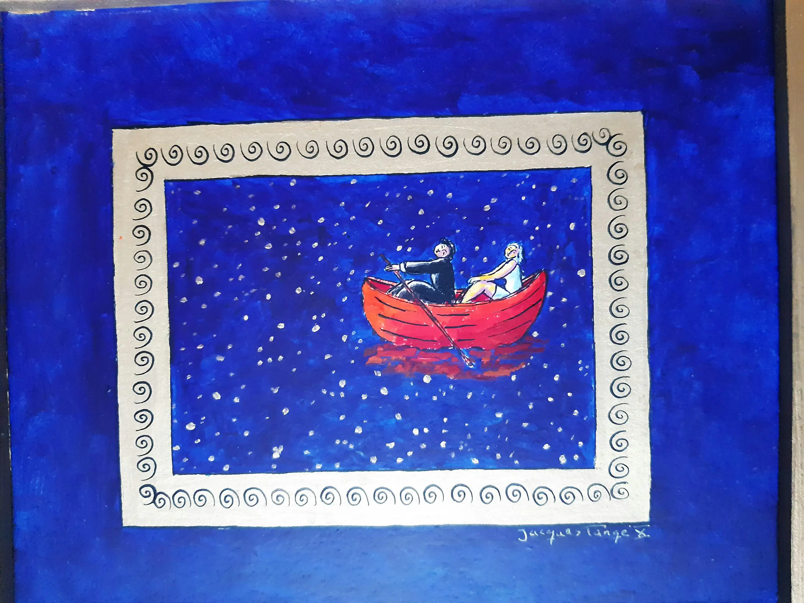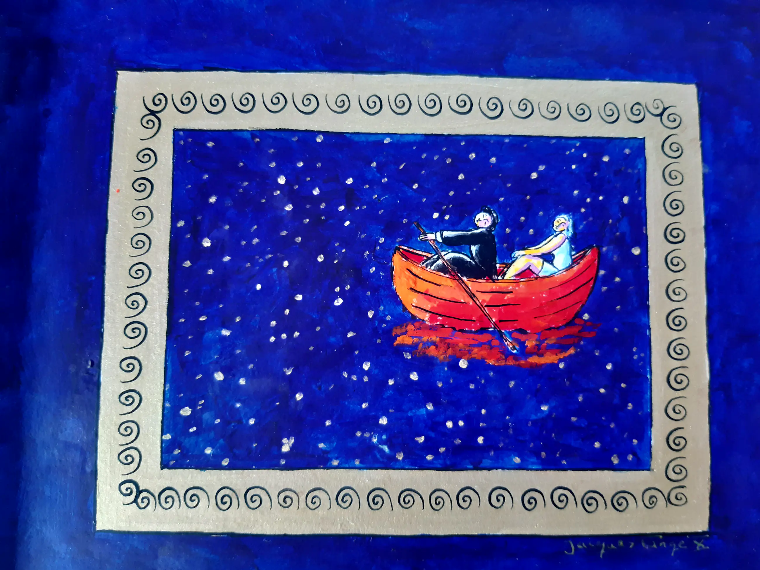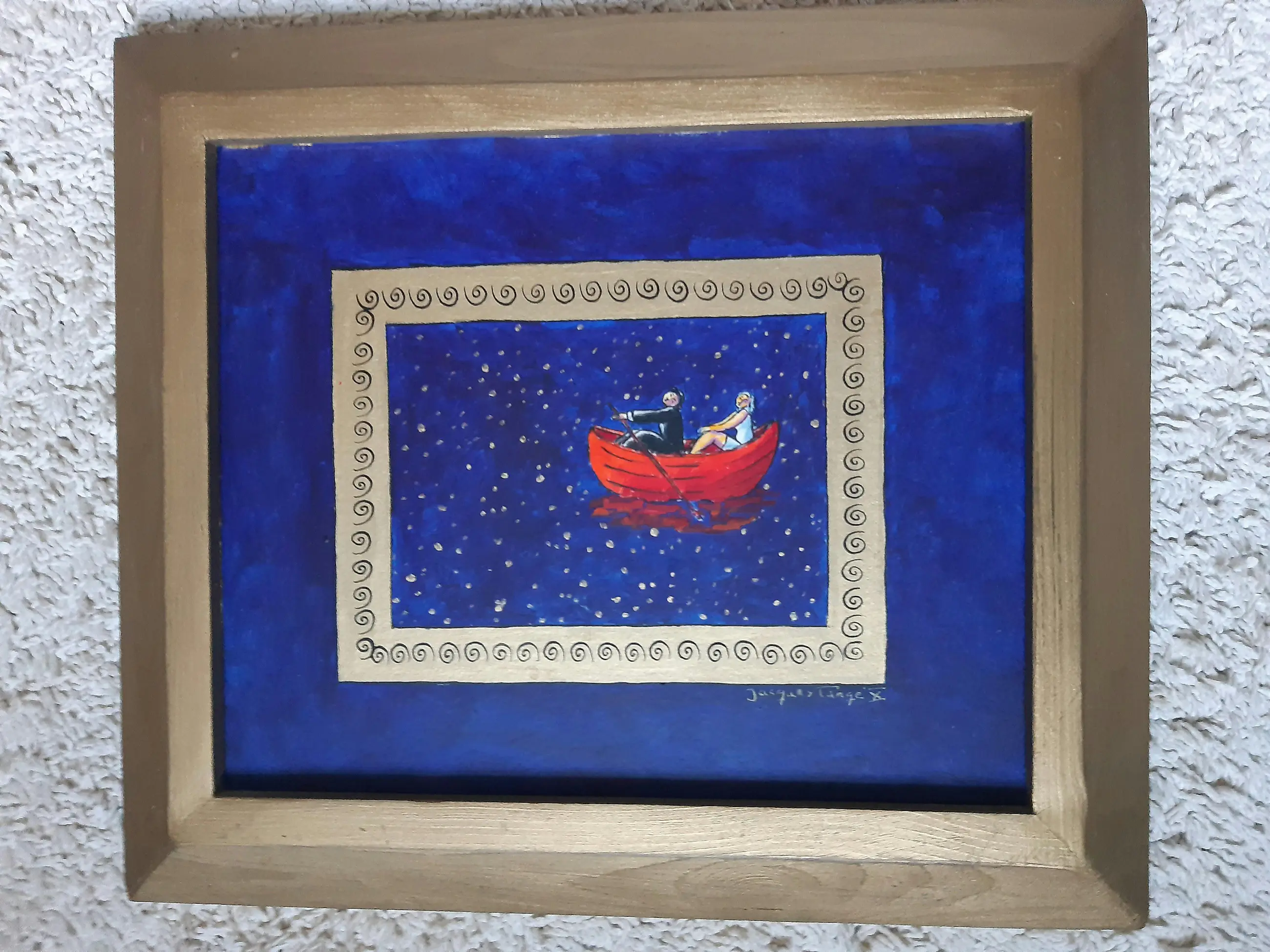 Uniek werk van Jacques Tange uit 2010 Zowel voor als achter gesigneerd Gouden houten lijst (zelfde kleur als goud gebruikt in het schilderij)