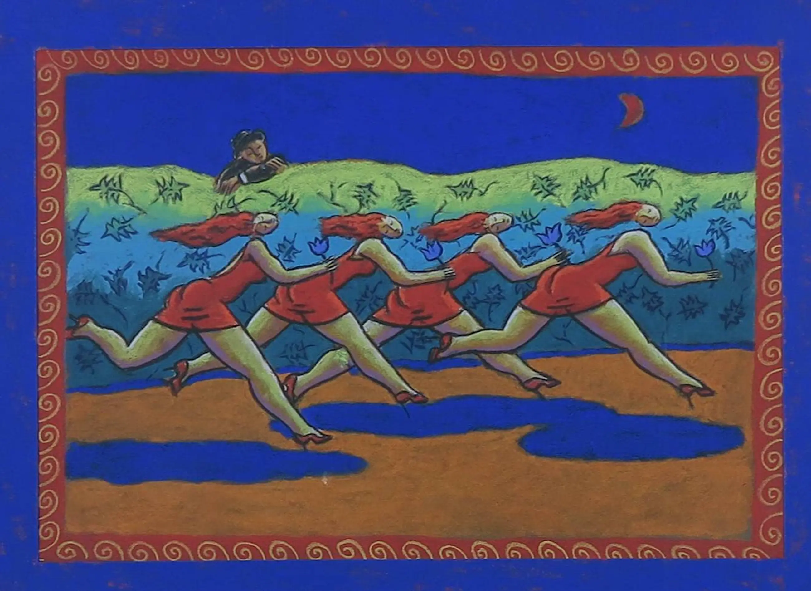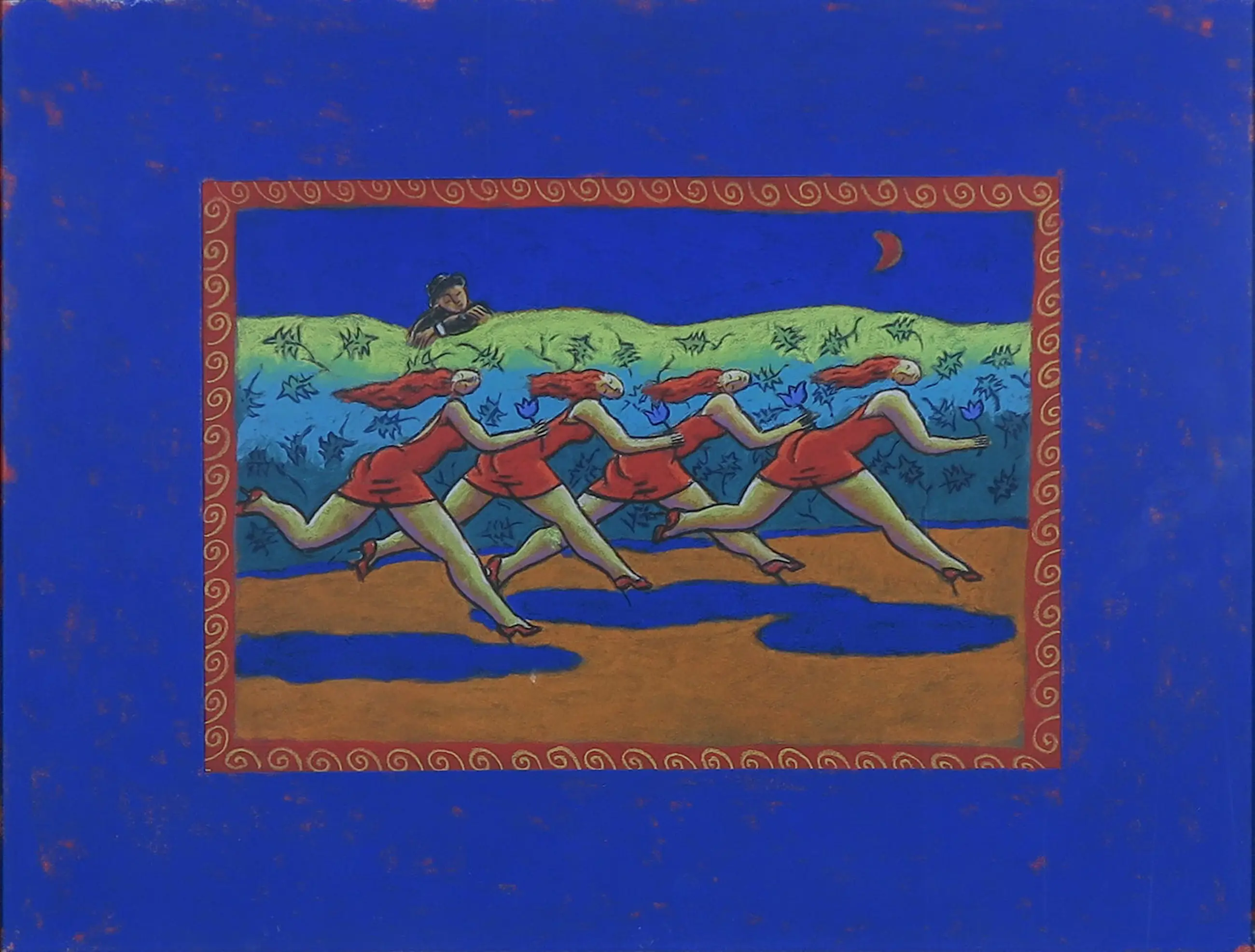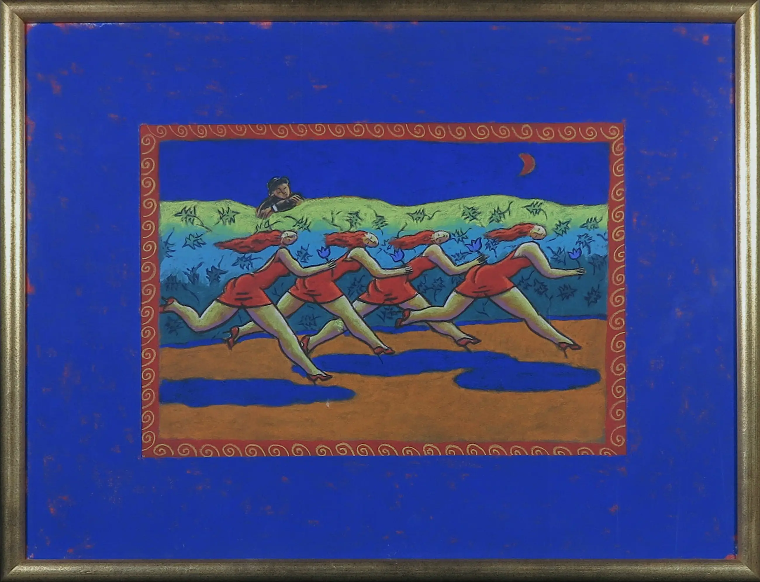 Werkelijk prachtig werk van Jacques Tange met een diepe, rijke blauwe kleur waar het passe-partout ook aan deelneemt met dynamische rennende dames in rood.