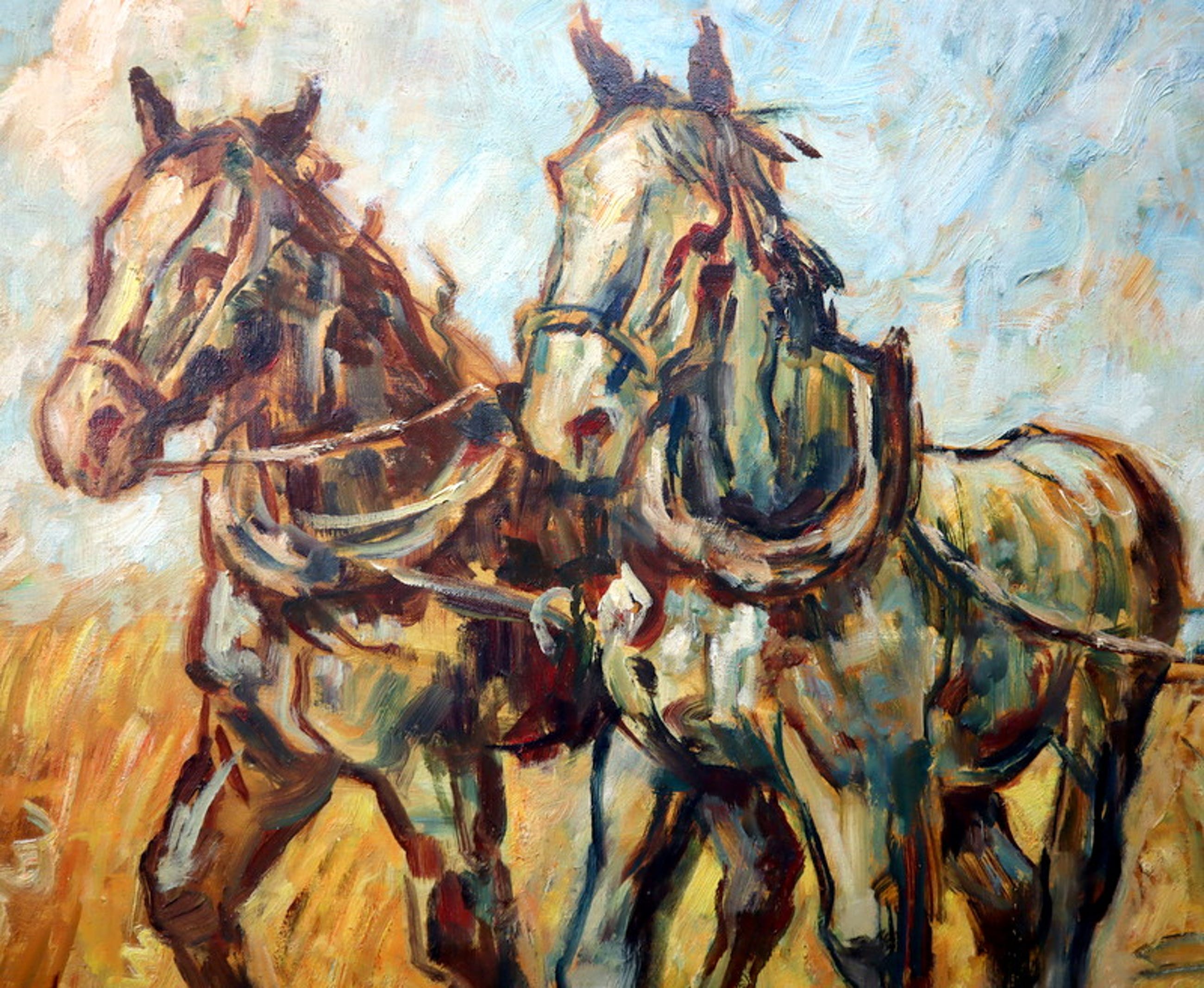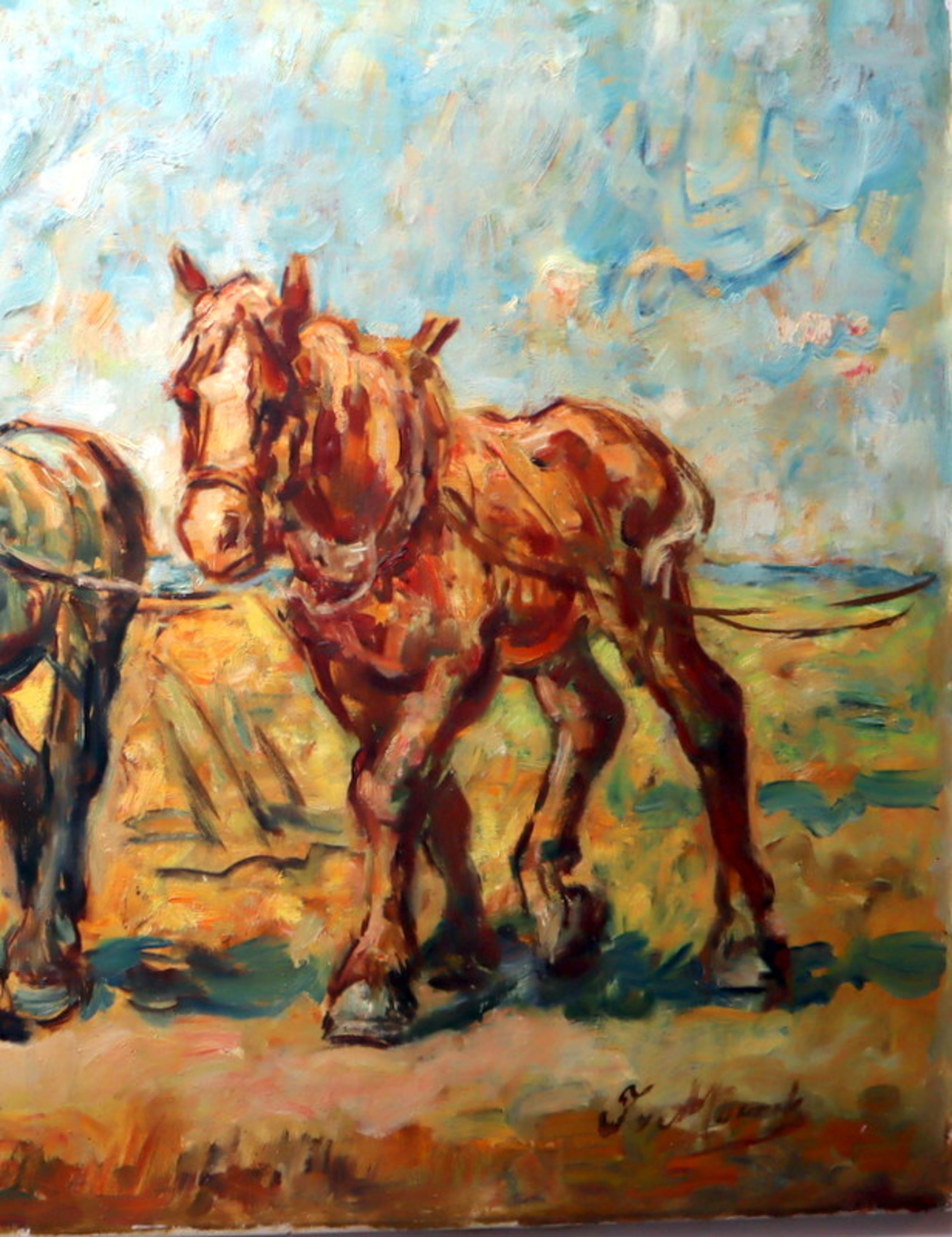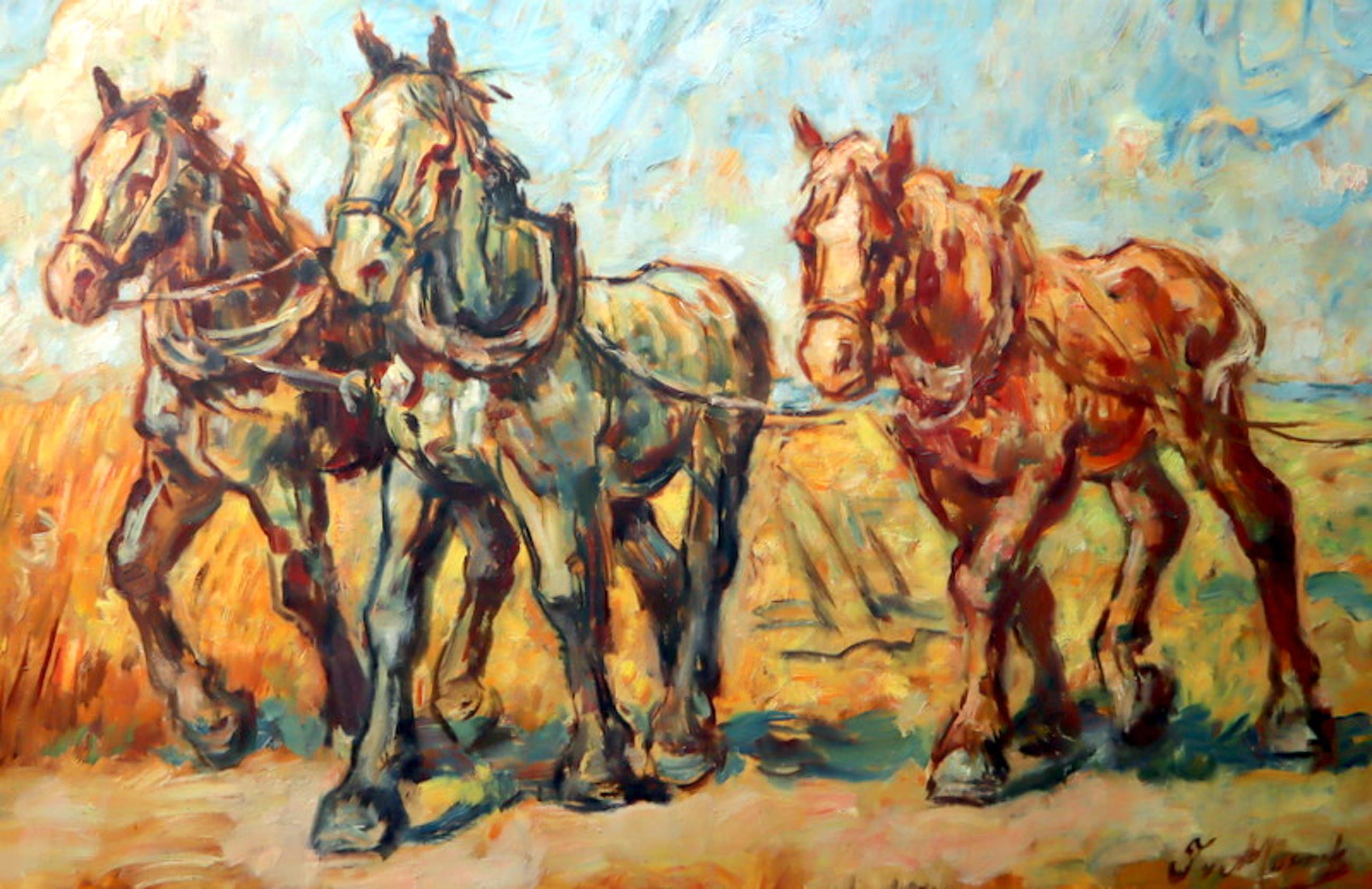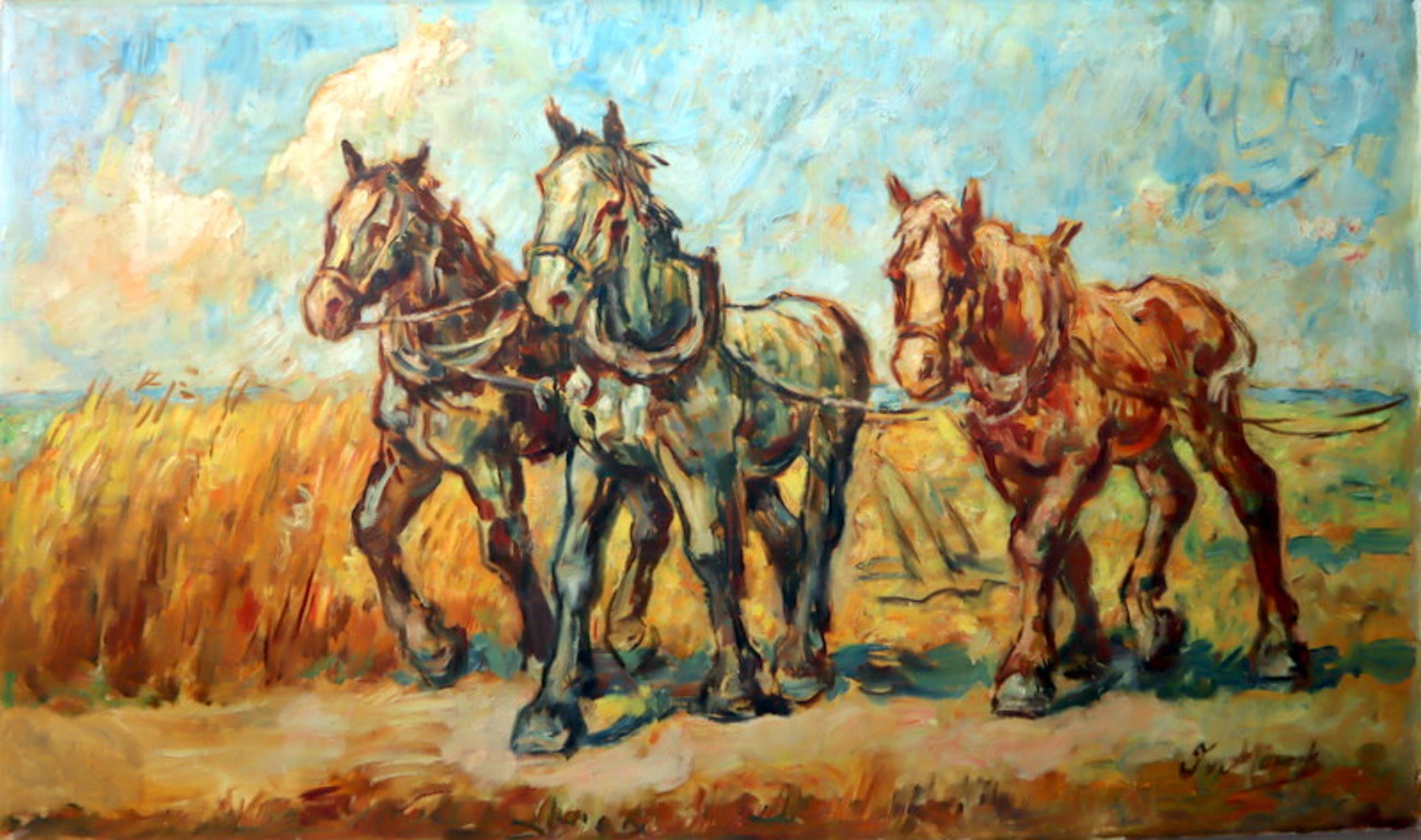 Een groot formaat olieverf schilderij op doek. Afbeelding met drie trekpaarden aan het werk op het land. Hand gesigneerd in de rechter beneden hoek met J v Mourik Heeft een scheurtje van ca. 5 cm. aan de linkerzijde (zie foto's). Met oude restauratie.