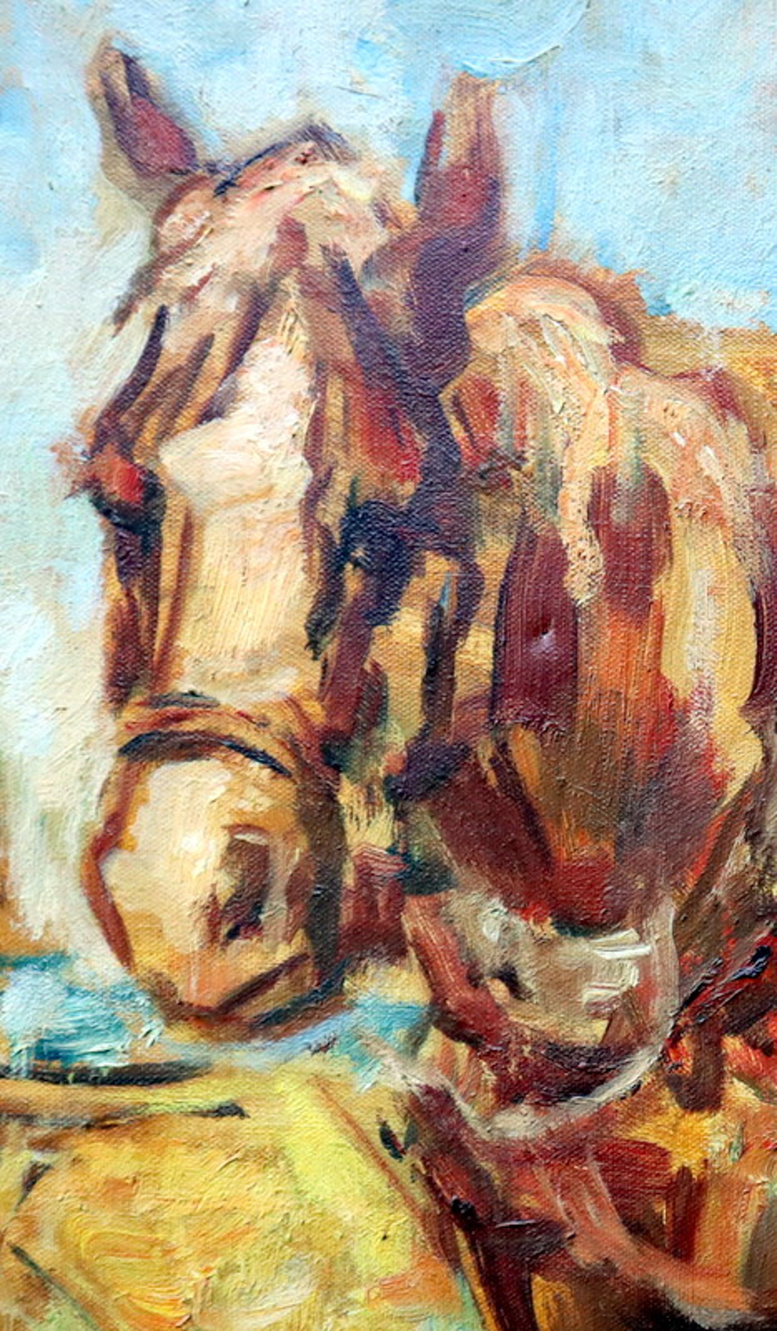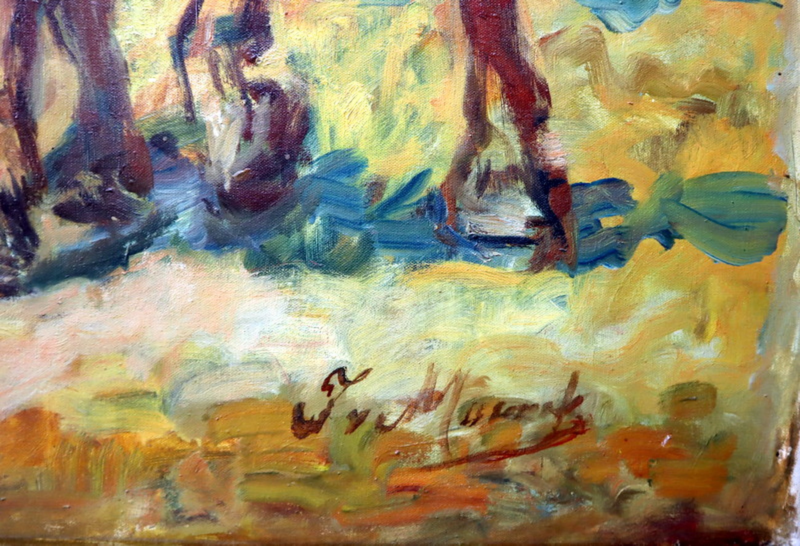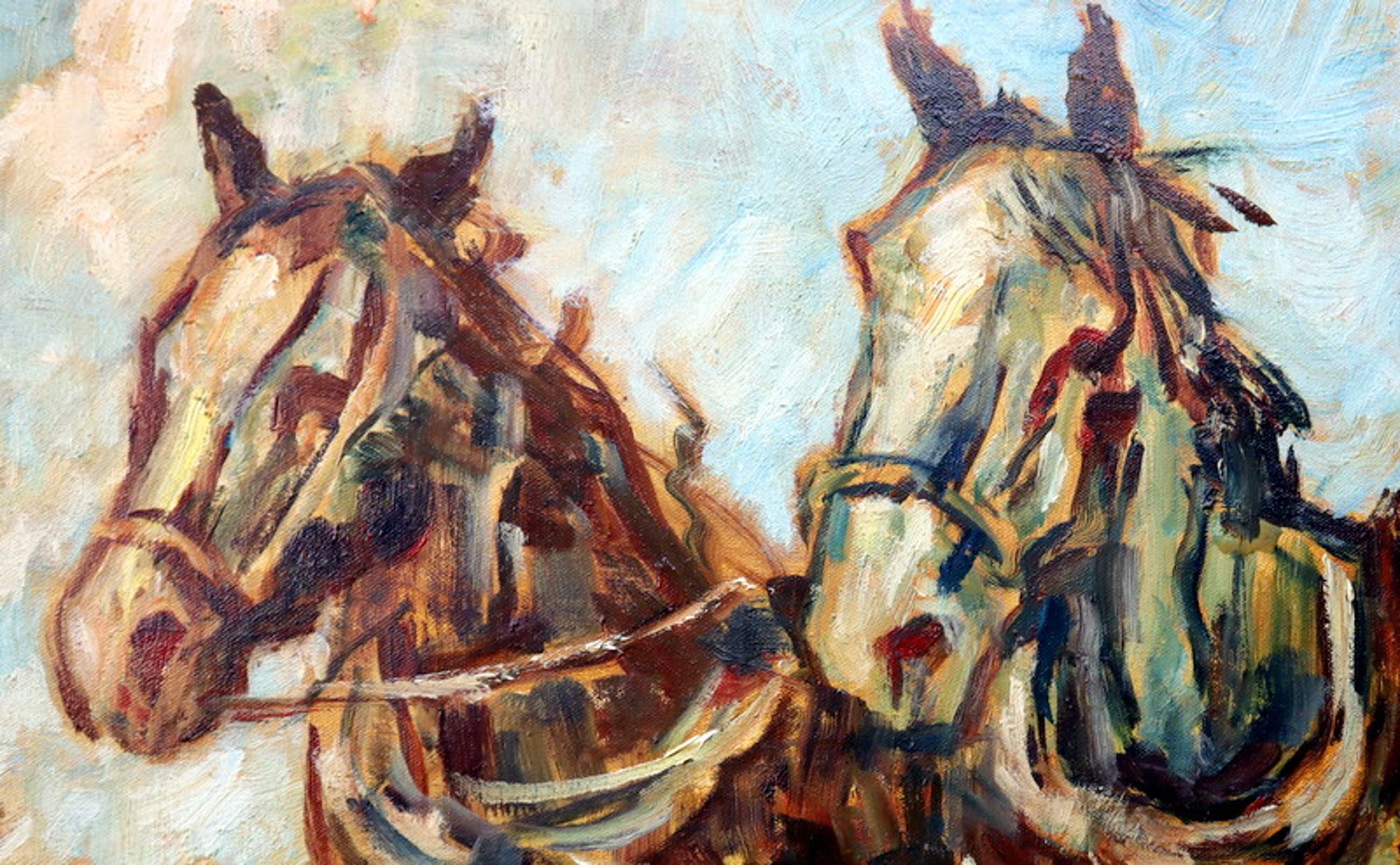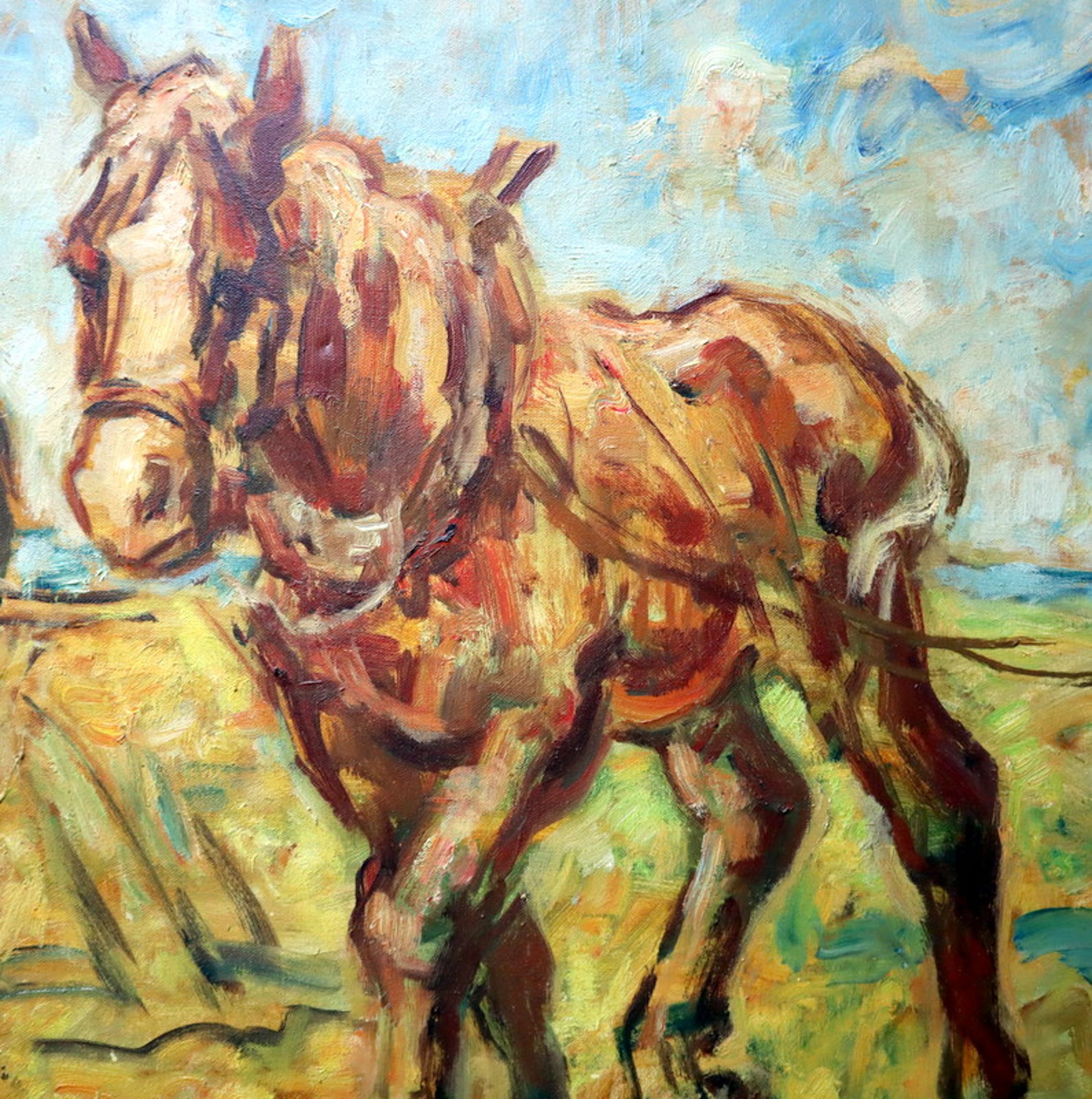 Een groot formaat olieverf schilderij op doek. Afbeelding met drie trekpaarden aan het werk op het land. Hand gesigneerd in de rechter beneden hoek met J v Mourik Heeft een scheurtje van ca. 5 cm. aan de linkerzijde (zie foto's). Met oude restauratie.