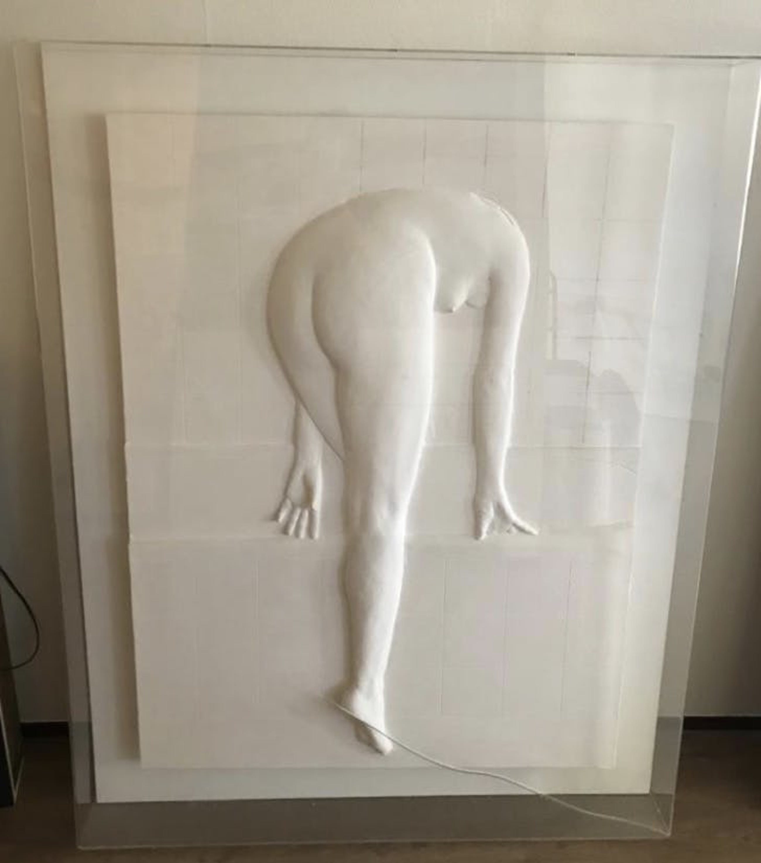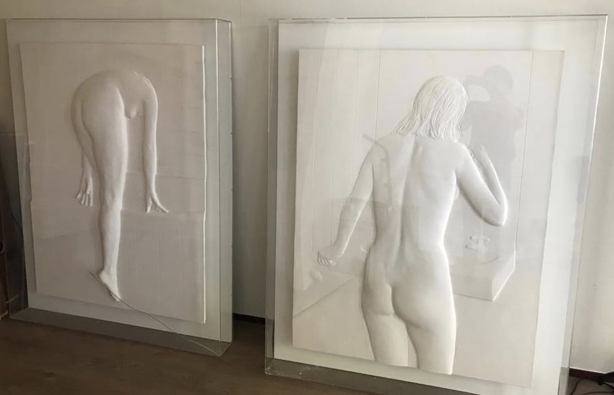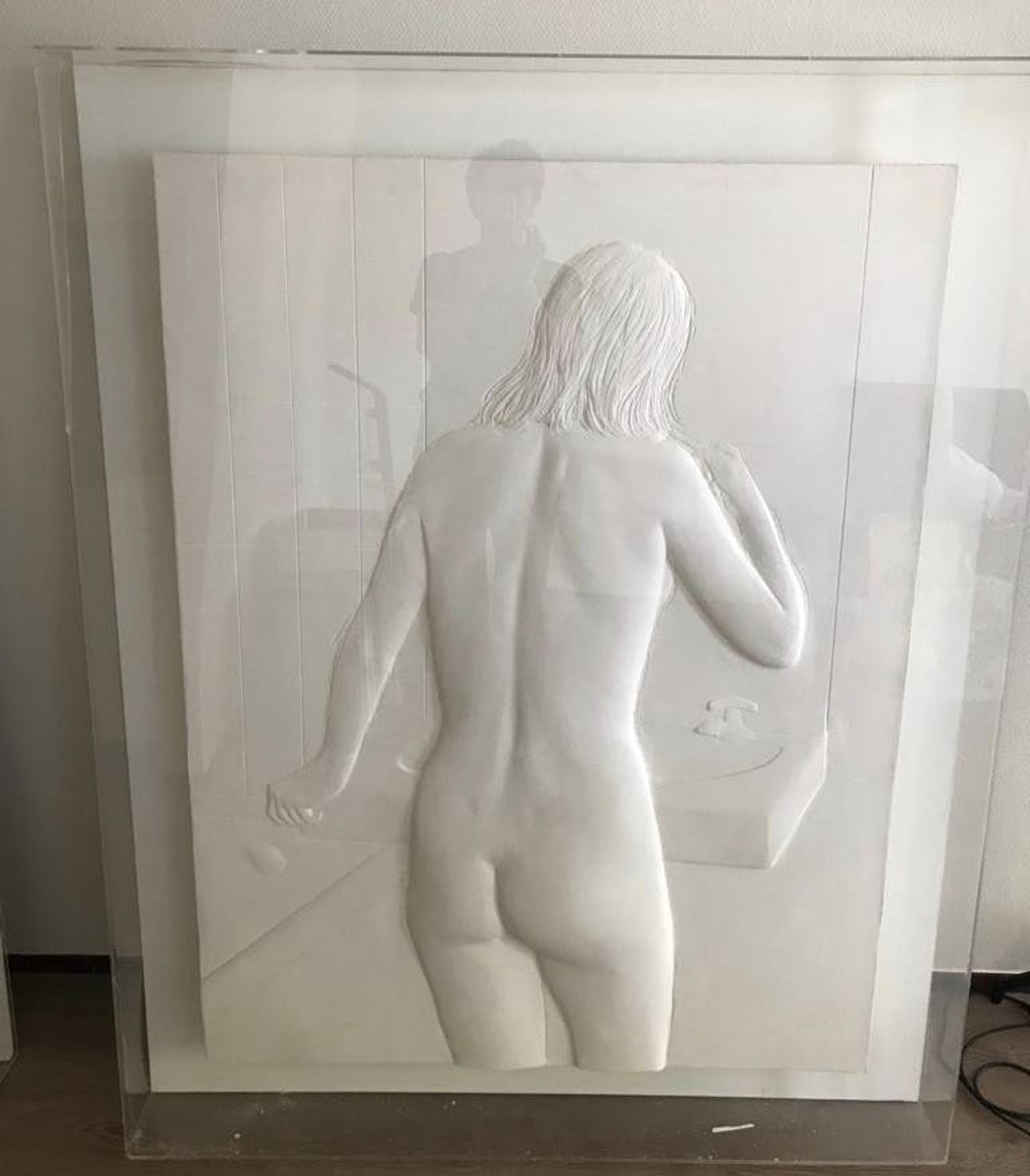 2 badkamer scenes gemaakt van gips en omvat door plexiglas.2 imposante stukken gemaakt door beeldend kunstenaar en hyperrealist Verduyn, geboren in Brugge.Andere beelden van hem zijn opgenomen in de collecties van het Groeningemuseum in Brugge en de Belfius collectie in Brussel.
