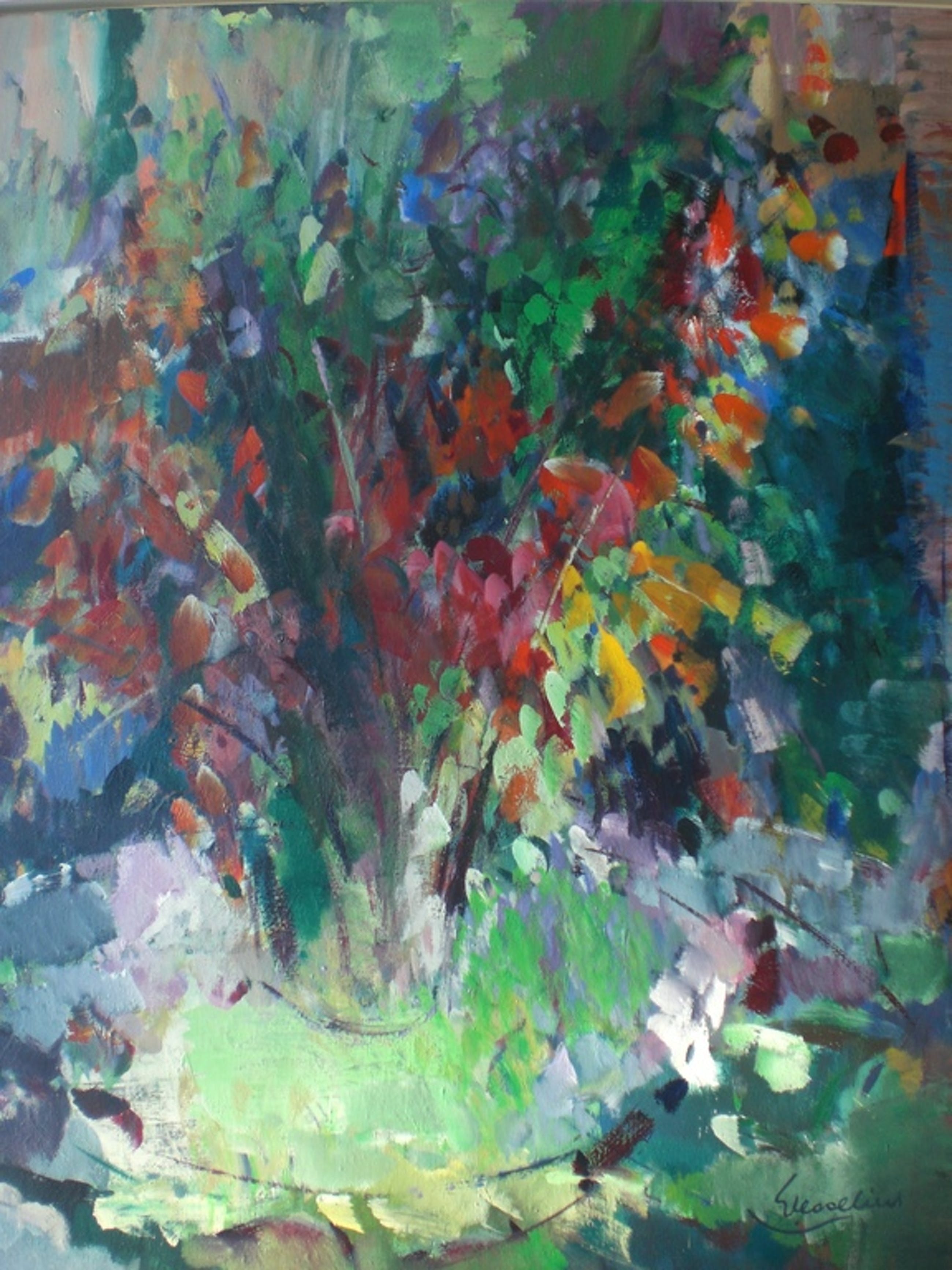 Prachtig, groot, schilderij van Jacques Wesselius (Nijmegen 1931 - Amsterdam 2012). Grote en kleurige compositie met bloemen, één van zijn favoriete studies, in mooie strakke lijst.