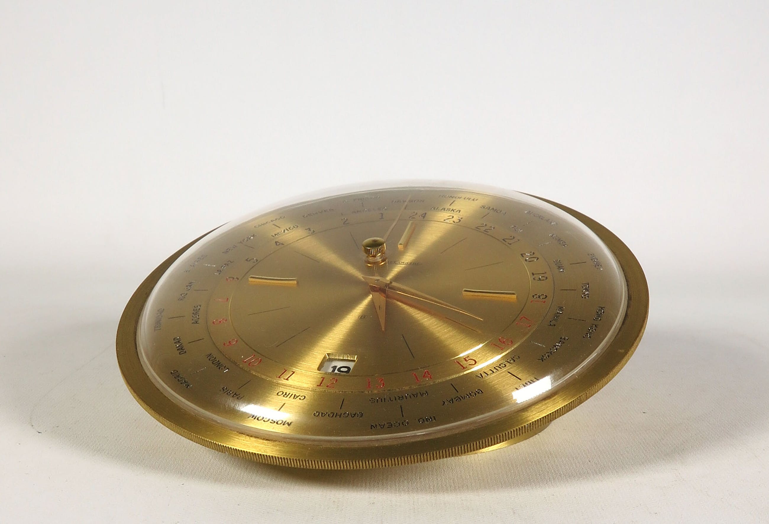 Grote mid-century tafelkok van het befaamde horlogehuis Jaeger-LeCoultre, met rond de wijzerplaat in totaal 36 steden/landen. Voorzien van 8-daags uurwerk, datumaanduiding, eveneens gelakt bronzen wijzerplaat en Dauphine-wijzers.