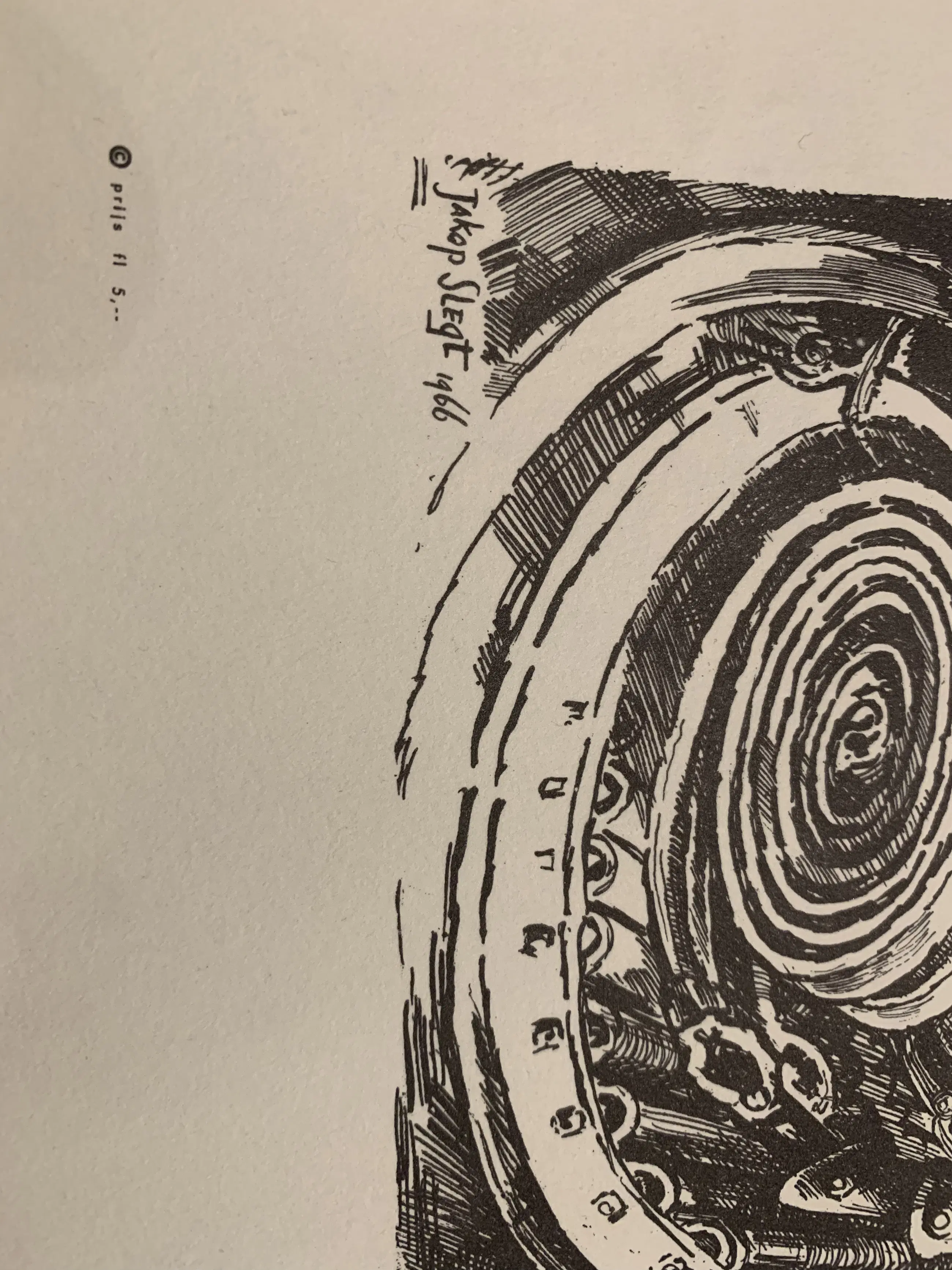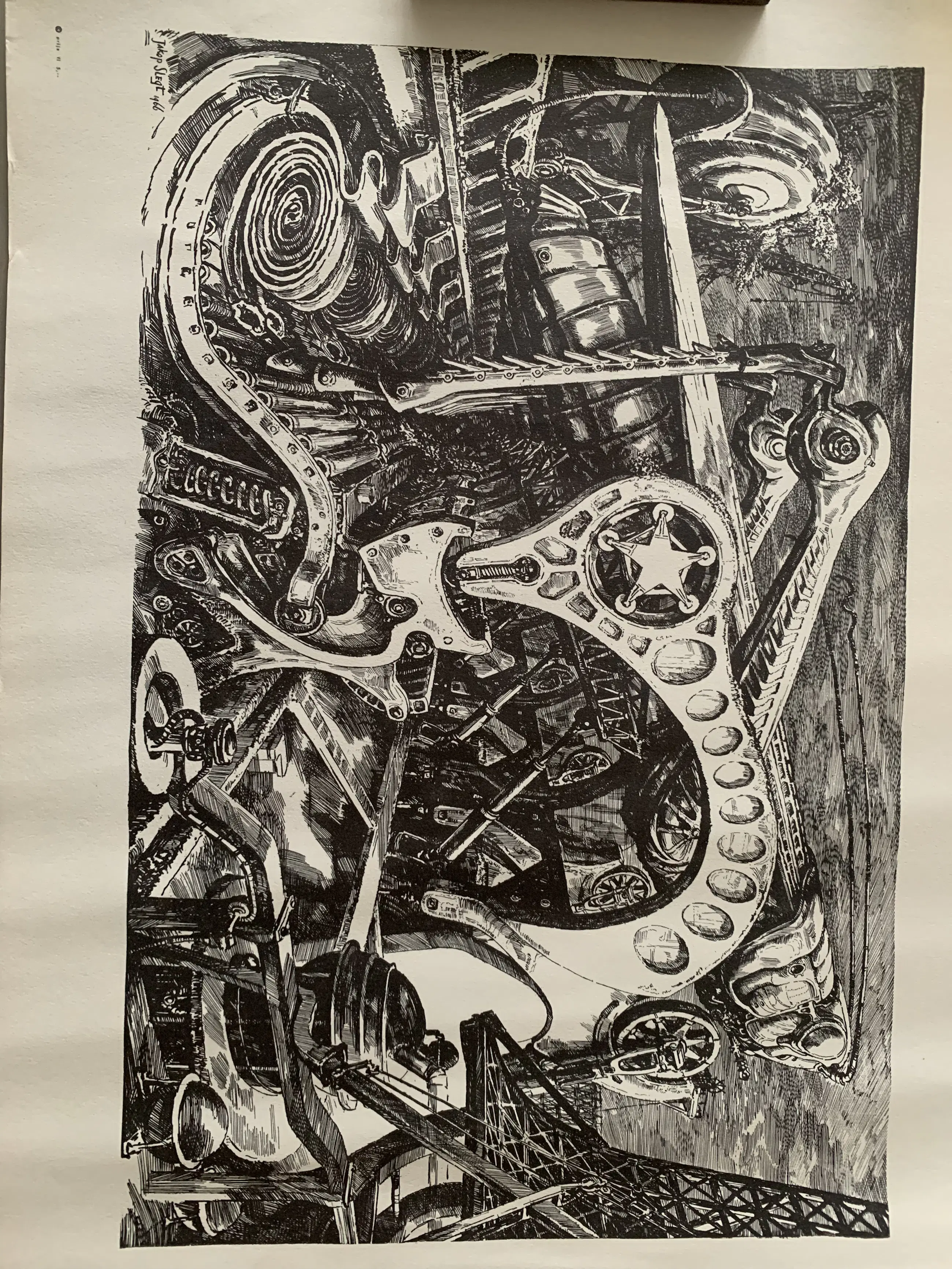 Mooie off-set print uit 1965 van Jakop Slegt. Futuritisch Surrealistische Machine. De tekeningen zijn in de druk gesigneerd. Tevens staat het copyright-teken gedrukt en een prijs van 5 gulden.