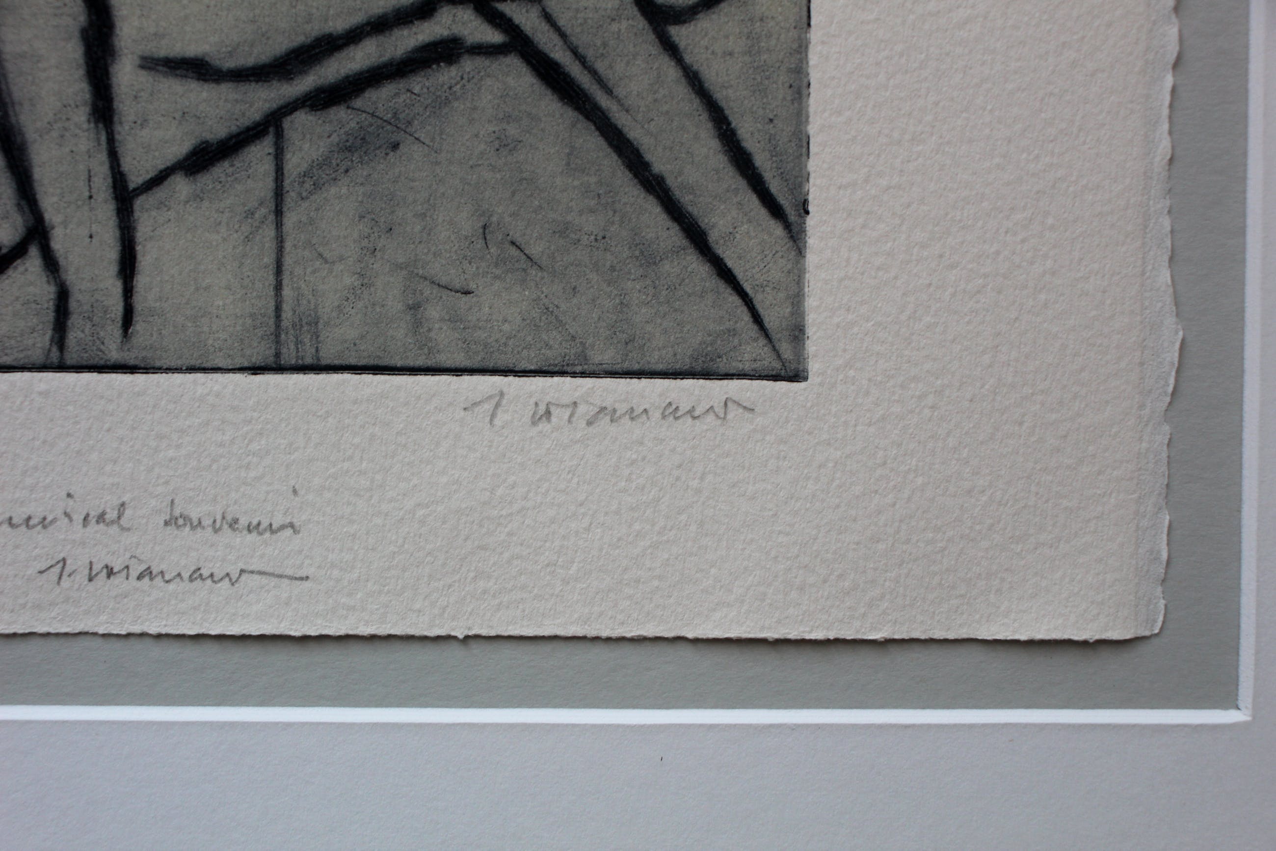 Ets van James Coignard. Nummer: II/XX. Het werk is rechtsonder, met potlood, gesigneerd door de kunstenaar en in de opdracht. Opdracht: Pour Nia et Joop - en arrival souvenir, Cannes - 19-3-96 - J. Coignard. Afmetingen voorstelling: H12 x b18,5 cm.Conditie: in goede staat. De authenciteit van het, aangeboden, werk wordt volledig gegarandeerd. Een certificaat van echtheid kan, op aanvraag, worden meegestuurd.