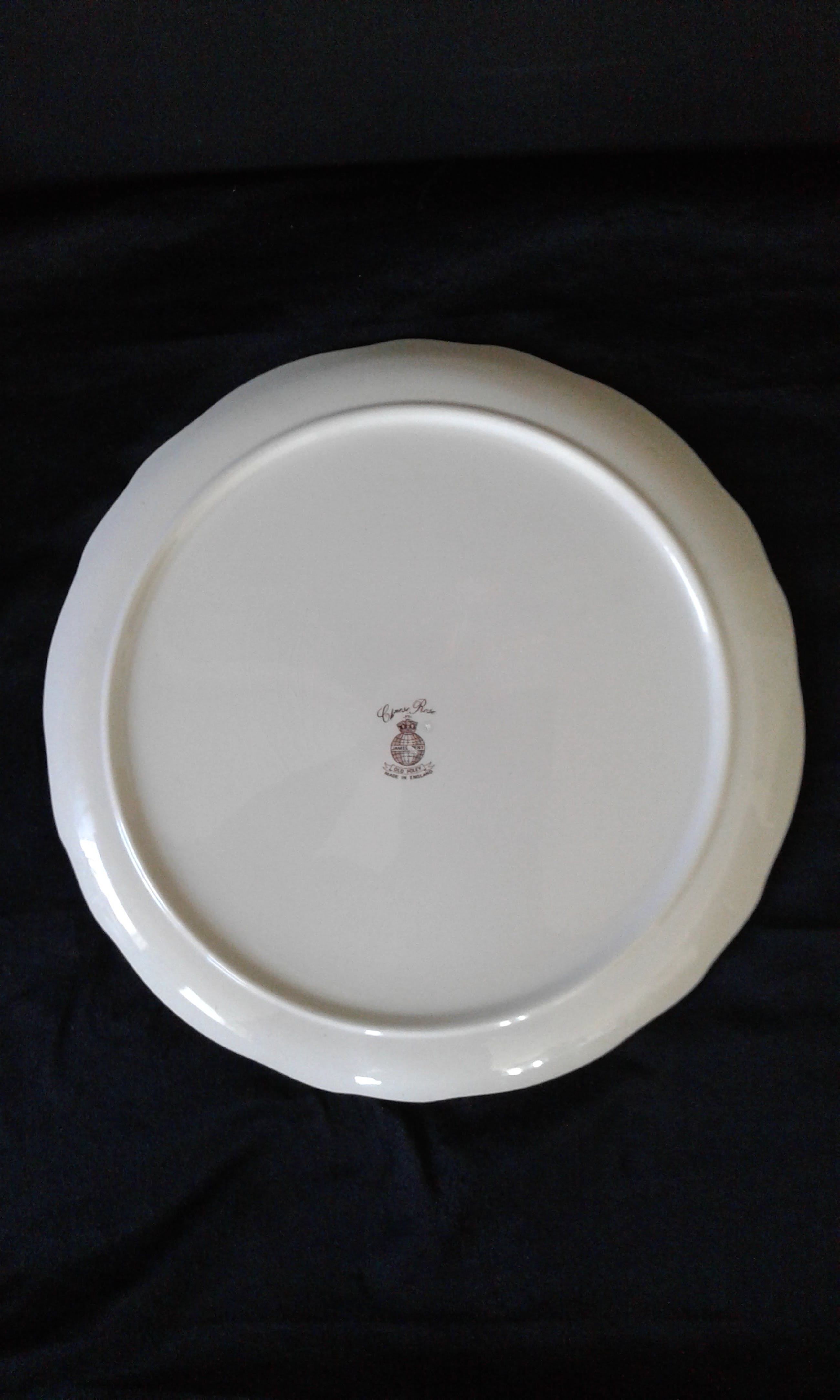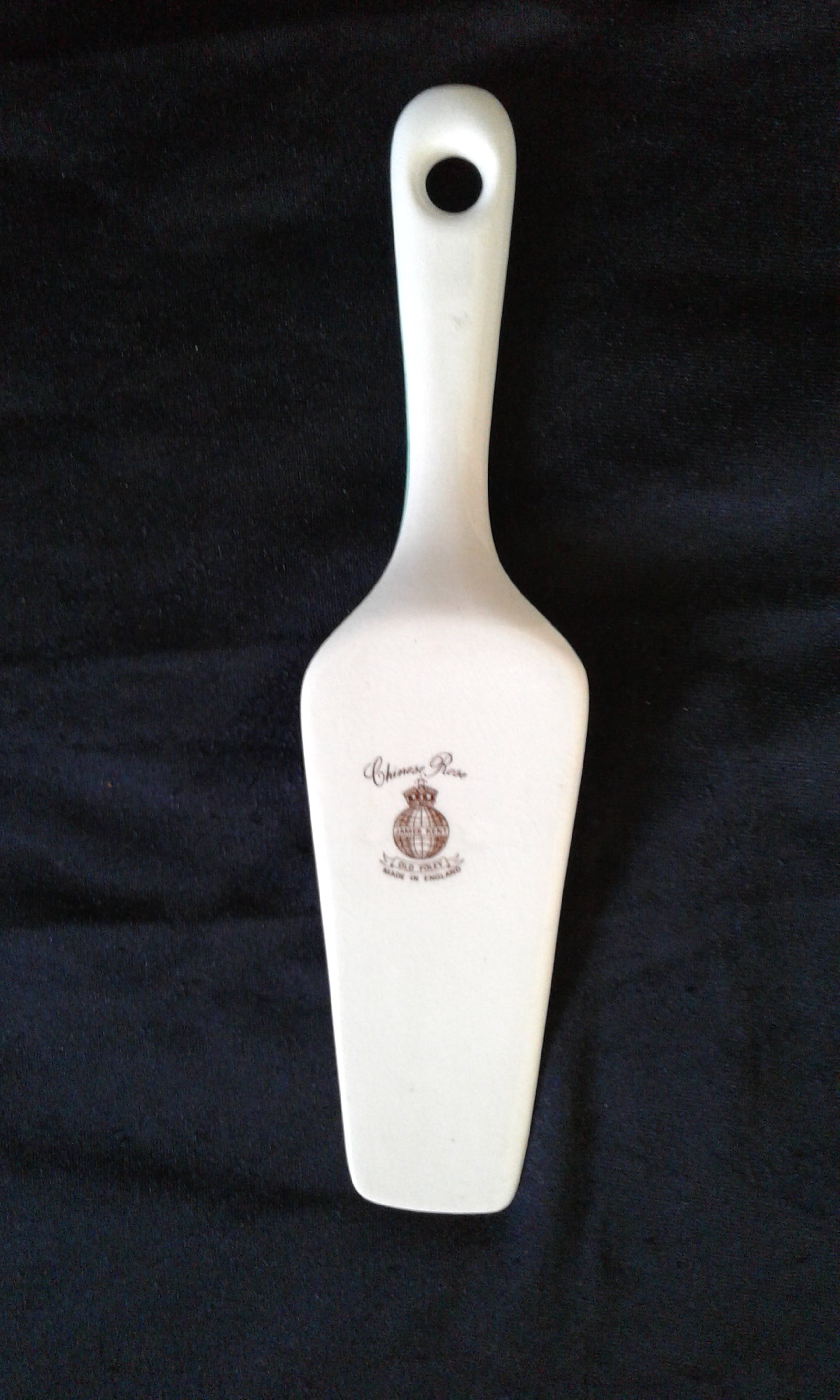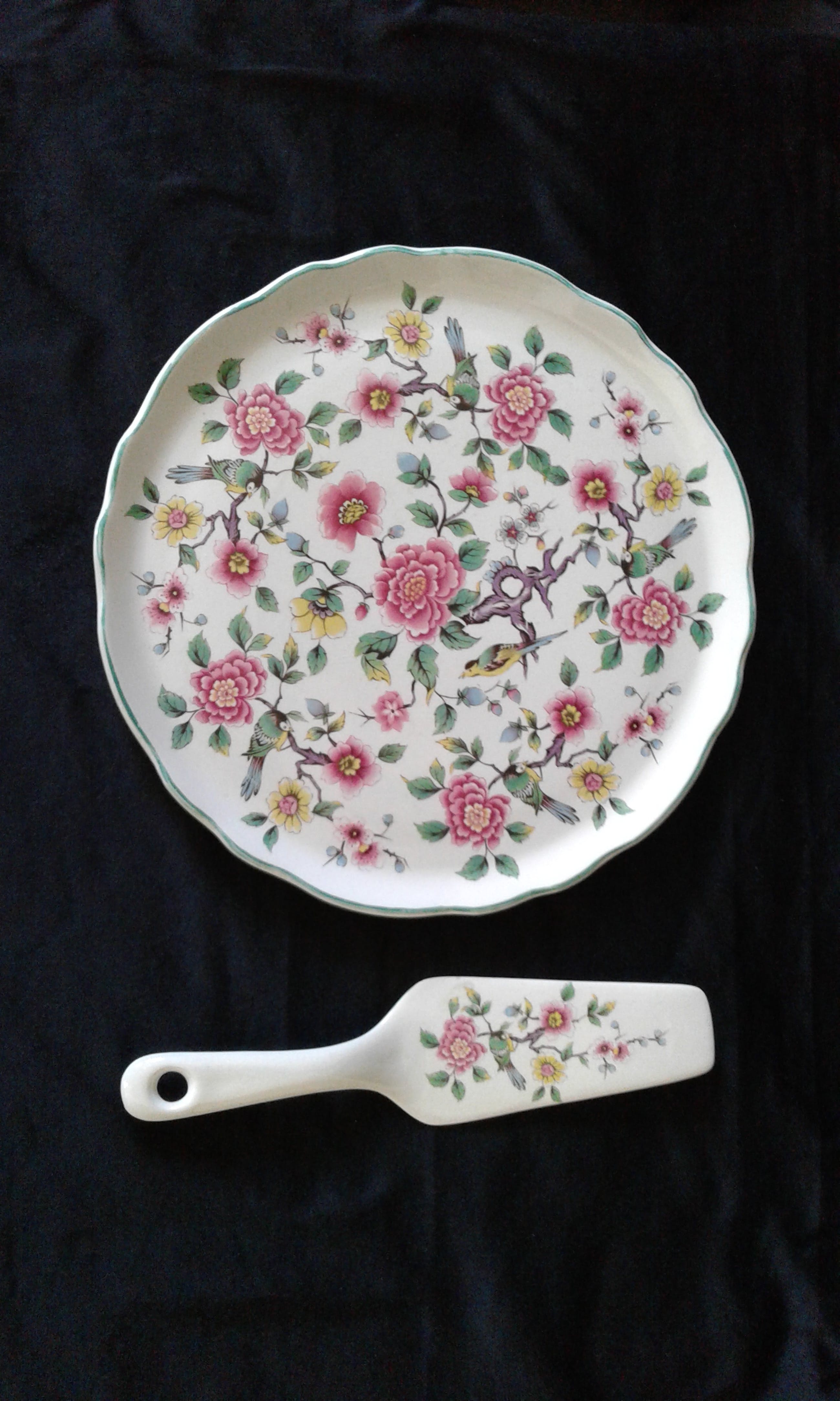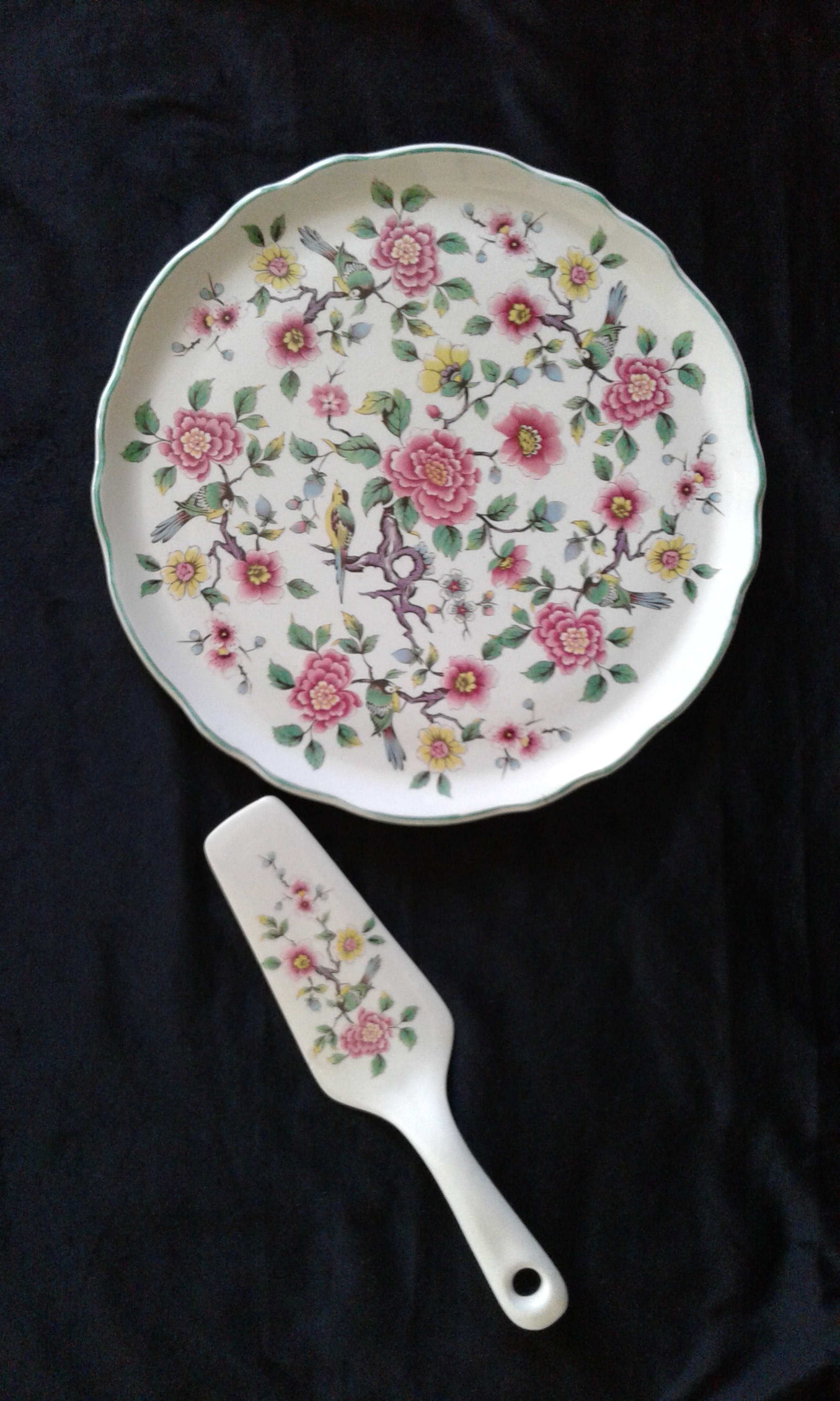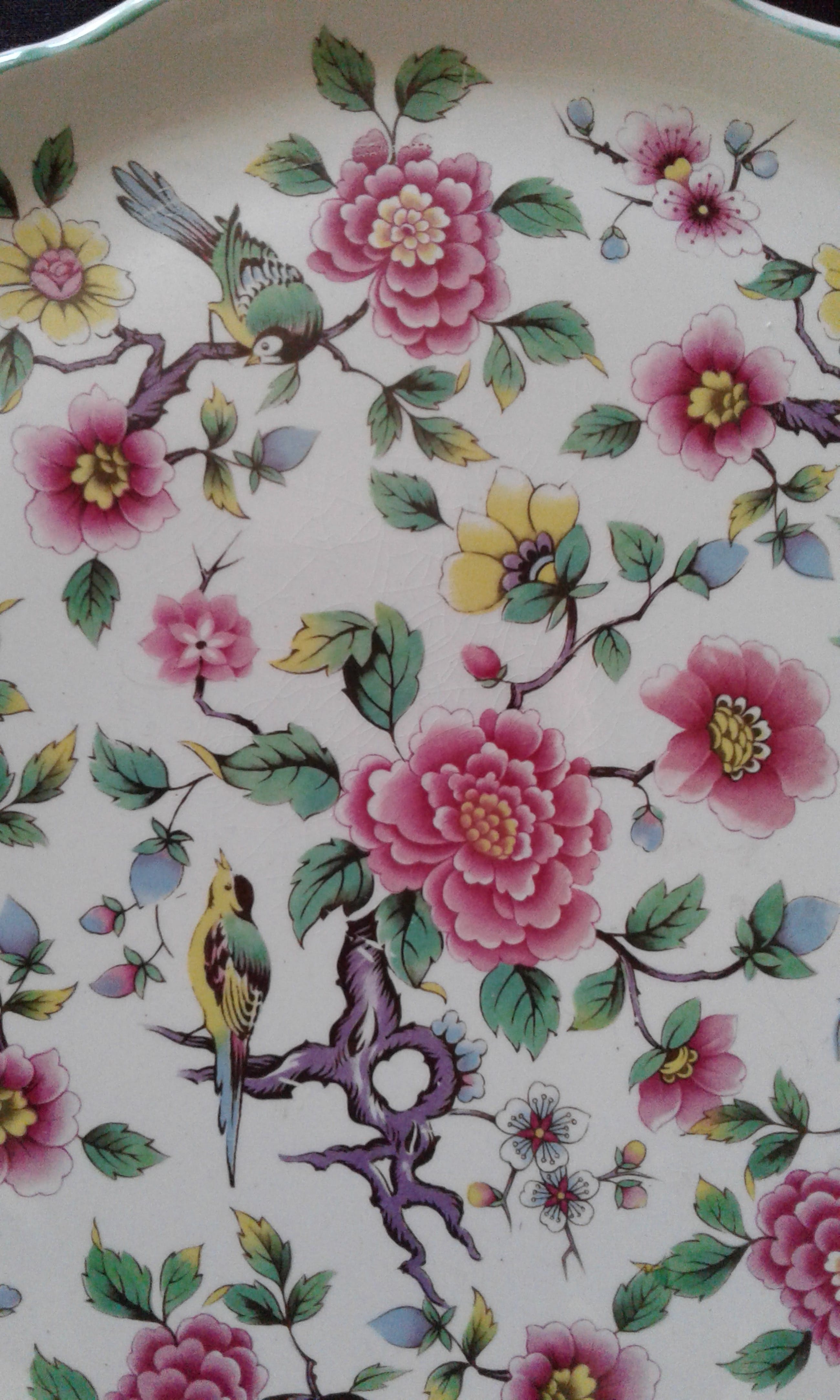Komt uit de porseleinserie Chinese Rose De tray heeft een gekartelde opstaande boord en een doorsnede van 27 cm. De bijhorende schep meet 24 cm.