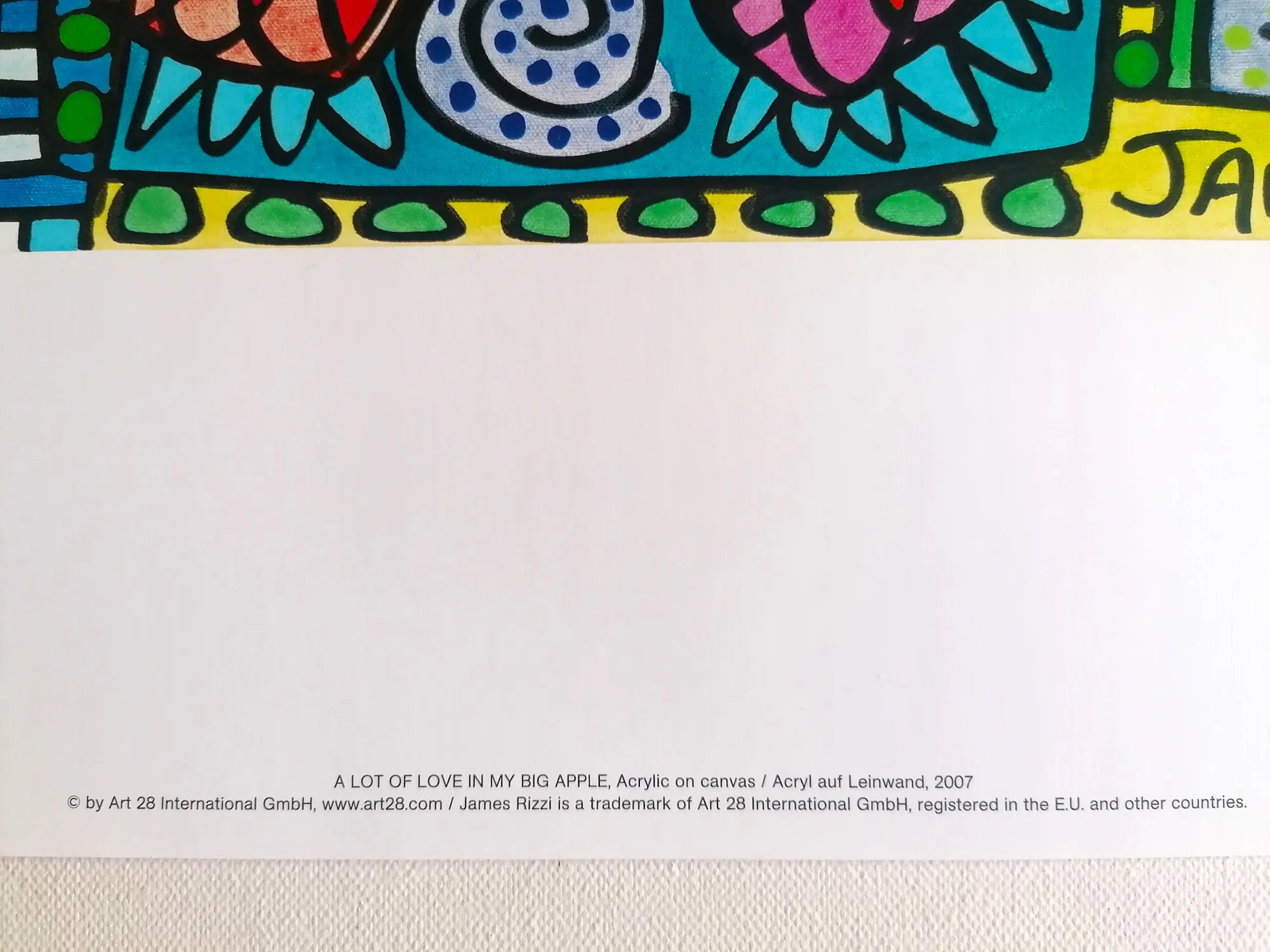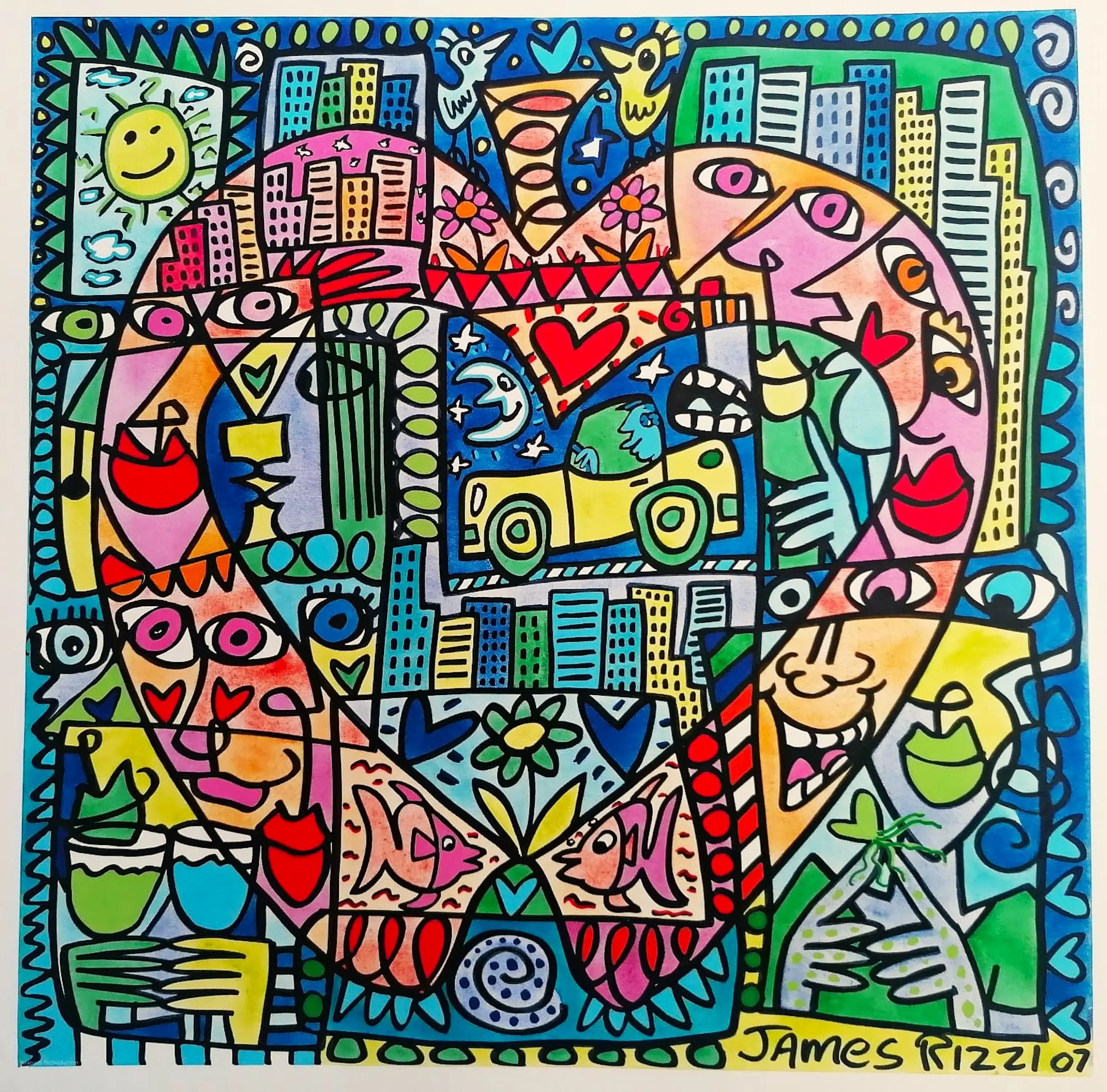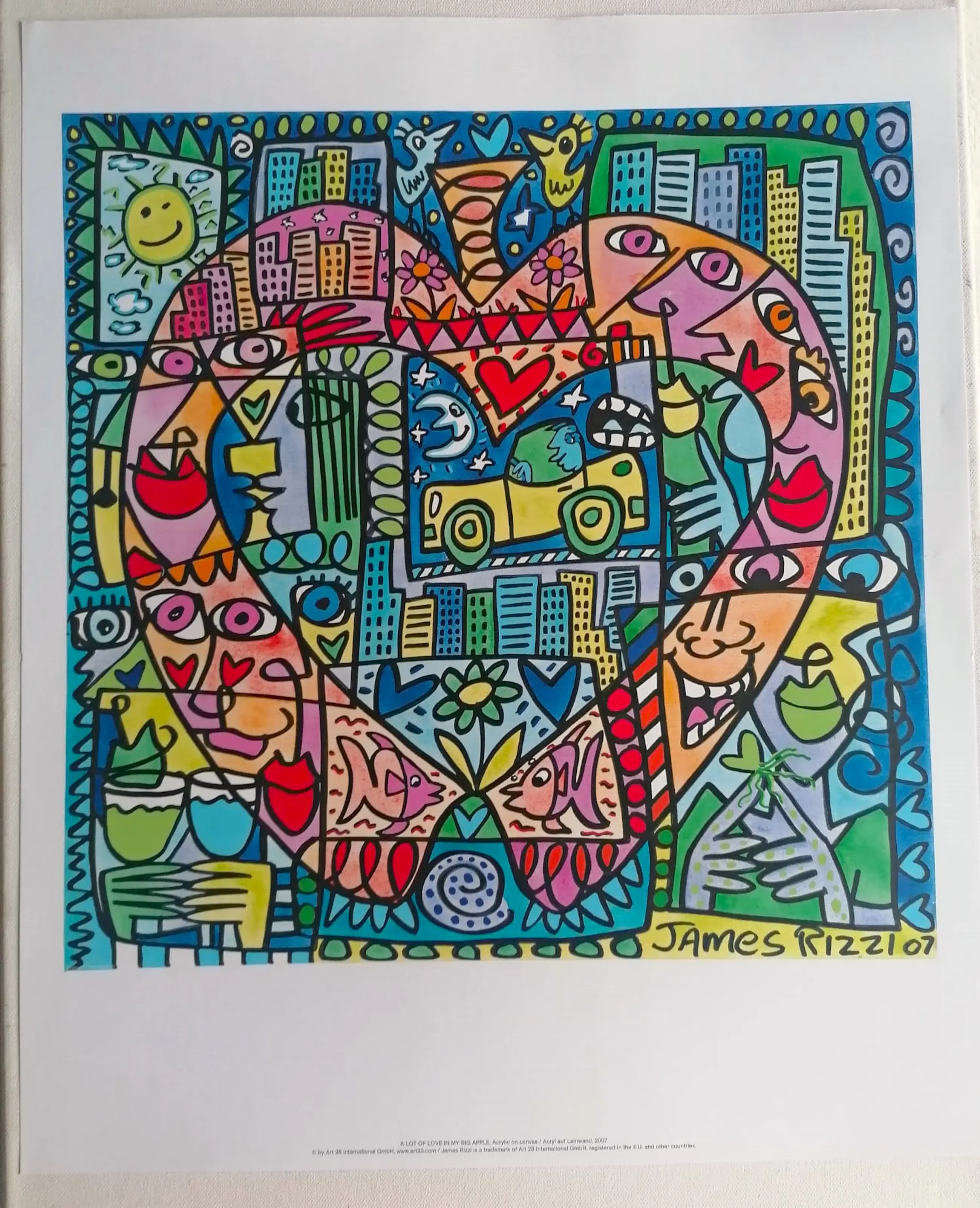 De kleurenoffsetlithografie van het schilderij Big Apple werd in 2017 gedrukt. Bladformaat: 58 x 48 cm, gesigneerd in de plaat. De afdruk is gemaakt op hard gecoat papier en vertoont geen zichtbare beschadigingen. Kunststijl: Pop Art. Print: Art Licensing International. Onderaan staat een notitie van de uitgever met een beschrijving en de goedkeuring van de fabrikant. De beroemde popartkunstenaar James Rizzi werd in 1950 in Brooklyn geboren. Hij was tijdens zijn leven een van de populairste kunstenaars. James Rizzi was al tijdens zijn leven een van de meest geliefde popartkunstenaars van zijn tijd, en dat is hij tot op de dag van vandaag gebleven. De levering is inclusief verplichte verzekering en tracking van de verzending.