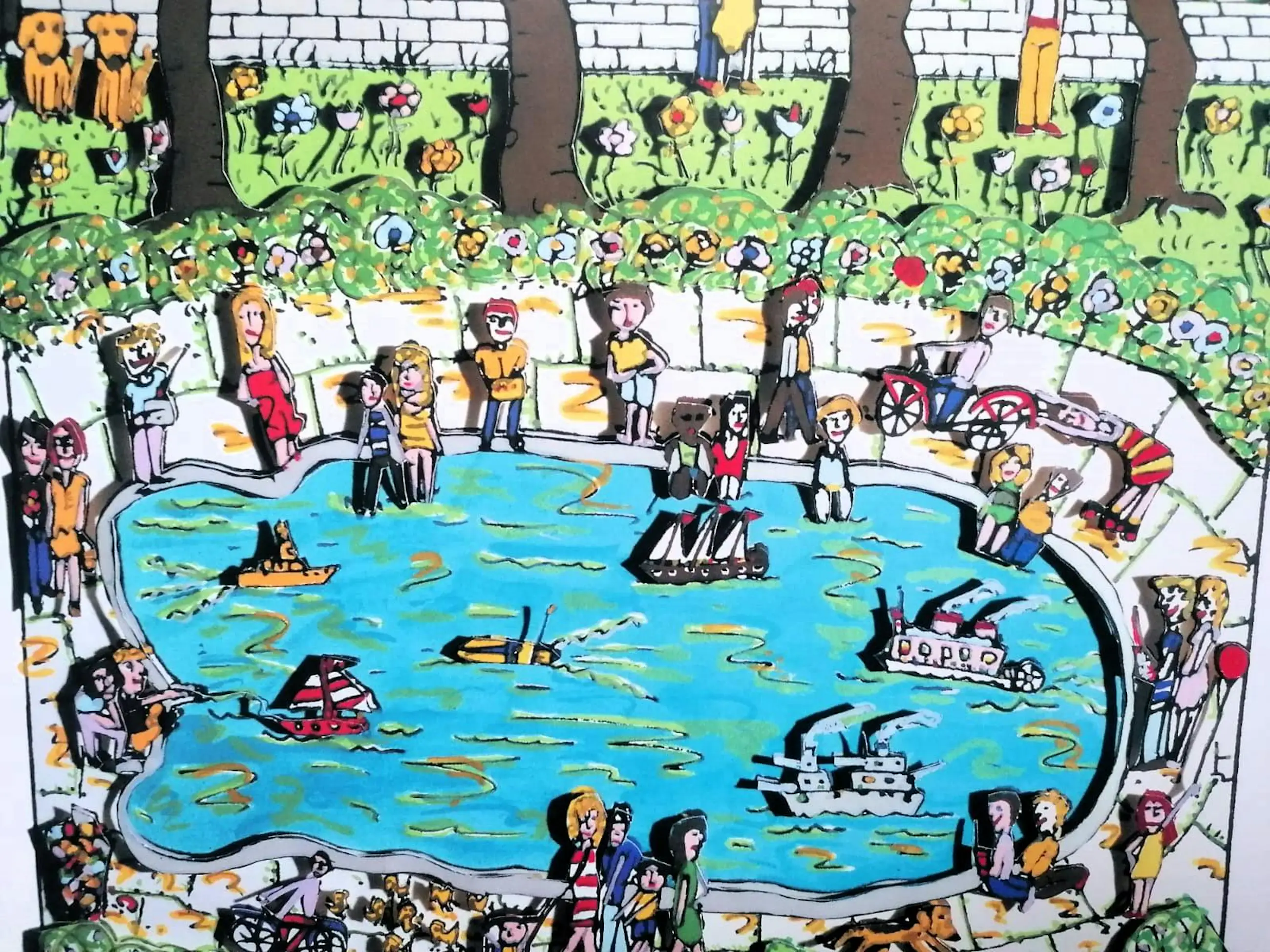 James Rizzi (1950-2011) was een invloedrijke Amerikaanse popartkunstenaar, bekend om zijn vrolijke, kleurrijke schilderijen en de uitvinding van 3D-graphics (papiersculpturen).