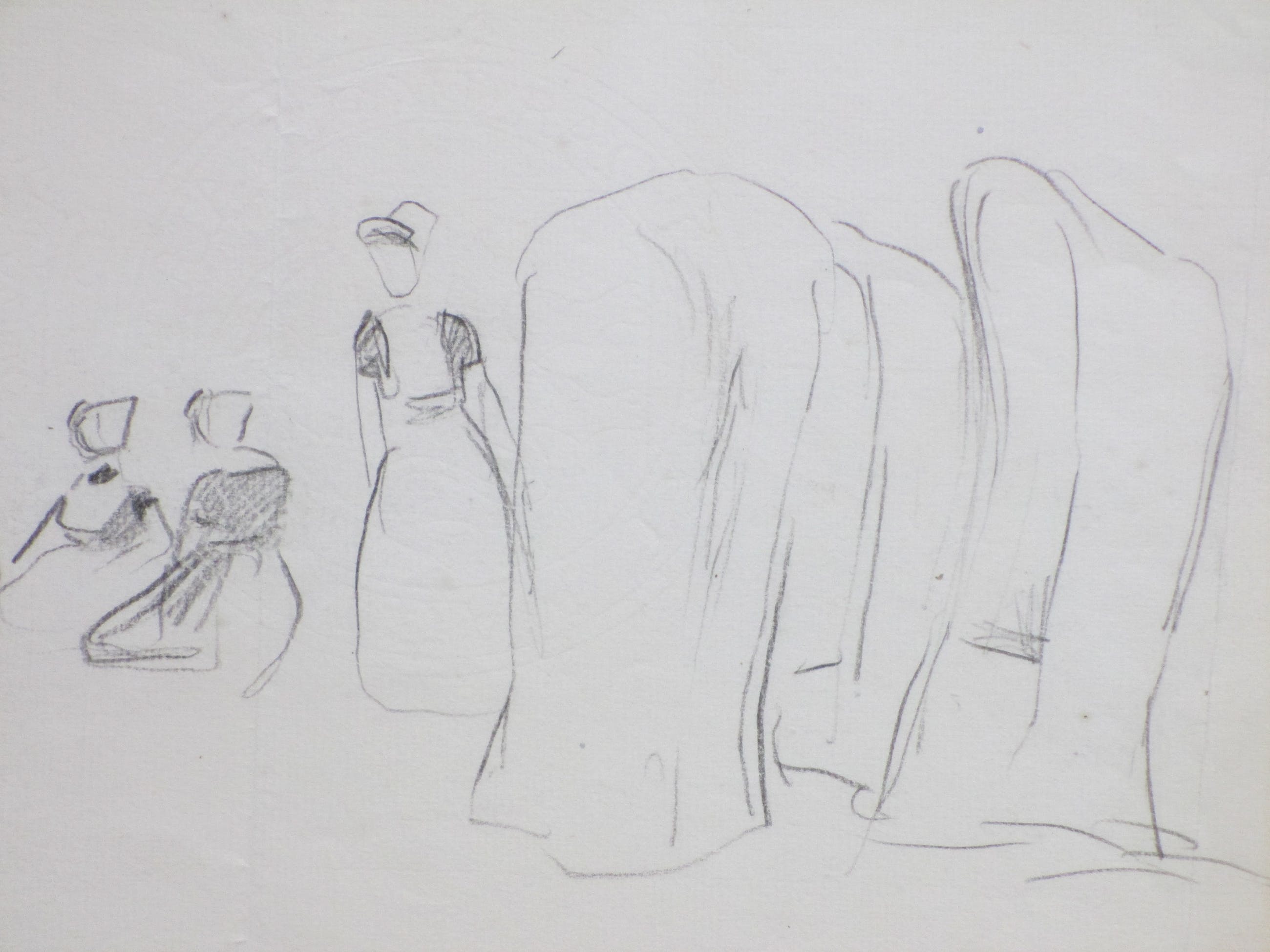 Tekening heeft vouwlijn in het midden en aan zijkanten, goeddeels buiten beeld. Lijkt uit schetsboek te komen.