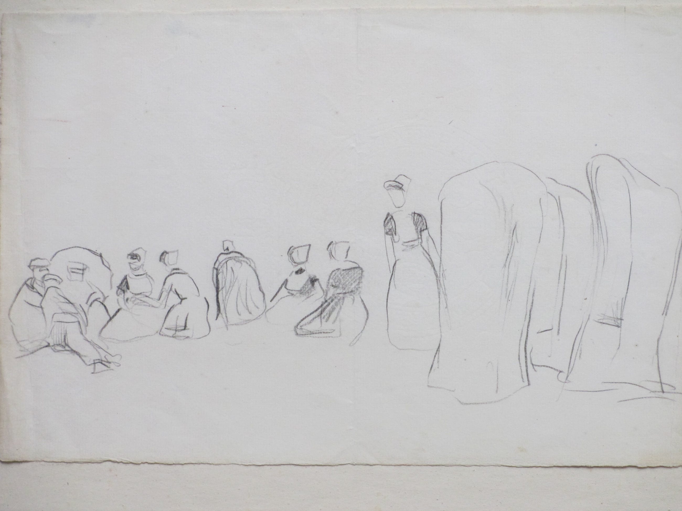 Tekening door James William FraterVoorstelling van in dracht geklede Zeeuwse vrouwen en mannen aan het strandLosbladig, beeldmaat 13x31, bladmaat 21x34Frater werkte veel op Walcheren en kreeg daar o.a. les van Jan TooropNiet gesigneerdHerkomst: collectie werken FraterAuthenticiteit volledig gegarandeerd