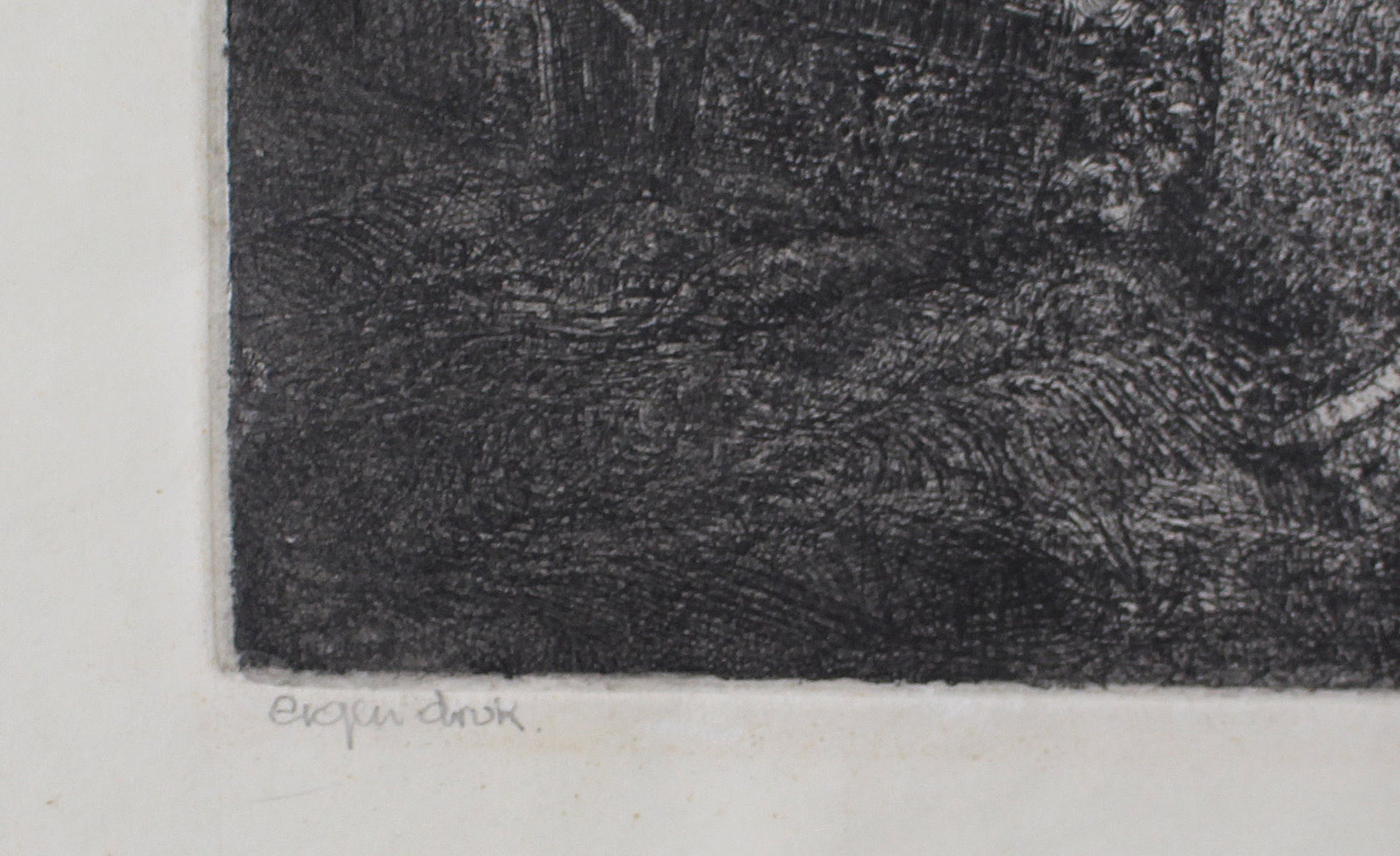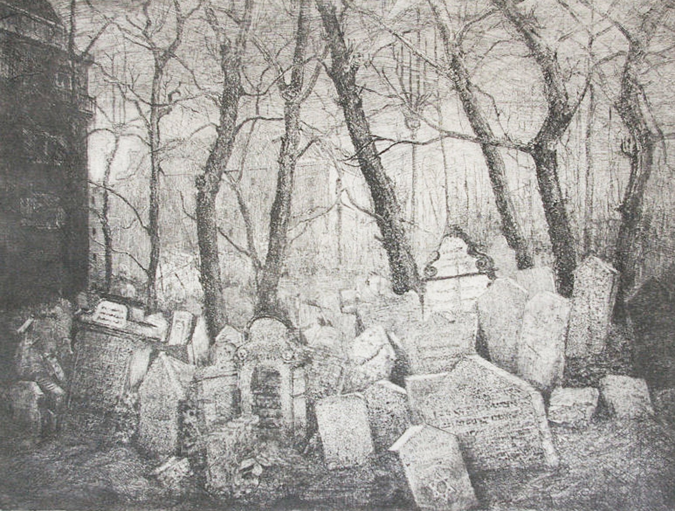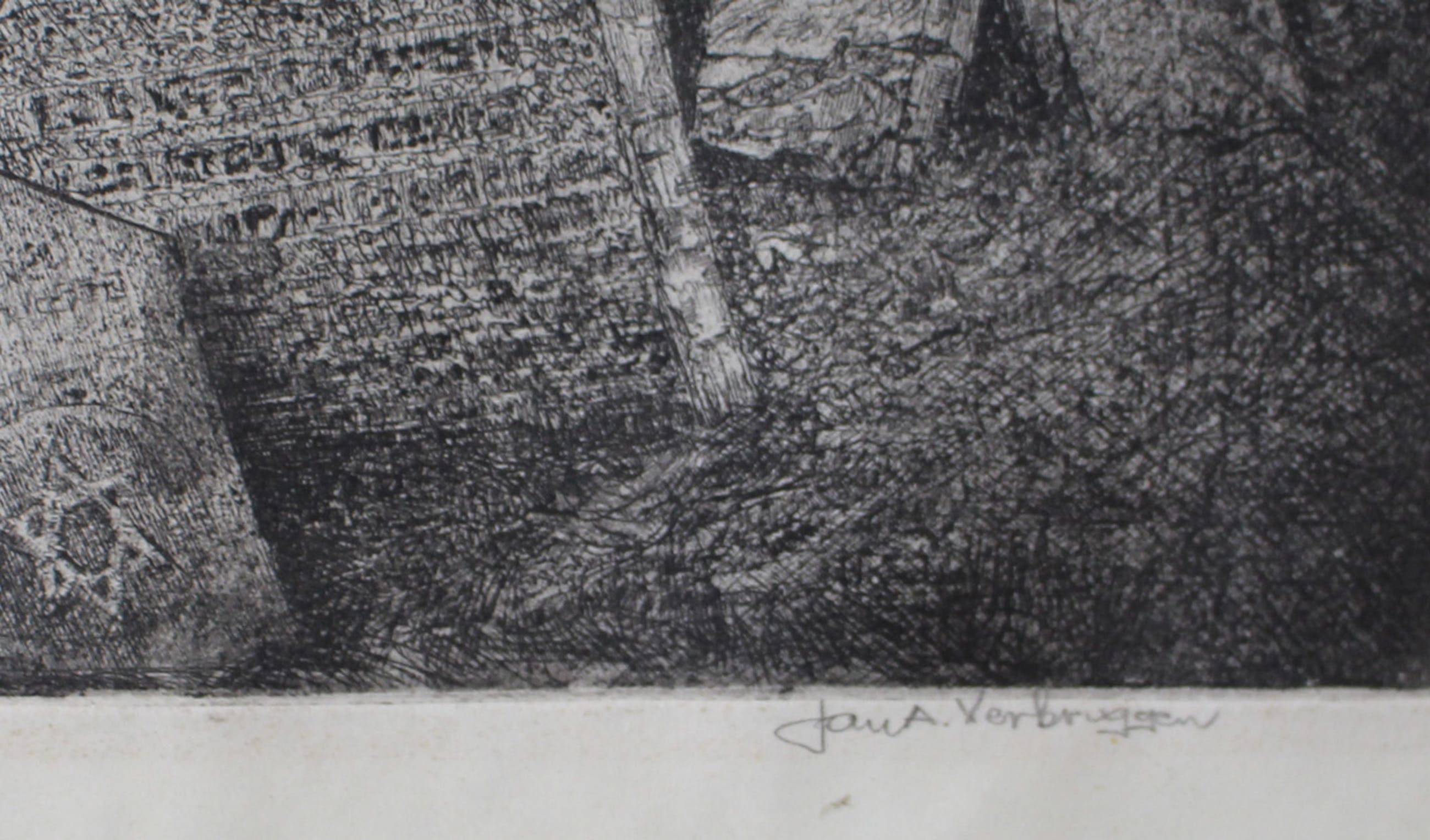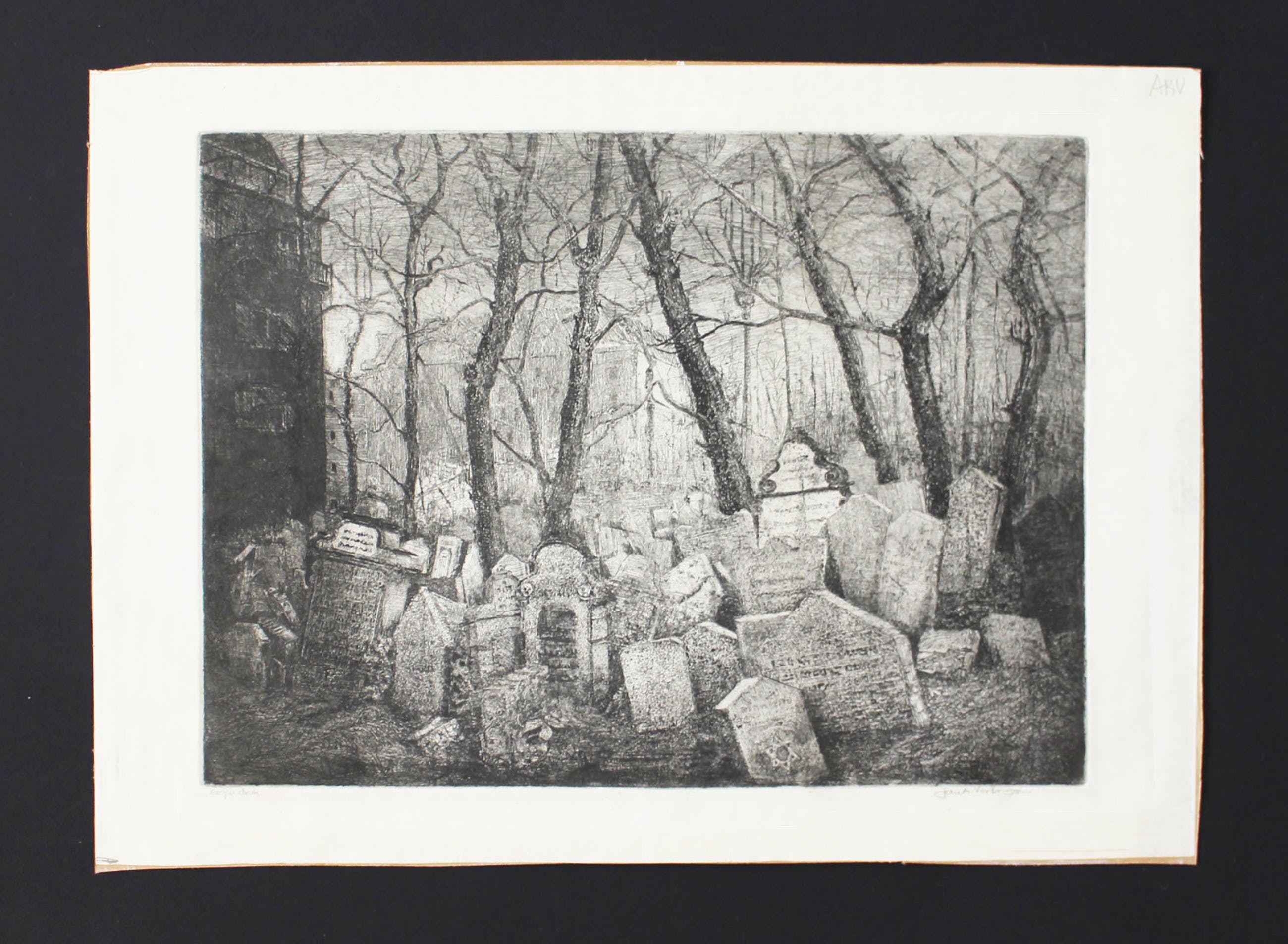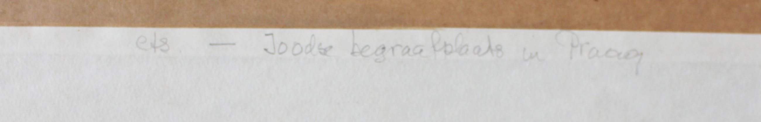 met potlood gesigneerd en met tekst: 'eigen druk', op achterkant getiteld: 'ets, Joodse begraafplaats in Praag'