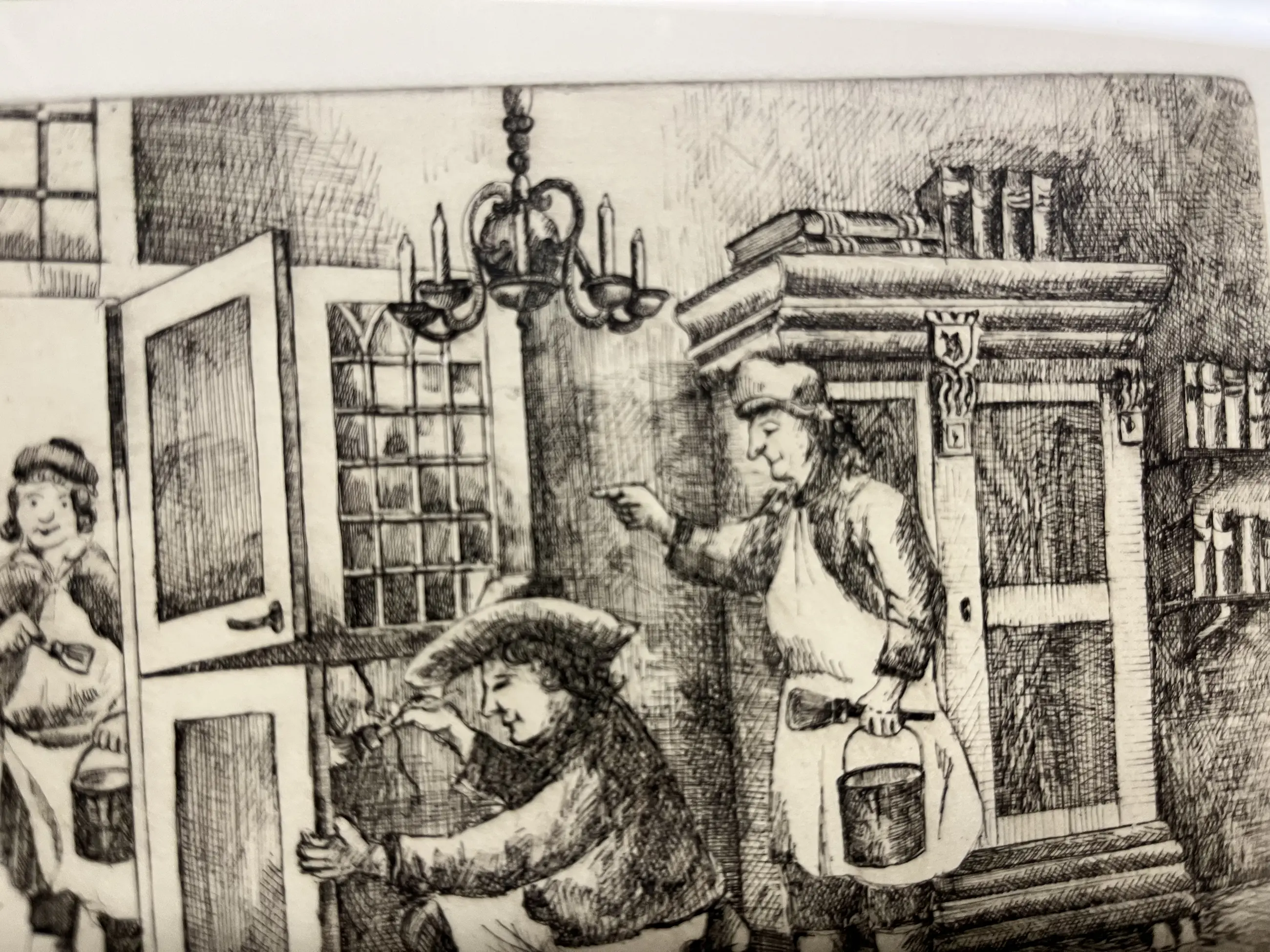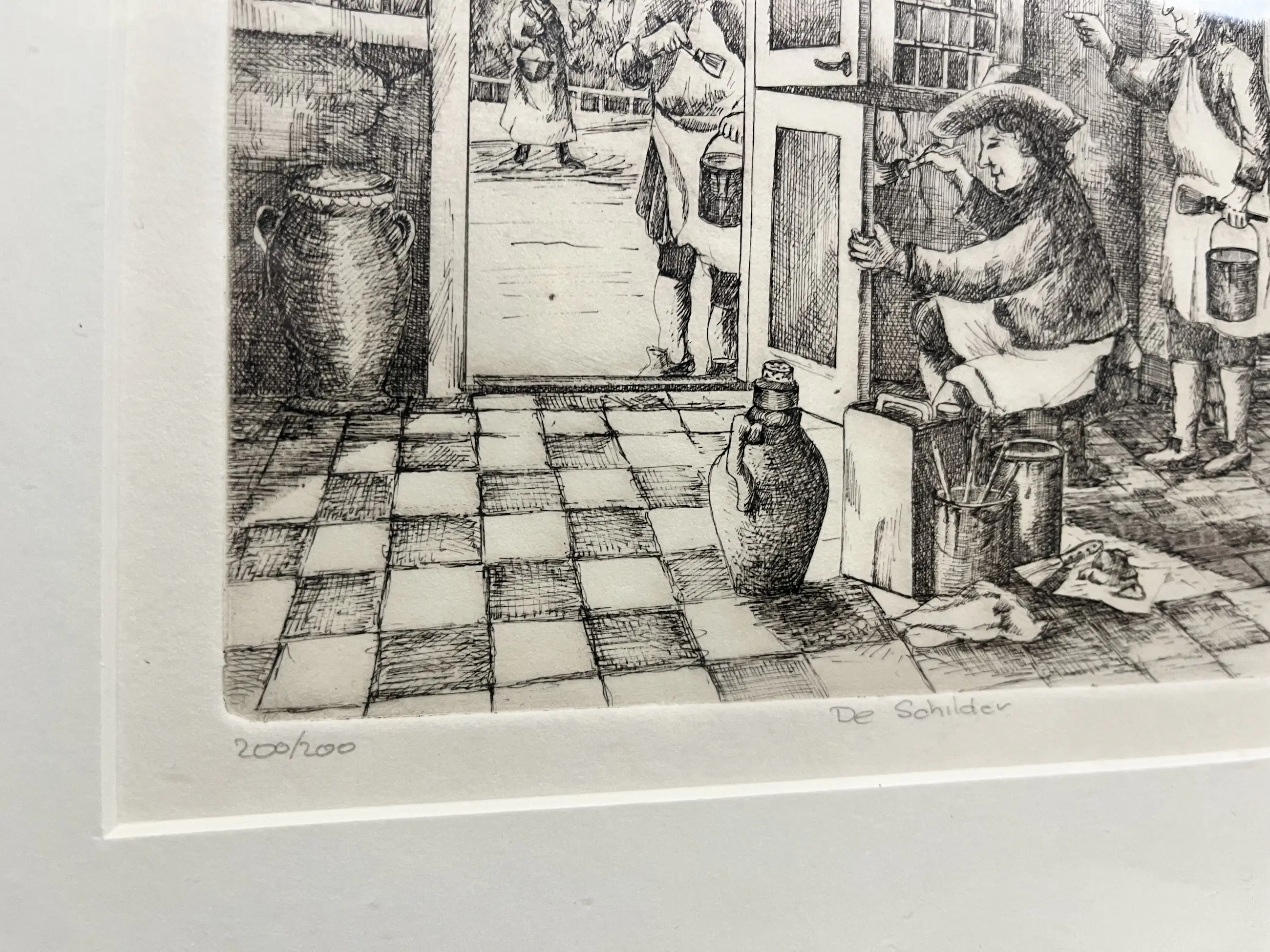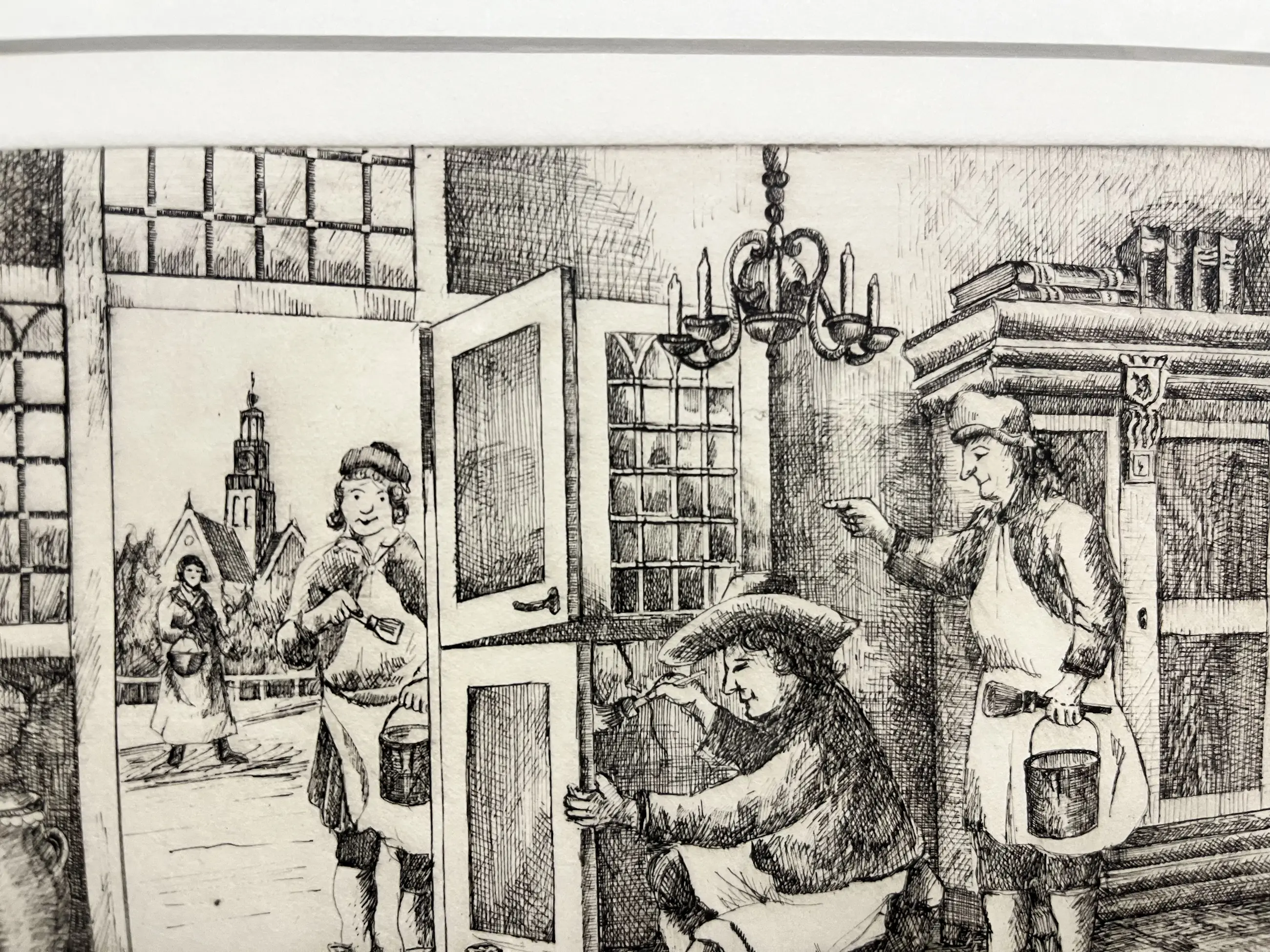 Leuke ets van het ambacht huisschilder. Grappige figuurtjes van schilders aan het werk. Via de open deur een doorkijk naar de kerktoren en passant.