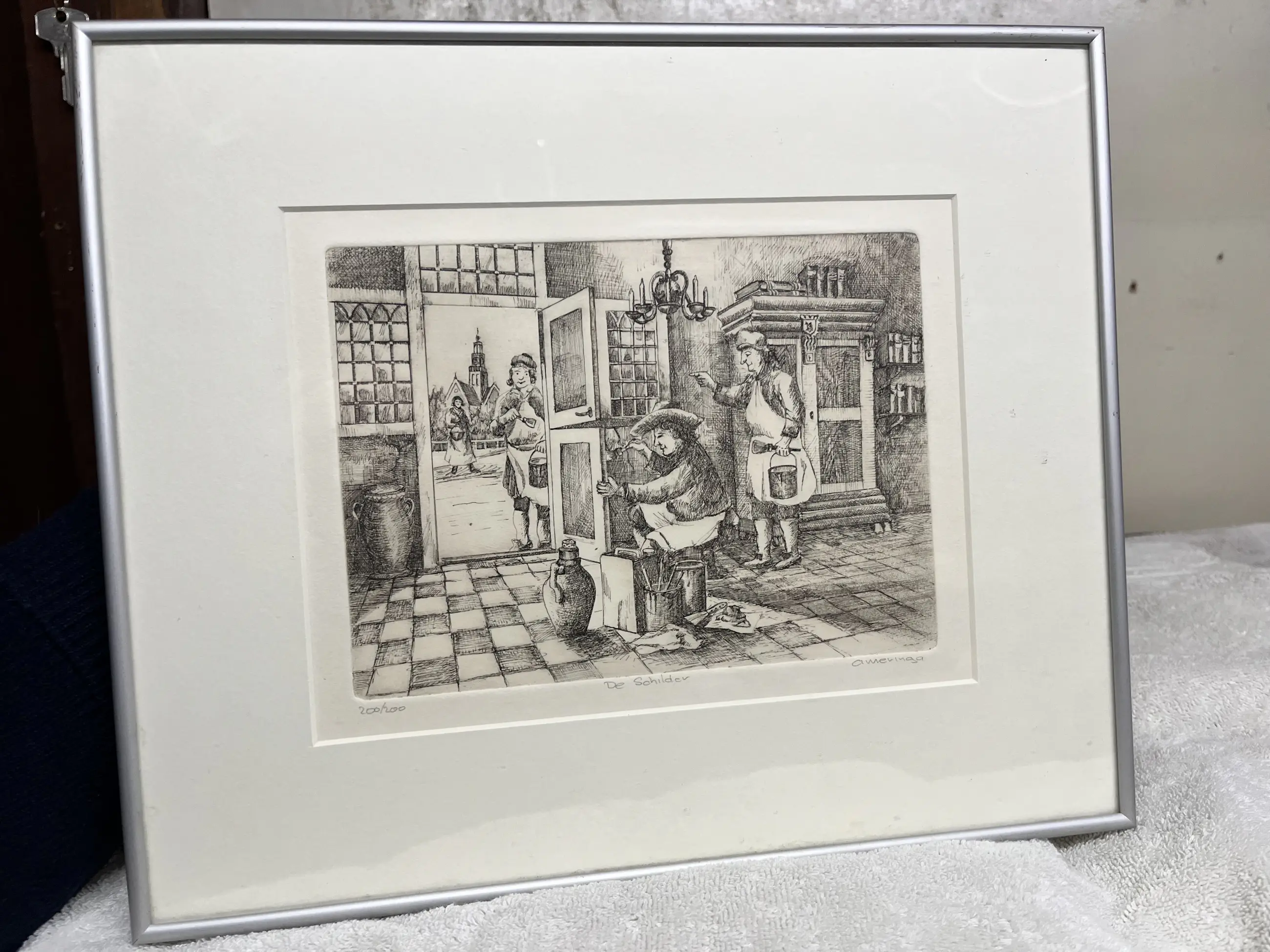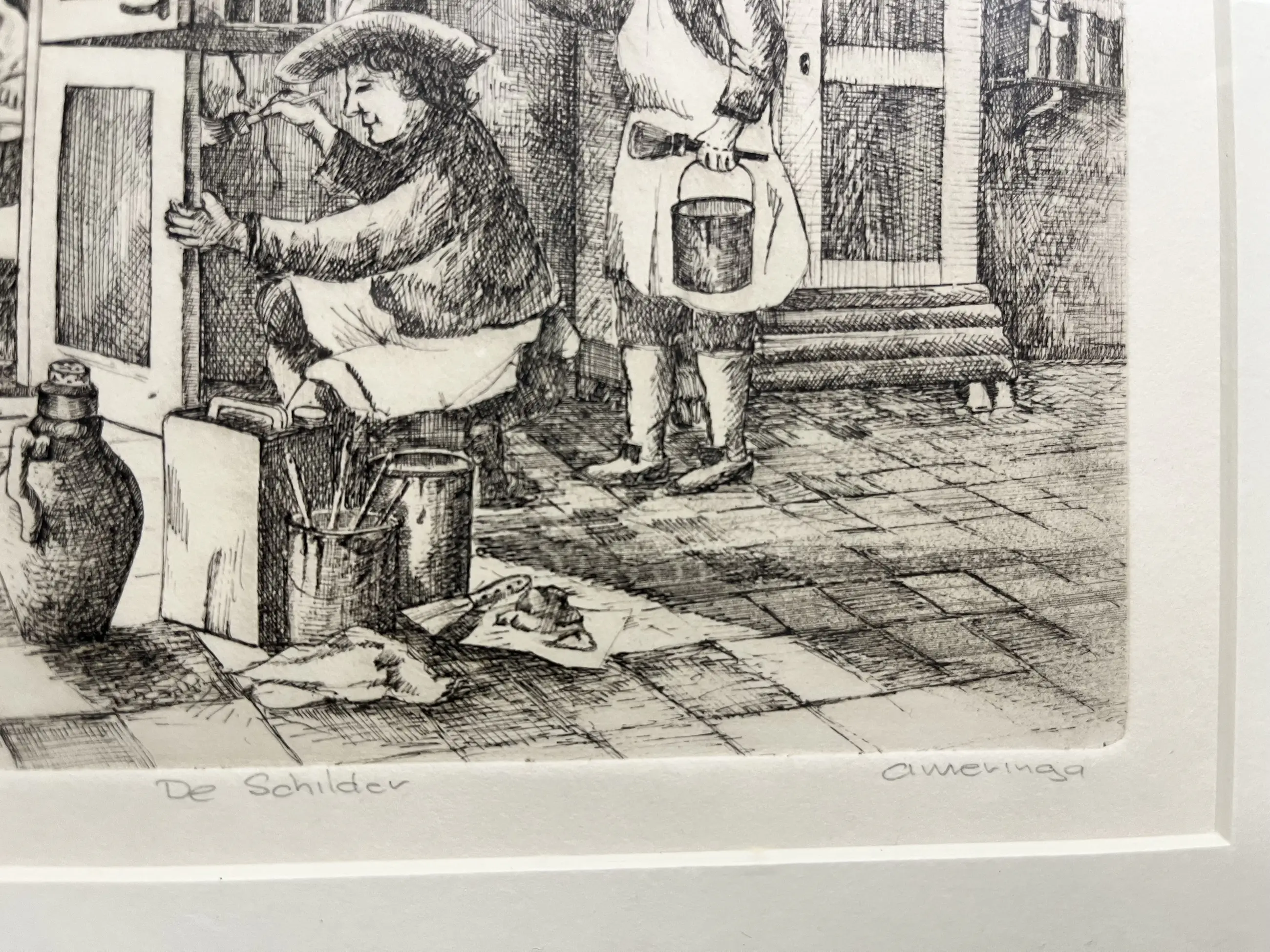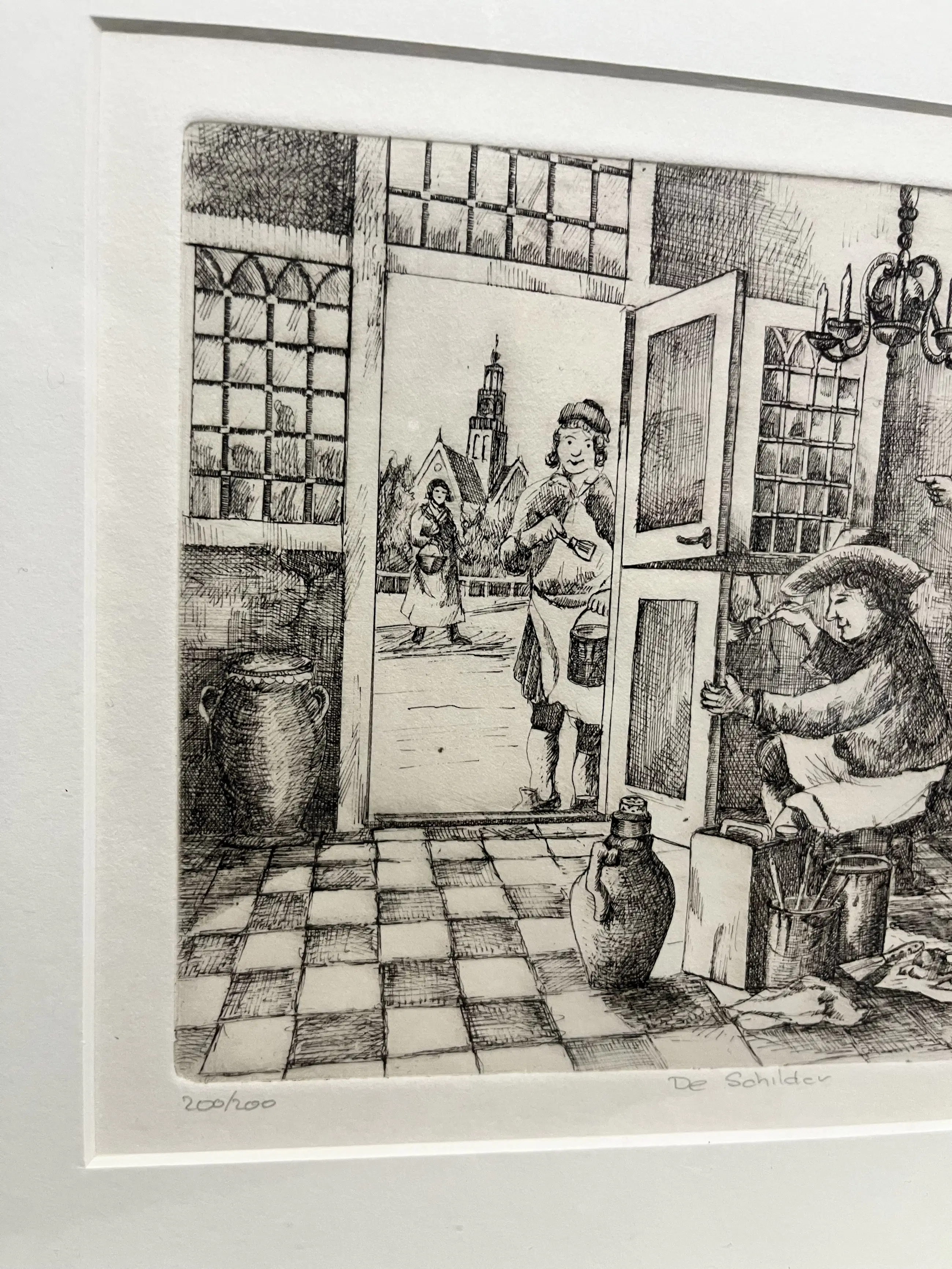 Leuke ets van het ambacht huisschilder. Grappige figuurtjes van schilders aan het werk. Via de open deur een doorkijk naar de kerktoren en passant.