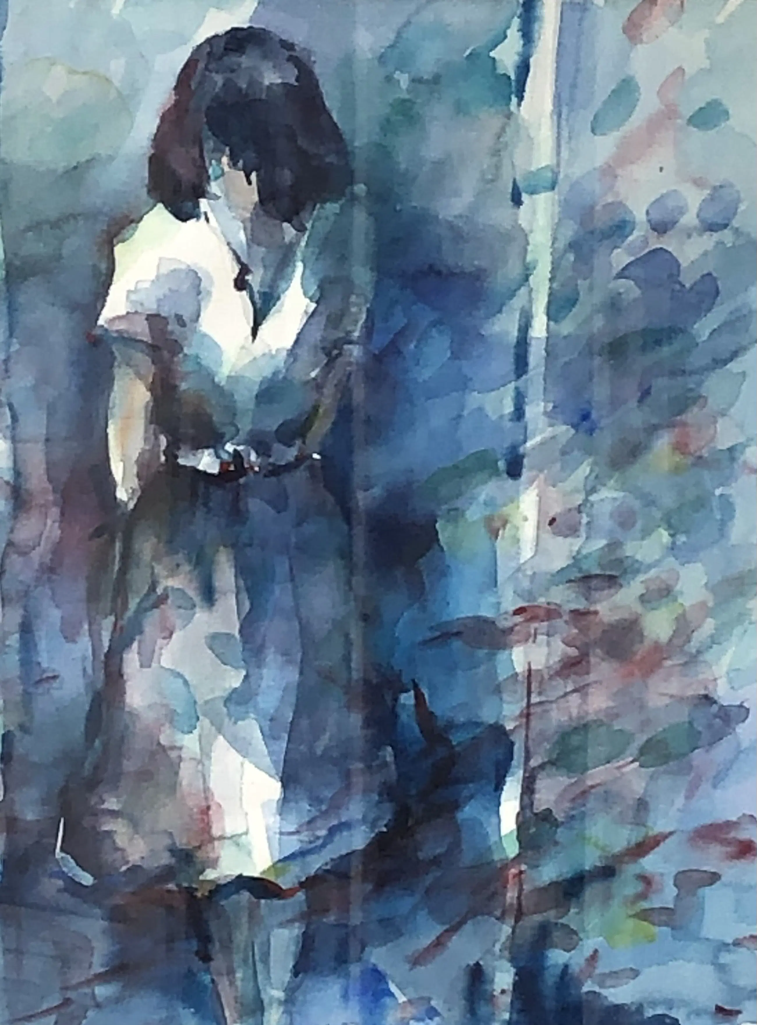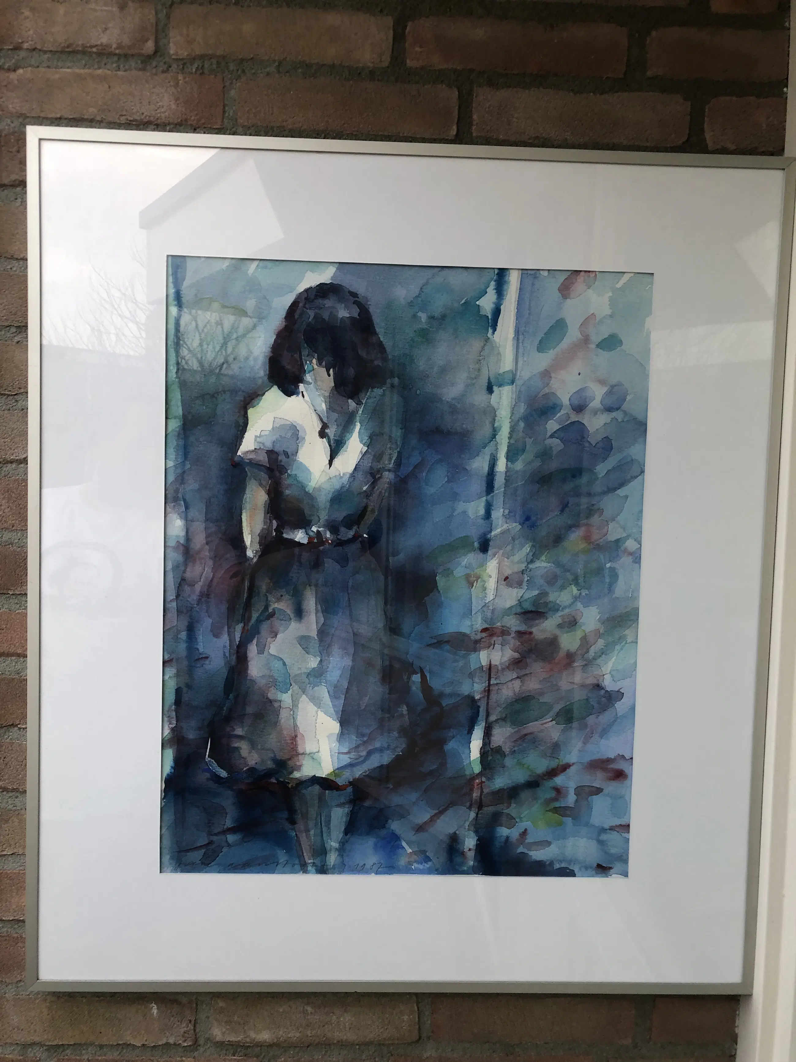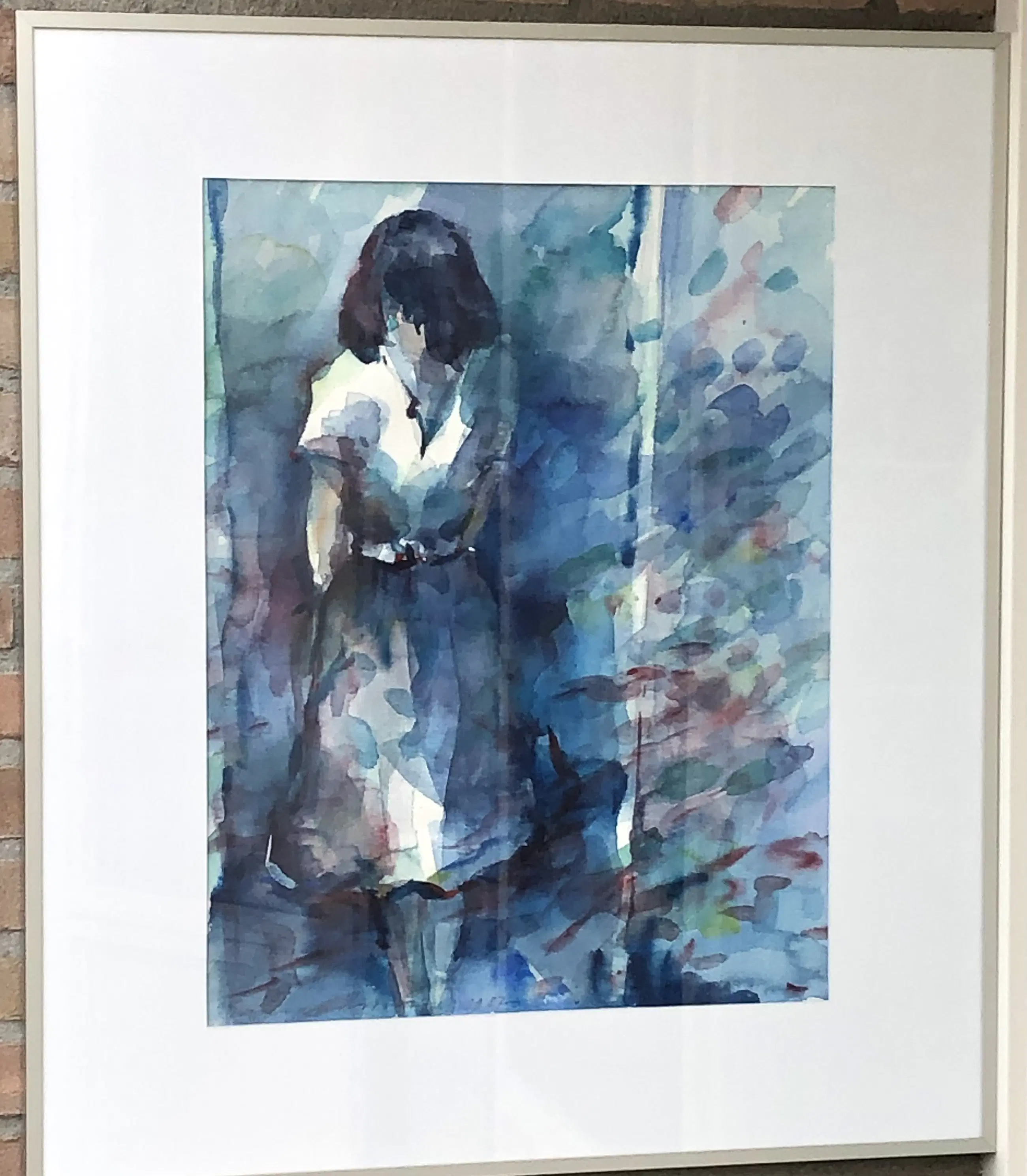 Staande vrouw tussen struiken in aquarelverf en oliekrijt - professioneel ingelijst met passe-partout