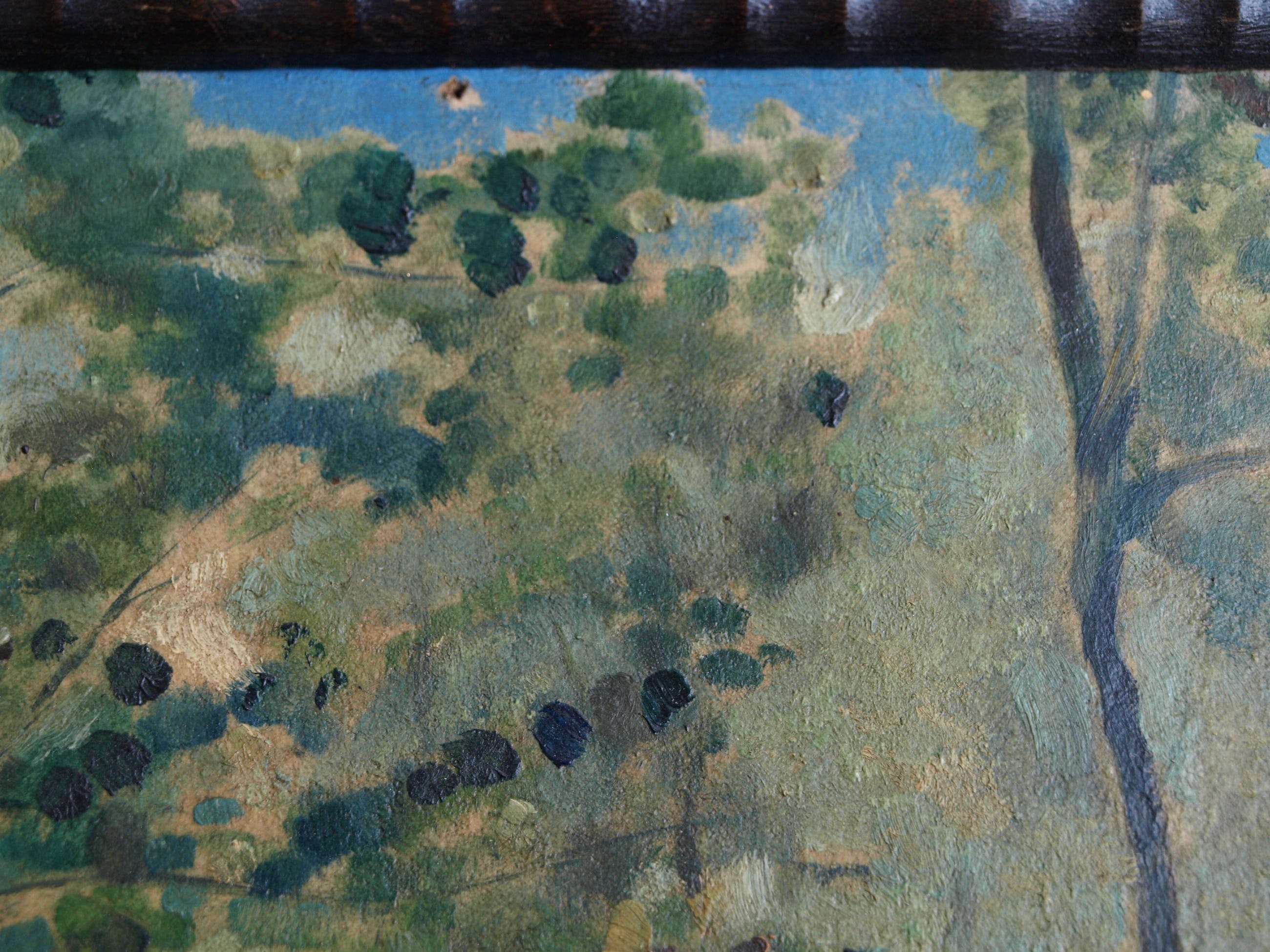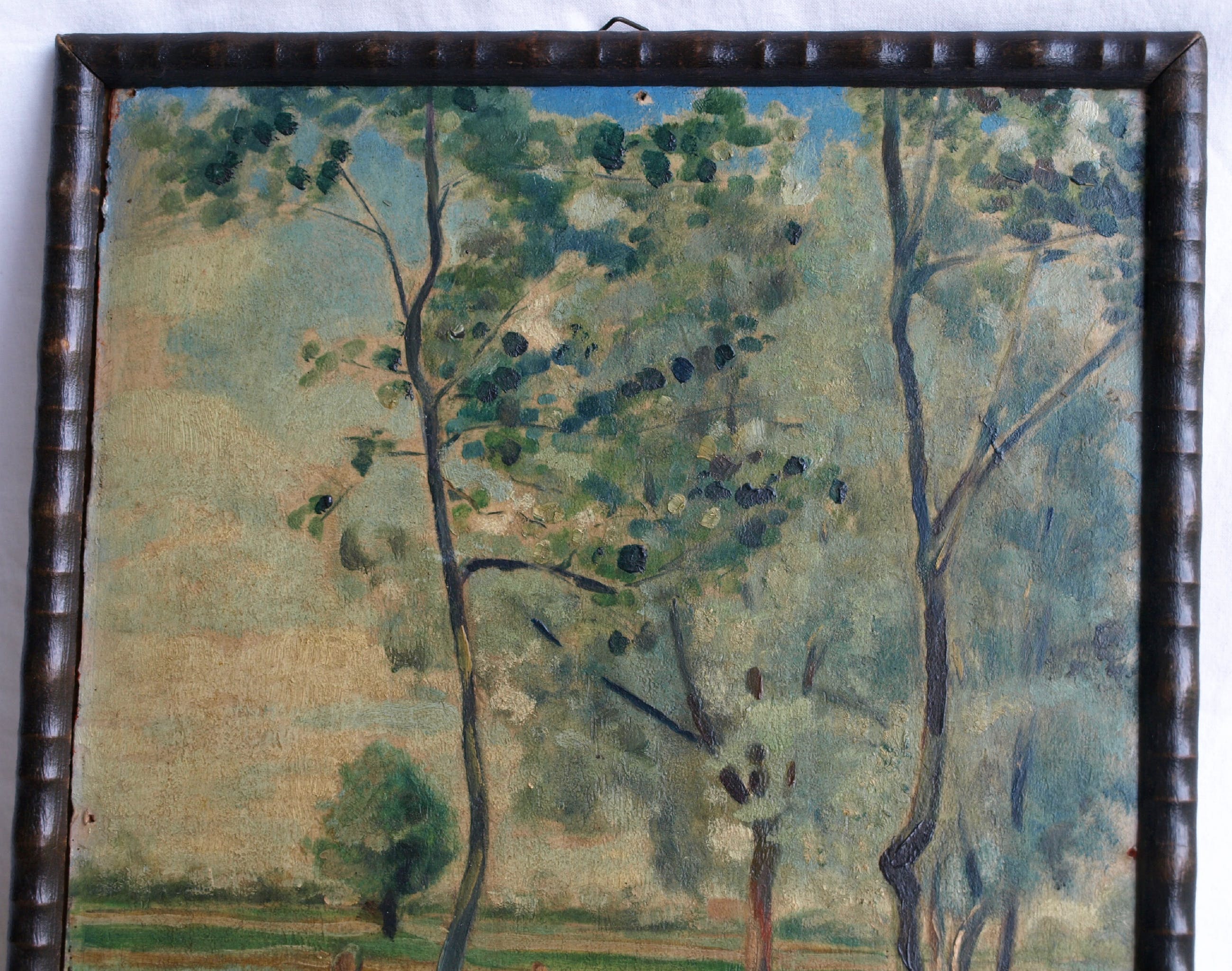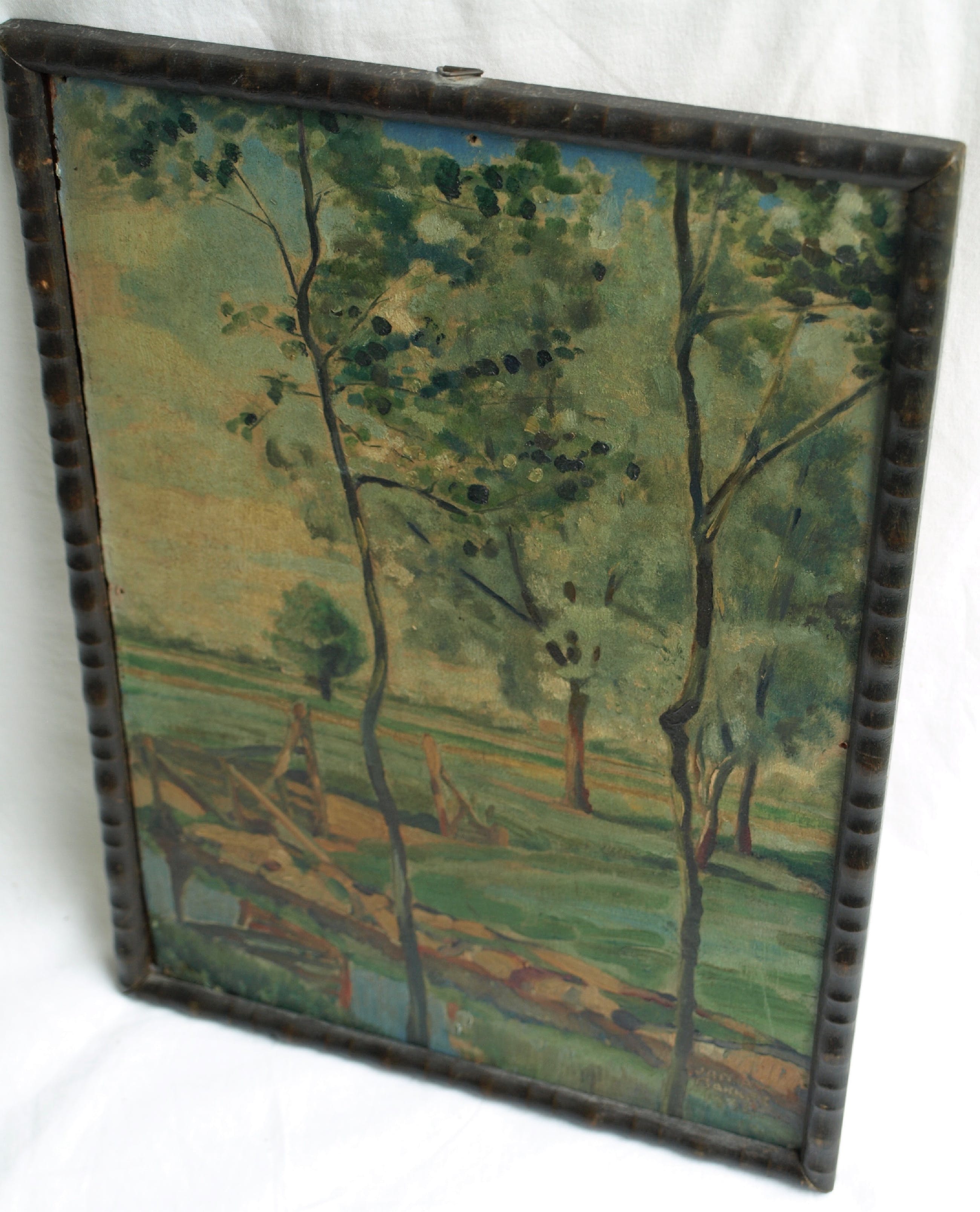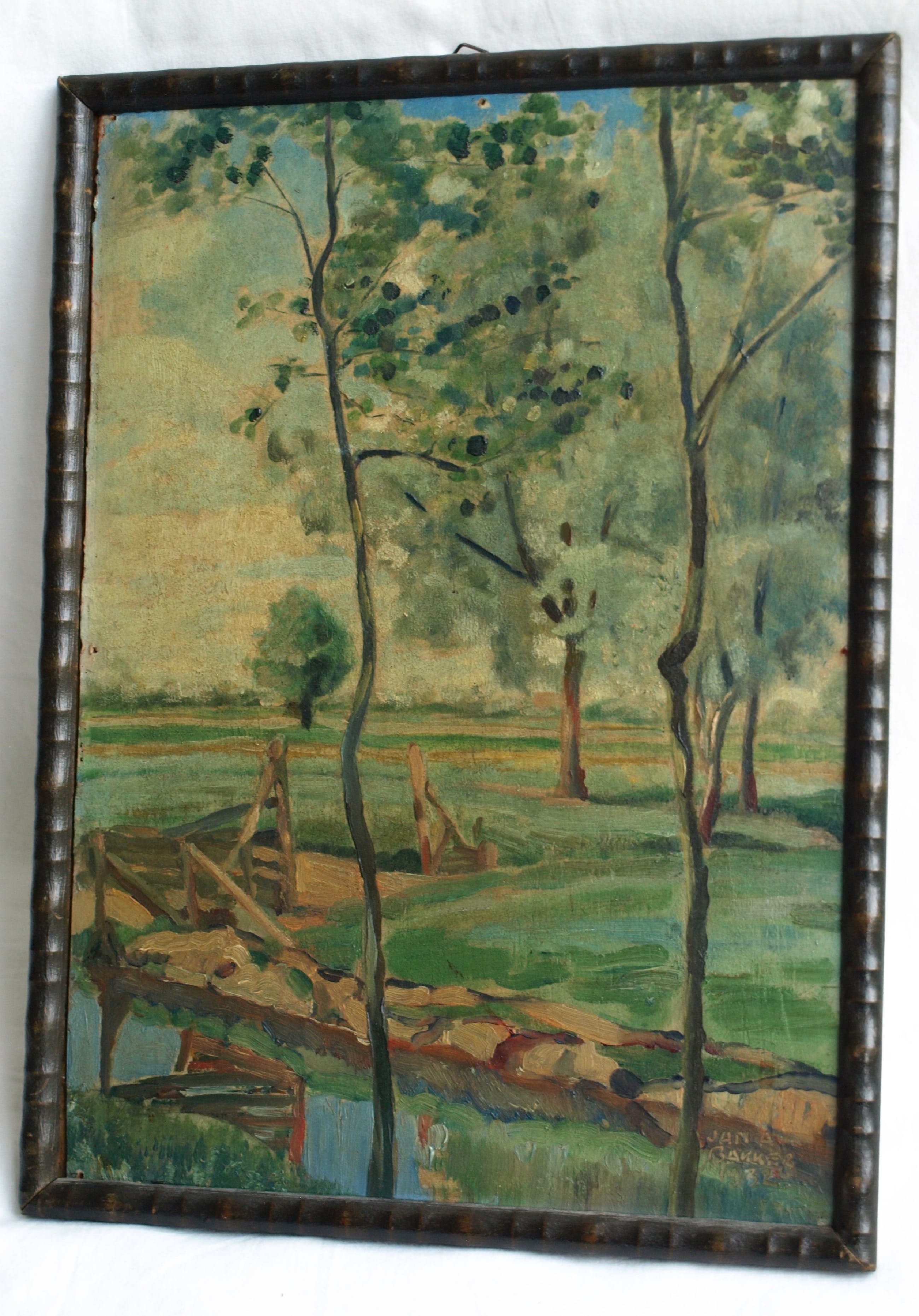 -Olieverf op schilderskarton en ingelijst in de originele houten lijst.