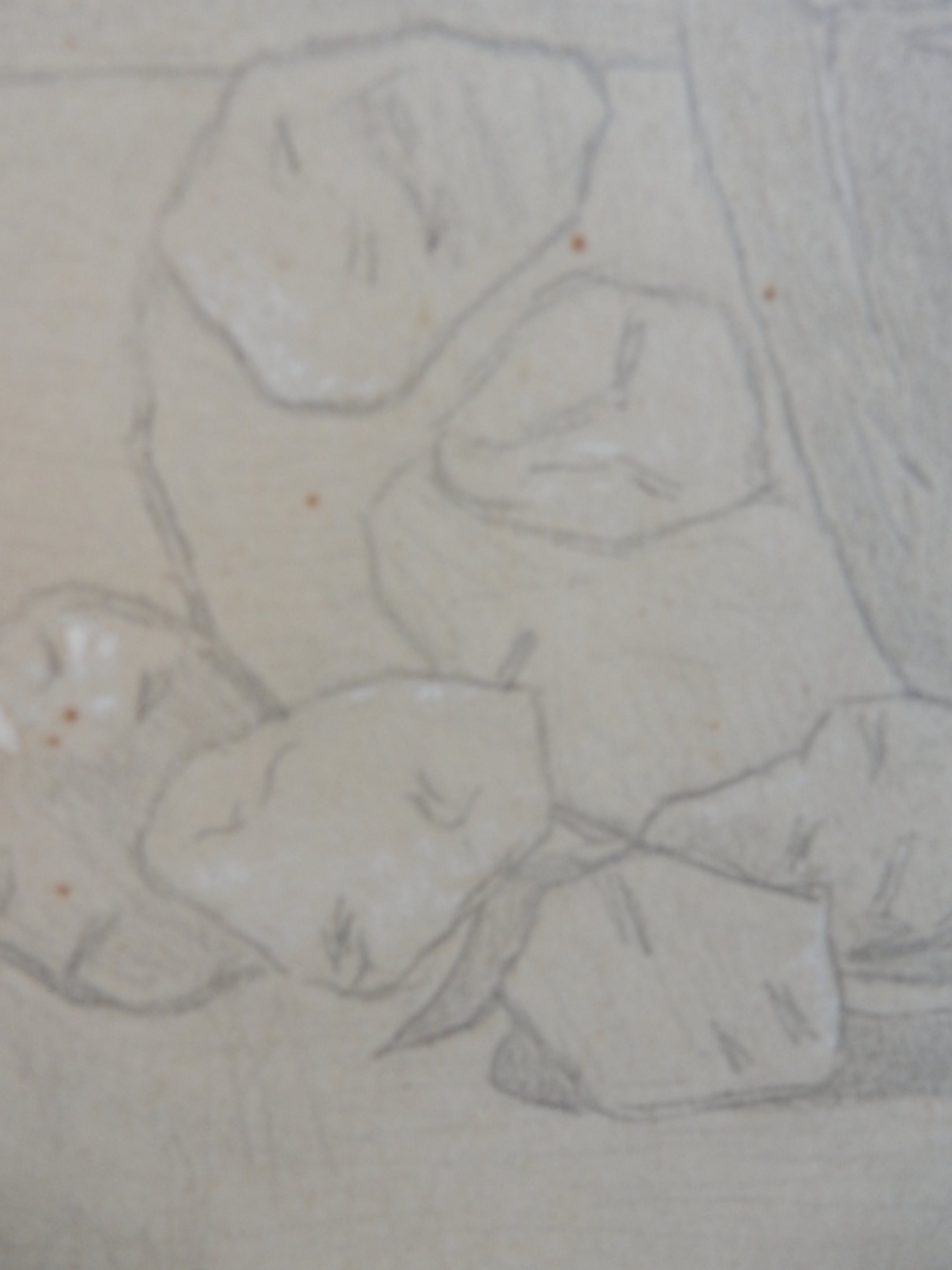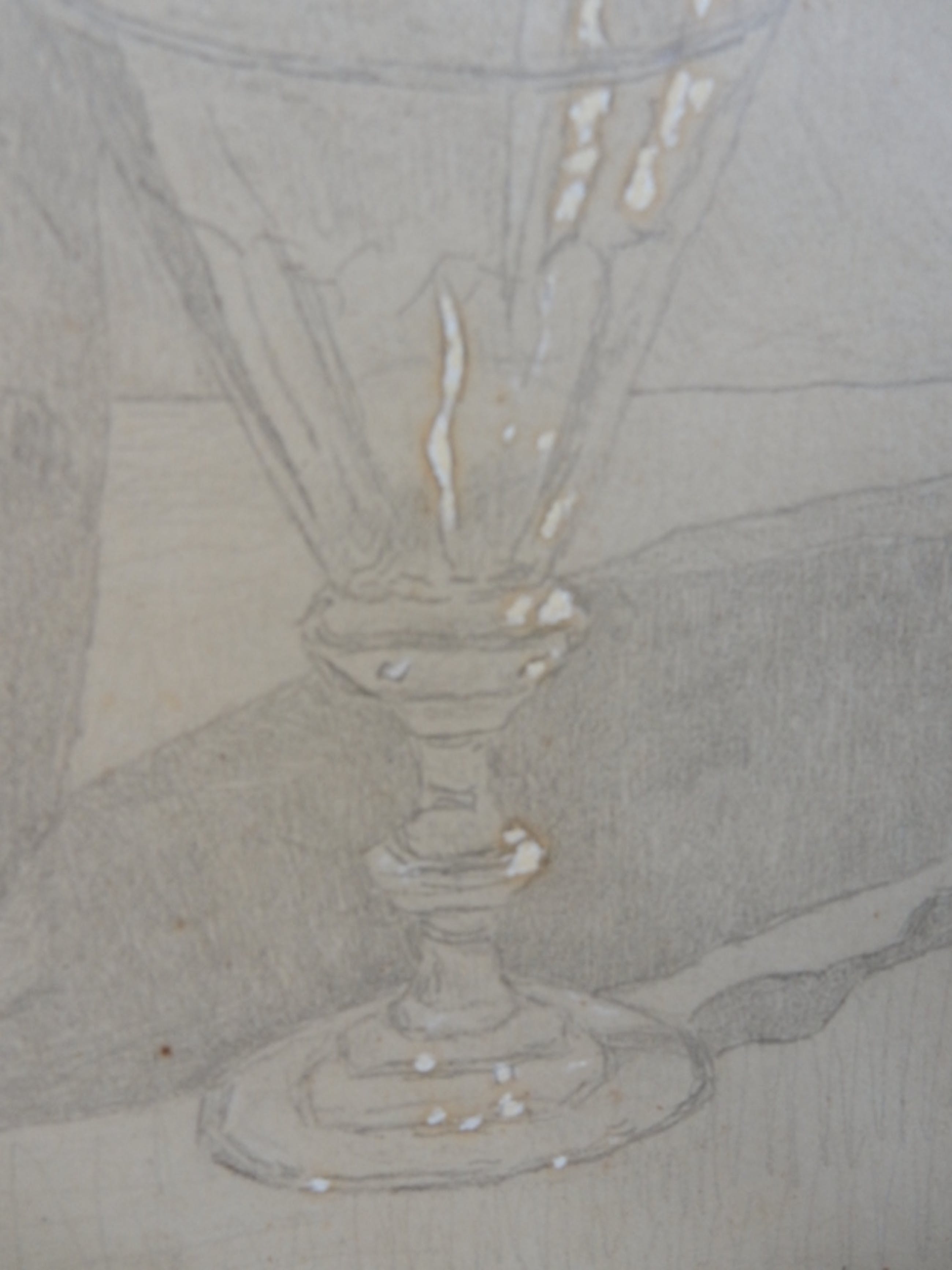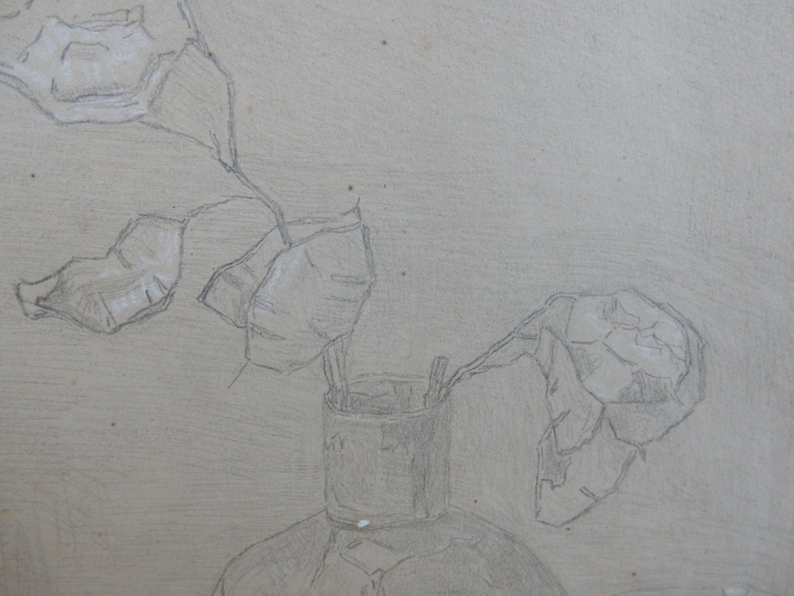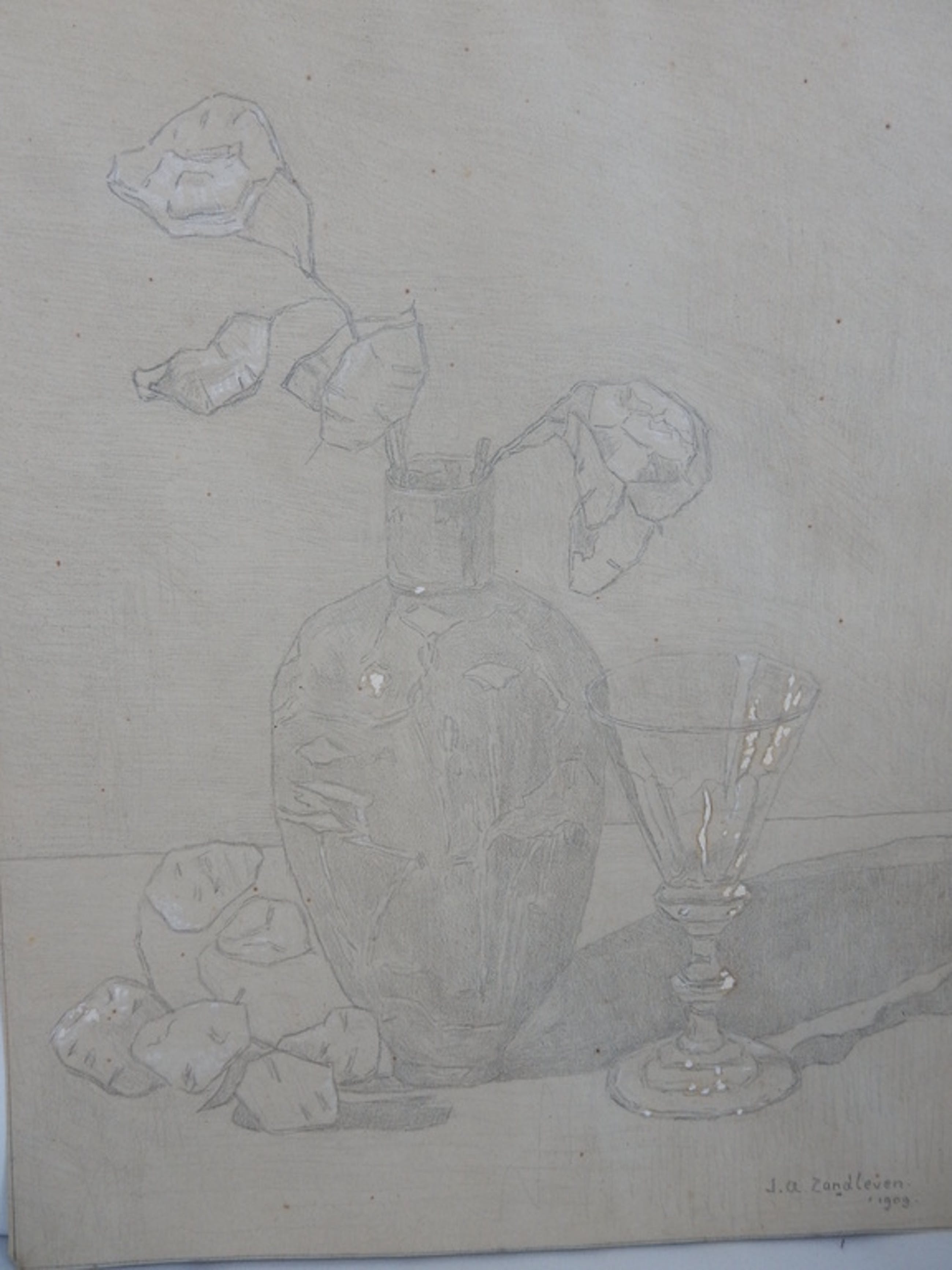 Dit werk: stilleven, tekening op papier, 1909, l.o. gesigneerd, afm. 25x31 / vaas + bloemen met drinkglas, incl. zilverkleurige kunststof lijst met glas, 30x40